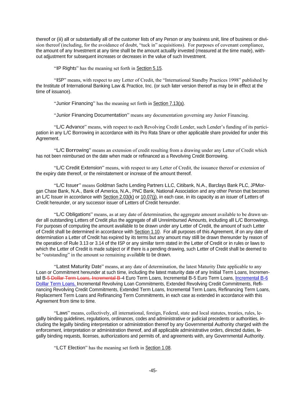 -45- thereof or (ii) all or substantially all of the customer lists of any Person or any business unit, line of business or divi- sion thereof (including, for the avoidance of doubt, “tuck in” acquisitions). For purposes of covenant compliance, the amount of any Investment at any time shall be the amount actually invested (measured at the time made), with- out adjustment for subsequent increases or decreases in the value of such Investment. “IP Rights” has the meaning set forth in Section 5.15. “ISP” means, with respect to any Letter of Credit, the “International Standby Practices 1998” published by the Institute of International Banking Law & Practice, Inc. (or such later version thereof as may be in effect at the time of issuance). “Junior Financing” has the meaning set forth in Section 7.13(a). “Junior Financing Documentation” means any documentation governing any Junior Financing. “L/C Advance” means, with respect to each Revolving Credit Lender, such Lender’s funding of its partici- pation in any L/C Borrowing in accordance with its Pro Rata Share or other applicable share provided for under this Agreement. “L/C Borrowing” means an extension of credit resulting from a drawing under any Letter of Credit which has not been reimbursed on the date when made or refinanced as a Revolving Credit Borrowing. “L/C Credit Extension” means, with respect to any Letter of Credit, the issuance thereof or extension of the expiry date thereof, or the reinstatement or increase of the amount thereof. “L/C Issuer” means Goldman Sachs Lending Partners LLC, Citibank, N.A., Barclays Bank PLC, JPMor- gan Chase Bank, N.A., Bank of America, N.A., PNC Bank, National Association and any other Person that becomes an L/C Issuer in accordance with Section 2.03(k) or 10.07(j), in each case, in its capacity as an issuer of Letters of Credit hereunder, or any successor issuer of Letters of Credit hereunder. “L/C Obligations” means, as at any date of determination, the aggregate amount available to be drawn un- der all outstanding Letters of Credit plus the aggregate of all Unreimbursed Amounts, including all L/C Borrowings. For purposes of computing the amount available to be drawn under any Letter of Credit, the amount of such Letter of Credit shall be determined in accordance with Section 1.10. For all purposes of this Agreement, if on any date of determination a Letter of Credit has expired by its terms but any amount may still be drawn thereunder by reason of the operation of Rule 3.13 or 3.14 of the ISP or any similar term stated in the Letter of Credit or in rules or laws to which the Letter of Credit is made subject or if there is a pending drawing, such Letter of Credit shall be deemed to be “outstanding” in the amount so remaining available to be drawn. “Latest Maturity Date” means, at any date of determination, the latest Maturity Date applicable to any Loan or Commitment hereunder at such time, including the latest maturity date of any Initial Term Loans, Incremen- tal B-5 Dollar Term Loans, Incremental B-4 Euro Term Loans, Incremental B-5 Euro Term Loans, Incremental B-6 Dollar Term Loans, Incremental Revolving Loan Commitments, Extended Revolving Credit Commitments, Refi- nancing Revolving Credit Commitments, Extended Term Loans, Incremental Term Loans, Refinancing Term Loans, Replacement Term Loans and Refinancing Term Commitments, in each case as extended in accordance with this Agreement from time to time. “Laws” means, collectively, all international, foreign, Federal, state and local statutes, treaties, rules, le- gally binding guidelines, regulations, ordinances, codes and administrative or judicial precedents or authorities, in- cluding the legally binding interpretation or administration thereof by any Governmental Authority charged with the enforcement, interpretation or administration thereof, and all applicable administrative orders, directed duties, le- gally binding requests, licenses, authorizations and permits of, and agreements with, any Governmental Authority. “LCT Election” has the meaning set forth in Section 1.08.
