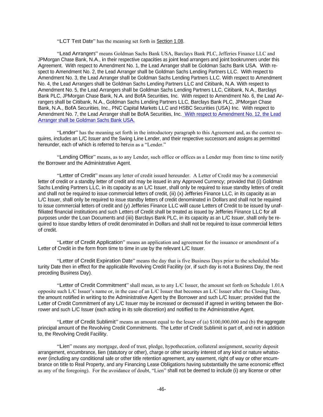 -46- “LCT Test Date” has the meaning set forth in Section 1.08. “Lead Arrangers” means Goldman Sachs Bank USA, Barclays Bank PLC, Jefferies Finance LLC and JPMorgan Chase Bank, N.A., in their respective capacities as joint lead arrangers and joint bookrunners under this Agreement. With respect to Amendment No. 1, the Lead Arranger shall be Goldman Sachs Bank USA. With re- spect to Amendment No. 2, the Lead Arranger shall be Goldman Sachs Lending Partners LLC. With respect to Amendment No. 3, the Lead Arranger shall be Goldman Sachs Lending Partners LLC. With respect to Amendment No. 4, the Lead Arrangers shall be Goldman Sachs Lending Partners LLC and Citibank, N.A. With respect to Amendment No. 5, the Lead Arrangers shall be Goldman Sachs Lending Partners LLC, Citibank, N.A., Barclays Bank PLC, JPMorgan Chase Bank, N.A. and BofA Securities, Inc. With respect to Amendment No. 6, the Lead Ar- rangers shall be Citibank, N.A., Goldman Sachs Lending Partners LLC, Barclays Bank PLC, JPMorgan Chase Bank, N.A., BofA Securities, Inc., PNC Capital Markets LLC and HSBC Securities (USA) Inc. With respect to Amendment No. 7, the Lead Arranger shall be BofA Securities, Inc. With respect to Amendment No. 12, the Lead Arranger shall be Goldman Sachs Bank USA. “Lender” has the meaning set forth in the introductory paragraph to this Agreement and, as the context re- quires, includes an L/C Issuer and the Swing Line Lender, and their respective successors and assigns as permitted hereunder, each of which is referred to herein as a “Lender.” “Lending Office” means, as to any Lender, such office or offices as a Lender may from time to time notify the Borrower and the Administrative Agent. “Letter of Credit” means any letter of credit issued hereunder. A Letter of Credit may be a commercial letter of credit or a standby letter of credit and may be issued in any Approved Currency; provided that (i) Goldman Sachs Lending Partners LLC, in its capacity as an L/C Issuer, shall only be required to issue standby letters of credit and shall not be required to issue commercial letters of credit, (ii) (x) Jefferies Finance LLC, in its capacity as an L/C Issuer, shall only be required to issue standby letters of credit denominated in Dollars and shall not be required to issue commercial letters of credit and (y) Jefferies Finance LLC will cause Letters of Credit to be issued by unaf- filiated financial institutions and such Letters of Credit shall be treated as issued by Jefferies Finance LLC for all purposes under the Loan Documents and (iii) Barclays Bank PLC, in its capacity as an L/C Issuer, shall only be re- quired to issue standby letters of credit denominated in Dollars and shall not be required to issue commercial letters of credit. “Letter of Credit Application” means an application and agreement for the issuance or amendment of a Letter of Credit in the form from time to time in use by the relevant L/C Issuer. “Letter of Credit Expiration Date” means the day that is five Business Days prior to the scheduled Ma- turity Date then in effect for the applicable Revolving Credit Facility (or, if such day is not a Business Day, the next preceding Business Day). “Letter of Credit Commitment” shall mean, as to any L/C Issuer, the amount set forth on Schedule 1.01A opposite such L/C Issuer’s name or, in the case of an L/C Issuer that becomes an L/C Issuer after the Closing Date, the amount notified in writing to the Administrative Agent by the Borrower and such L/C Issuer; provided that the Letter of Credit Commitment of any L/C Issuer may be increased or decreased if agreed in writing between the Bor- rower and such L/C Issuer (each acting in its sole discretion) and notified to the Administrative Agent. “Letter of Credit Sublimit” means an amount equal to the lesser of (a) $100,000,000 and (b) the aggregate principal amount of the Revolving Credit Commitments. The Letter of Credit Sublimit is part of, and not in addition to, the Revolving Credit Facility. “Lien” means any mortgage, deed of trust, pledge, hypothecation, collateral assignment, security deposit arrangement, encumbrance, lien (statutory or other), charge or other security interest of any kind or nature whatso- ever (including any conditional sale or other title retention agreement, any easement, right of way or other encum- brance on title to Real Property, and any Financing Lease Obligations having substantially the same economic effect as any of the foregoing). For the avoidance of doubt, “Lien” shall not be deemed to include (i) any license or other