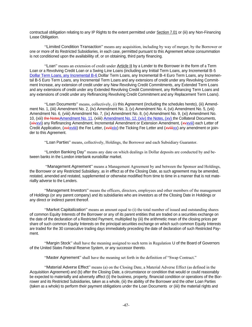 -47- contractual obligation relating to any IP Rights to the extent permitted under Section 7.01 or (ii) any Non-Financing Lease Obligation. “Limited Condition Transaction” means any acquisition, including by way of merger, by the Borrower or one or more of its Restricted Subsidiaries, in each case, permitted pursuant to this Agreement whose consummation is not conditioned upon the availability of, or on obtaining, third party financing. “Loan” means an extension of credit under Article II by a Lender to the Borrower in the form of a Term Loan or a Revolving Credit Loan or a Swing Line Loans (including any Initial Term Loans, any Incremental B-5 Dollar Term Loans, any Incremental B-6 Dollar Term Loans, any Incremental B-4 Euro Term Loans, any Incremen- tal B-5 Euro Term Loans, any Incremental Term Loans and any extensions of credit under any Revolving Commit- ment Increase, any extension of credit under any New Revolving Credit Commitments, any Extended Term Loans and any extensions of credit under any Extended Revolving Credit Commitment, any Refinancing Term Loans and any extensions of credit under any Refinancing Revolving Credit Commitment and any Replacement Term Loans). “Loan Documents” means, collectively, (i) this Agreement (including the schedules hereto), (ii) Amend- ment No. 1, (iii) Amendment No. 2, (iv) Amendment No. 3, (v) Amendment No. 4, (vi) Amendment No. 5, (vii) Amendment No. 6, (viii) Amendment No. 7, (ix) Amendment No. 8, (x) Amendment No. 9, (xi) Amendment No. 10, (xii) the NotesAmendment No. 11, (xiii) Amendment No. 12, (xiv) the Notes, (xv) the Collateral Documents, (xivxvi) any Refinancing Amendment, Incremental Amendment or Extension Amendment, (xvxvii) each Letter of Credit Application, (xvixviii) the Fee Letter, (xviixix) the Ticking Fee Letter and (xviiixx) any amendment or join- der to this Agreement. “Loan Parties” means, collectively, Holdings, the Borrower and each Subsidiary Guarantor. “London Banking Day” means any date on which dealings in Dollar deposits are conducted by and be- tween banks in the London interbank eurodollar market. “Management Agreement” means a Management Agreement by and between the Sponsor and Holdings, the Borrower or any Restricted Subsidiary, as in effect as of the Closing Date, as such agreement may be amended, restated, amended and restated, supplemented or otherwise modified from time to time in a manner that is not mate- rially adverse to the Lenders. “Management Investors” means the officers, directors, employees and other members of the management of Holdings (or any parent company) and its subsidiaries who are investors as of the Closing Date in Holdings or any direct or indirect parent thereof. “Market Capitalization” means an amount equal to (i) the total number of issued and outstanding shares of common Equity Interests of the Borrower or any of its parent entities that are traded on a securities exchange on the date of the declaration of a Restricted Payment, multiplied by (ii) the arithmetic mean of the closing prices per share of such common Equity Interests on the principal securities exchange on which such common Equity Interests are traded for the 30 consecutive trading days immediately preceding the date of declaration of such Restricted Pay- ment. “Margin Stock” shall have the meaning assigned to such term in Regulation U of the Board of Governors of the United States Federal Reserve System, or any successor thereto. “Master Agreement” shall have the meaning set forth in the definition of “Swap Contract.” “Material Adverse Effect” means (a) on the Closing Date, a Material Adverse Effect (as defined in the Acquisition Agreement) and (b) after the Closing Date, a circumstance or condition that would or could reasonably be expected to materially and adversely affect (i) the business, property, financial condition or operations of the Bor- rower and its Restricted Subsidiaries, taken as a whole, (ii) the ability of the Borrower and the other Loan Parties (taken as a whole) to perform their payment obligations under the Loan Documents or (iii) the material rights and