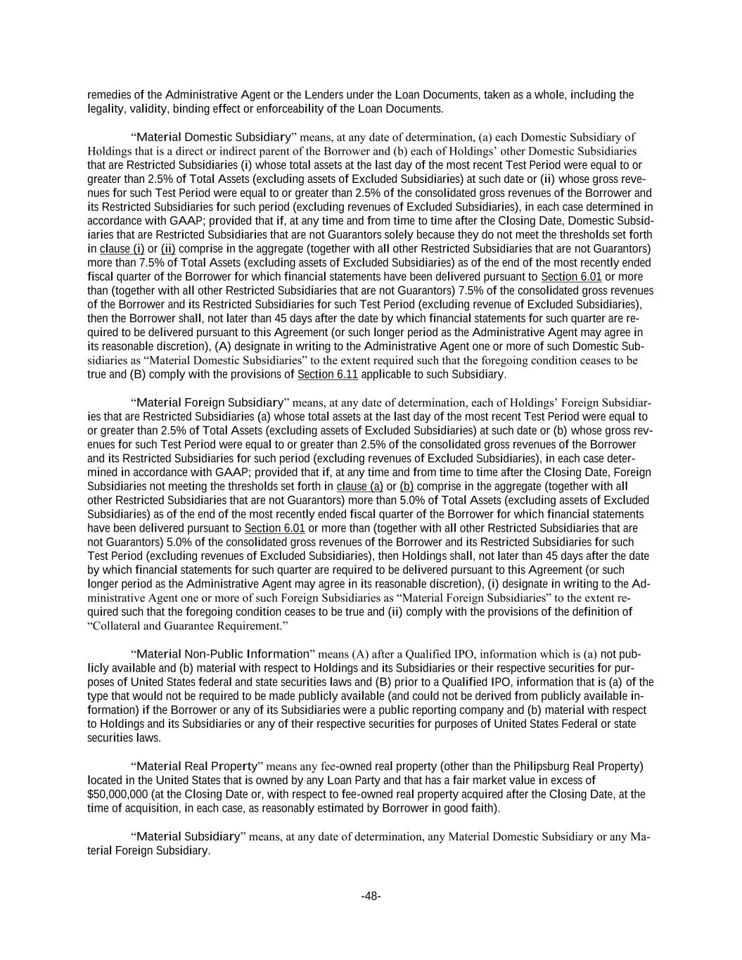 -48- remedies of the Administrative Agent or the Lenders under the Loan Documents, taken as a whole, including the legality, validity, binding effect or enforceability of the Loan Documents. “Material Domestic Subsidiary” means, at any date of determination, (a) each Domestic Subsidiary of Holdings that is a direct or indirect parent of the Borrower and (b) each of Holdings’ other Domestic Subsidiaries that are Restricted Subsidiaries (i) whose total assets at the last day of the most recent Test Period were equal to or greater than 2.5% of Total Assets (excluding assets of Excluded Subsidiaries) at such date or (ii) whose gross reve- nues for such Test Period were equal to or greater than 2.5% of the consolidated gross revenues of the Borrower and its Restricted Subsidiaries for such period (excluding revenues of Excluded Subsidiaries), in each case determined in accordance with GAAP; provided that if, at any time and from time to time after the Closing Date, Domestic Subsid- iaries that are Restricted Subsidiaries that are not Guarantors solely because they do not meet the thresholds set forth in clause (i) or (ii) comprise in the aggregate (together with all other Restricted Subsidiaries that are not Guarantors) more than 7.5% of Total Assets (excluding assets of Excluded Subsidiaries) as of the end of the most recently ended fiscal quarter of the Borrower for which financial statements have been delivered pursuant to Section 6.01 or more than (together with all other Restricted Subsidiaries that are not Guarantors) 7.5% of the consolidated gross revenues of the Borrower and its Restricted Subsidiaries for such Test Period (excluding revenue of Excluded Subsidiaries), then the Borrower shall, not later than 45 days after the date by which financial statements for such quarter are re- quired to be delivered pursuant to this Agreement (or such longer period as the Administrative Agent may agree in its reasonable discretion), (A) designate in writing to the Administrative Agent one or more of such Domestic Sub- sidiaries as “Material Domestic Subsidiaries” to the extent required such that the foregoing condition ceases to be true and (B) comply with the provisions of Section 6.11 applicable to such Subsidiary. “Material Foreign Subsidiary” means, at any date of determination, each of Holdings’ Foreign Subsidiar- ies that are Restricted Subsidiaries (a) whose total assets at the last day of the most recent Test Period were equal to or greater than 2.5% of Total Assets (excluding assets of Excluded Subsidiaries) at such date or (b) whose gross rev- enues for such Test Period were equal to or greater than 2.5% of the consolidated gross revenues of the Borrower and its Restricted Subsidiaries for such period (excluding revenues of Excluded Subsidiaries), in each case deter- mined in accordance with GAAP; provided that if, at any time and from time to time after the Closing Date, Foreign Subsidiaries not meeting the thresholds set forth in clause (a) or (b) comprise in the aggregate (together with all other Restricted Subsidiaries that are not Guarantors) more than 5.0% of Total Assets (excluding assets of Excluded Subsidiaries) as of the end of the most recently ended fiscal quarter of the Borrower for which financial statements have been delivered pursuant to Section 6.01 or more than (together with all other Restricted Subsidiaries that are not Guarantors) 5.0% of the consolidated gross revenues of the Borrower and its Restricted Subsidiaries for such Test Period (excluding revenues of Excluded Subsidiaries), then Holdings shall, not later than 45 days after the date by which financial statements for such quarter are required to be delivered pursuant to this Agreement (or such longer period as the Administrative Agent may agree in its reasonable discretion), (i) designate in writing to the Ad- ministrative Agent one or more of such Foreign Subsidiaries as “Material Foreign Subsidiaries” to the extent re- quired such that the foregoing condition ceases to be true and (ii) comply with the provisions of the definition of “Collateral and Guarantee Requirement.” “Material Non-Public Information” means (A) after a Qualified IPO, information which is (a) not pub- licly available and (b) material with respect to Holdings and its Subsidiaries or their respective securities for pur- poses of United States federal and state securities laws and (B) prior to a Qualified IPO, information that is (a) of the type that would not be required to be made publicly available (and could not be derived from publicly available in- formation) if the Borrower or any of its Subsidiaries were a public reporting company and (b) material with respect to Holdings and its Subsidiaries or any of their respective securities for purposes of United States Federal or state securities laws. “Material Real Property” means any fee-owned real property (other than the Philipsburg Real Property) located in the United States that is owned by any Loan Party and that has a fair market value in excess of $50,000,000 (at the Closing Date or, with respect to fee-owned real property acquired after the Closing Date, at the time of acquisition, in each case, as reasonably estimated by Borrower in good faith). “Material Subsidiary” means, at any date of determination, any Material Domestic Subsidiary or any Ma- terial Foreign Subsidiary.