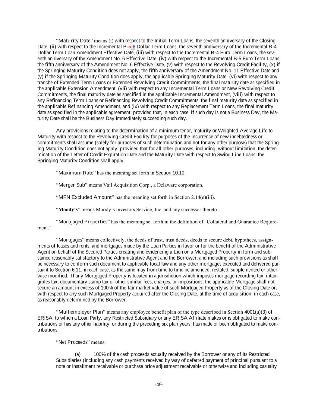 -49- “Maturity Date” means (i) with respect to the Initial Term Loans, the seventh anniversary of the Closing Date, (ii) with respect to the Incremental B-5-6 Dollar Term Loans, the seventh anniversary of the Incremental B-4 Dollar Term Loan Amendment Effective Date, (iii) with respect to the Incremental B-4 Euro Term Loans, the sev- enth anniversary of the Amendment No. 6 Effective Date, (iv) with respect to the Incremental B-5 Euro Term Loans, the fifth anniversary of the Amendment No. 6 Effective Date, (v) with respect to the Revolving Credit Facility, (x) if the Springing Maturity Condition does not apply, the fifth anniversary of the Amendment No. 11 Effective Date and (y) if the Springing Maturity Condition does apply, the applicable Springing Maturity Date, (vi) with respect to any tranche of Extended Term Loans or Extended Revolving Credit Commitments, the final maturity date as specified in the applicable Extension Amendment, (vii) with respect to any Incremental Term Loans or New Revolving Credit Commitments, the final maturity date as specified in the applicable Incremental Amendment, (viii) with respect to any Refinancing Term Loans or Refinancing Revolving Credit Commitments, the final maturity date as specified in the applicable Refinancing Amendment, and (ix) with respect to any Replacement Term Loans, the final maturity date as specified in the applicable agreement; provided that, in each case, if such day is not a Business Day, the Ma- turity Date shall be the Business Day immediately succeeding such day. Any provisions relating to the determination of a minimum tenor, maturity or Weighted Average Life to Maturity with respect to the Revolving Credit Facility for purposes of the incurrence of new indebtedness or commitments shall assume (solely for purposes of such determination and not for any other purpose) that the Spring- ing Maturity Condition does not apply; provided that for all other purposes, including, without limitation, the deter- mination of the Letter of Credit Expiration Date and the Maturity Date with respect to Swing Line Loans, the Springing Maturity Condition shall apply. “Maximum Rate” has the meaning set forth in Section 10.10. “Merger Sub” means Vail Acquisition Corp., a Delaware corporation. “MFN Excluded Amount” has the meaning set forth in Section 2.14(e)(iii). “Moody’s” means Moody’s Investors Service, Inc. and any successor thereto. “Mortgaged Properties” has the meaning set forth in the definition of “Collateral and Guarantee Require- ment.” “Mortgages” means collectively, the deeds of trust, trust deeds, deeds to secure debt, hypothecs, assign- ments of leases and rents, and mortgages made by the Loan Parties in favor or for the benefit of the Administrative Agent on behalf of the Secured Parties creating and evidencing a Lien on a Mortgaged Property in form and sub- stance reasonably satisfactory to the Administrative Agent and the Borrower, and including such provisions as shall be necessary to conform such document to applicable local law and any other mortgages executed and delivered pur- suant to Section 6.11, in each case, as the same may from time to time be amended, restated, supplemented or other- wise modified. If any Mortgaged Property is located in a jurisdiction which imposes mortgage recording tax, intan- gibles tax, documentary stamp tax or other similar fees, charges, or impositions, the applicable Mortgage shall not secure an amount in excess of 100% of the fair market value of such Mortgaged Property as of the Closing Date or, with respect to any such Mortgaged Property acquired after the Closing Date, at the time of acquisition, in each case, as reasonably determined by the Borrower. “Multiemployer Plan” means any employee benefit plan of the type described in Section 4001(a)(3) of ERISA, to which a Loan Party, any Restricted Subsidiary or any ERISA Affiliate makes or is obligated to make con- tributions or has any other liability, or during the preceding six plan years, has made or been obligated to make con- tributions. “Net Proceeds” means: (a) 100% of the cash proceeds actually received by the Borrower or any of its Restricted Subsidiaries (including any cash payments received by way of deferred payment of principal pursuant to a note or installment receivable or purchase price adjustment receivable or otherwise and including casualty