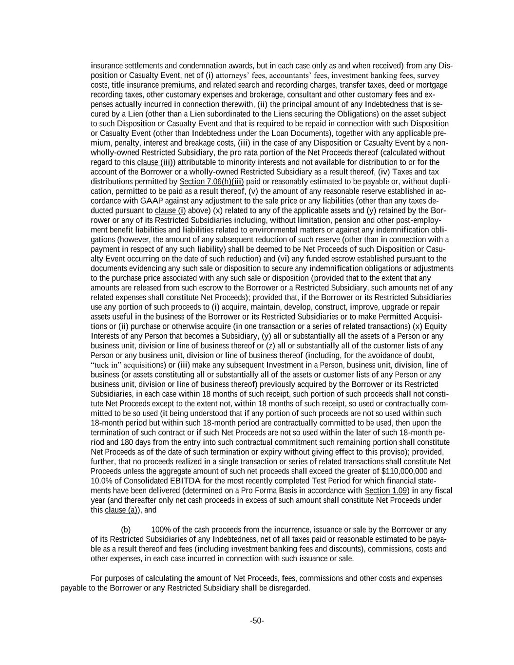 -50- insurance settlements and condemnation awards, but in each case only as and when received) from any Dis- position or Casualty Event, net of (i) attorneys’ fees, accountants’ fees, investment banking fees, survey costs, title insurance premiums, and related search and recording charges, transfer taxes, deed or mortgage recording taxes, other customary expenses and brokerage, consultant and other customary fees and ex- penses actually incurred in connection therewith, (ii) the principal amount of any Indebtedness that is se- cured by a Lien (other than a Lien subordinated to the Liens securing the Obligations) on the asset subject to such Disposition or Casualty Event and that is required to be repaid in connection with such Disposition or Casualty Event (other than Indebtedness under the Loan Documents), together with any applicable pre- mium, penalty, interest and breakage costs, (iii) in the case of any Disposition or Casualty Event by a non- wholly-owned Restricted Subsidiary, the pro rata portion of the Net Proceeds thereof (calculated without regard to this clause (iii)) attributable to minority interests and not available for distribution to or for the account of the Borrower or a wholly-owned Restricted Subsidiary as a result thereof, (iv) Taxes and tax distributions permitted by Section 7.06(h)(iii) paid or reasonably estimated to be payable or, without dupli- cation, permitted to be paid as a result thereof, (v) the amount of any reasonable reserve established in ac- cordance with GAAP against any adjustment to the sale price or any liabilities (other than any taxes de- ducted pursuant to clause (i) above) (x) related to any of the applicable assets and (y) retained by the Bor- rower or any of its Restricted Subsidiaries including, without limitation, pension and other post-employ- ment benefit liabilities and liabilities related to environmental matters or against any indemnification obli- gations (however, the amount of any subsequent reduction of such reserve (other than in connection with a payment in respect of any such liability) shall be deemed to be Net Proceeds of such Disposition or Casu- alty Event occurring on the date of such reduction) and (vi) any funded escrow established pursuant to the documents evidencing any such sale or disposition to secure any indemnification obligations or adjustments to the purchase price associated with any such sale or disposition (provided that to the extent that any amounts are released from such escrow to the Borrower or a Restricted Subsidiary, such amounts net of any related expenses shall constitute Net Proceeds); provided that, if the Borrower or its Restricted Subsidiaries use any portion of such proceeds to (i) acquire, maintain, develop, construct, improve, upgrade or repair assets useful in the business of the Borrower or its Restricted Subsidiaries or to make Permitted Acquisi- tions or (ii) purchase or otherwise acquire (in one transaction or a series of related transactions) (x) Equity Interests of any Person that becomes a Subsidiary, (y) all or substantially all the assets of a Person or any business unit, division or line of business thereof or (z) all or substantially all of the customer lists of any Person or any business unit, division or line of business thereof (including, for the avoidance of doubt, “tuck in” acquisitions) or (iii) make any subsequent Investment in a Person, business unit, division, line of business (or assets constituting all or substantially all of the assets or customer lists of any Person or any business unit, division or line of business thereof) previously acquired by the Borrower or its Restricted Subsidiaries, in each case within 18 months of such receipt, such portion of such proceeds shall not consti- tute Net Proceeds except to the extent not, within 18 months of such receipt, so used or contractually com- mitted to be so used (it being understood that if any portion of such proceeds are not so used within such 18-month period but within such 18-month period are contractually committed to be used, then upon the termination of such contract or if such Net Proceeds are not so used within the later of such 18-month pe- riod and 180 days from the entry into such contractual commitment such remaining portion shall constitute Net Proceeds as of the date of such termination or expiry without giving effect to this proviso); provided, further, that no proceeds realized in a single transaction or series of related transactions shall constitute Net Proceeds unless the aggregate amount of such net proceeds shall exceed the greater of $110,000,000 and 10.0% of Consolidated EBITDA for the most recently completed Test Period for which financial state- ments have been delivered (determined on a Pro Forma Basis in accordance with Section 1.09) in any fiscal year (and thereafter only net cash proceeds in excess of such amount shall constitute Net Proceeds under this clause (a)), and (b) 100% of the cash proceeds from the incurrence, issuance or sale by the Borrower or any of its Restricted Subsidiaries of any Indebtedness, net of all taxes paid or reasonable estimated to be paya- ble as a result thereof and fees (including investment banking fees and discounts), commissions, costs and other expenses, in each case incurred in connection with such issuance or sale. For purposes of calculating the amount of Net Proceeds, fees, commissions and other costs and expenses payable to the Borrower or any Restricted Subsidiary shall be disregarded.