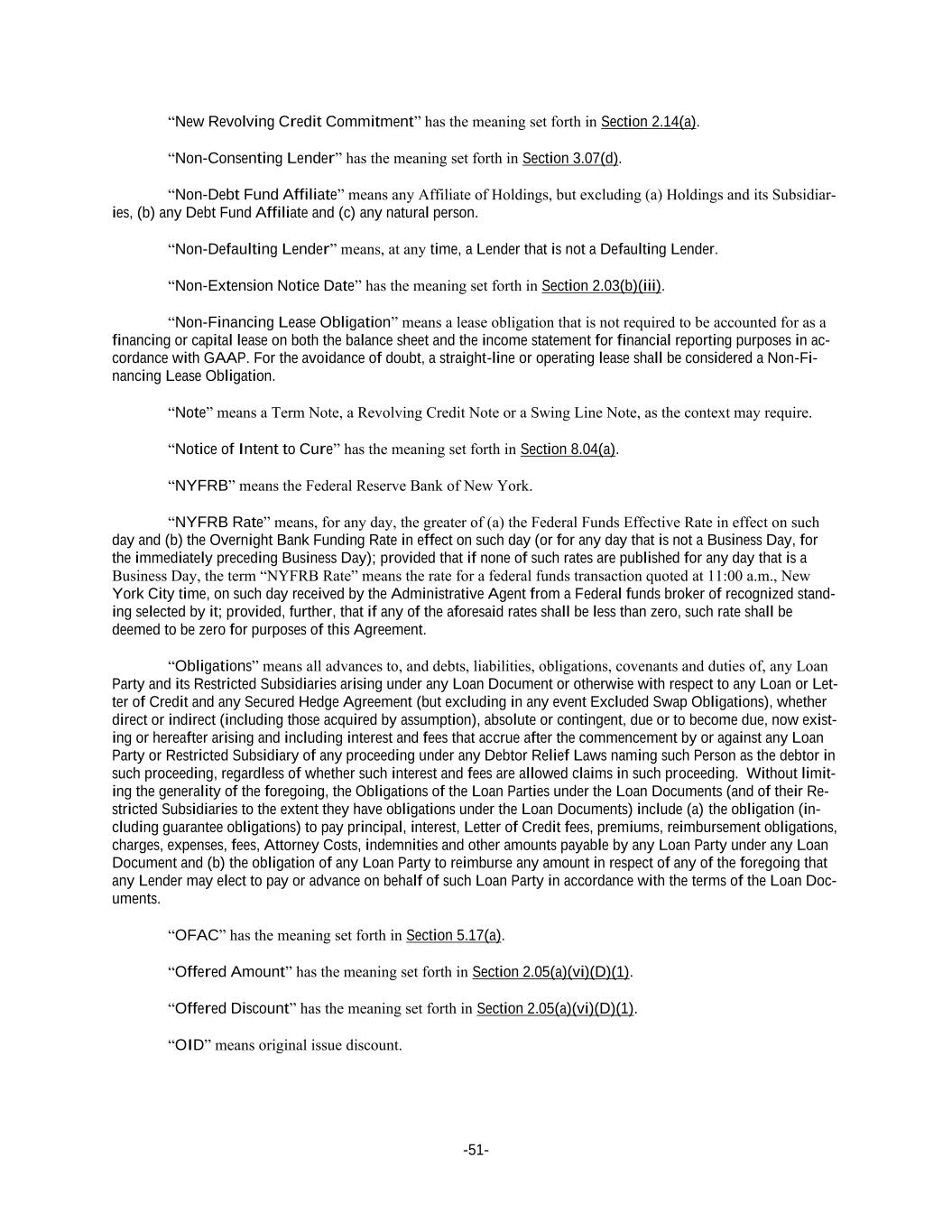 -51- “New Revolving Credit Commitment” has the meaning set forth in Section 2.14(a). “Non-Consenting Lender” has the meaning set forth in Section 3.07(d). “Non-Debt Fund Affiliate” means any Affiliate of Holdings, but excluding (a) Holdings and its Subsidiar- ies, (b) any Debt Fund Affiliate and (c) any natural person. “Non-Defaulting Lender” means, at any time, a Lender that is not a Defaulting Lender. “Non-Extension Notice Date” has the meaning set forth in Section 2.03(b)(iii). “Non-Financing Lease Obligation” means a lease obligation that is not required to be accounted for as a financing or capital lease on both the balance sheet and the income statement for financial reporting purposes in ac- cordance with GAAP. For the avoidance of doubt, a straight-line or operating lease shall be considered a Non-Fi- nancing Lease Obligation. “Note” means a Term Note, a Revolving Credit Note or a Swing Line Note, as the context may require. “Notice of Intent to Cure” has the meaning set forth in Section 8.04(a). “NYFRB” means the Federal Reserve Bank of New York. “NYFRB Rate” means, for any day, the greater of (a) the Federal Funds Effective Rate in effect on such day and (b) the Overnight Bank Funding Rate in effect on such day (or for any day that is not a Business Day, for the immediately preceding Business Day); provided that if none of such rates are published for any day that is a Business Day, the term “NYFRB Rate” means the rate for a federal funds transaction quoted at 11:00 a.m., New York City time, on such day received by the Administrative Agent from a Federal funds broker of recognized stand- ing selected by it; provided, further, that if any of the aforesaid rates shall be less than zero, such rate shall be deemed to be zero for purposes of this Agreement. “Obligations” means all advances to, and debts, liabilities, obligations, covenants and duties of, any Loan Party and its Restricted Subsidiaries arising under any Loan Document or otherwise with respect to any Loan or Let- ter of Credit and any Secured Hedge Agreement (but excluding in any event Excluded Swap Obligations), whether direct or indirect (including those acquired by assumption), absolute or contingent, due or to become due, now exist- ing or hereafter arising and including interest and fees that accrue after the commencement by or against any Loan Party or Restricted Subsidiary of any proceeding under any Debtor Relief Laws naming such Person as the debtor in such proceeding, regardless of whether such interest and fees are allowed claims in such proceeding. Without limit- ing the generality of the foregoing, the Obligations of the Loan Parties under the Loan Documents (and of their Re- stricted Subsidiaries to the extent they have obligations under the Loan Documents) include (a) the obligation (in- cluding guarantee obligations) to pay principal, interest, Letter of Credit fees, premiums, reimbursement obligations, charges, expenses, fees, Attorney Costs, indemnities and other amounts payable by any Loan Party under any Loan Document and (b) the obligation of any Loan Party to reimburse any amount in respect of any of the foregoing that any Lender may elect to pay or advance on behalf of such Loan Party in accordance with the terms of the Loan Doc- uments. “OFAC” has the meaning set forth in Section 5.17(a). “Offered Amount” has the meaning set forth in Section 2.05(a)(vi)(D)(1). “Offered Discount” has the meaning set forth in Section 2.05(a)(vi)(D)(1). “OID” means original issue discount.