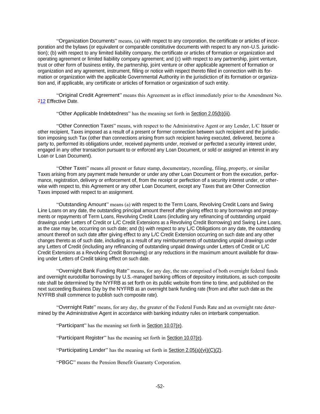 -52- “Organization Documents” means, (a) with respect to any corporation, the certificate or articles of incor- poration and the bylaws (or equivalent or comparable constitutive documents with respect to any non-U.S. jurisdic- tion); (b) with respect to any limited liability company, the certificate or articles of formation or organization and operating agreement or limited liability company agreement; and (c) with respect to any partnership, joint venture, trust or other form of business entity, the partnership, joint venture or other applicable agreement of formation or organization and any agreement, instrument, filing or notice with respect thereto filed in connection with its for- mation or organization with the applicable Governmental Authority in the jurisdiction of its formation or organiza- tion and, if applicable, any certificate or articles of formation or organization of such entity. “Original Credit Agreement” means this Agreement as in effect immediately prior to the Amendment No. 712 Effective Date. “Other Applicable Indebtedness” has the meaning set forth in Section 2.05(b)(ii). “Other Connection Taxes” means, with respect to the Administrative Agent or any Lender, L/C Issuer or other recipient, Taxes imposed as a result of a present or former connection between such recipient and the jurisdic- tion imposing such Tax (other than connections arising from such recipient having executed, delivered, become a party to, performed its obligations under, received payments under, received or perfected a security interest under, engaged in any other transaction pursuant to or enforced any Loan Document, or sold or assigned an interest in any Loan or Loan Document). “Other Taxes” means all present or future stamp, documentary, recording, filing, property, or similar Taxes arising from any payment made hereunder or under any other Loan Document or from the execution, perfor- mance, registration, delivery or enforcement of, from the receipt or perfection of a security interest under, or other- wise with respect to, this Agreement or any other Loan Document, except any Taxes that are Other Connection Taxes imposed with respect to an assignment. “Outstanding Amount” means (a) with respect to the Term Loans, Revolving Credit Loans and Swing Line Loans on any date, the outstanding principal amount thereof after giving effect to any borrowings and prepay- ments or repayments of Term Loans, Revolving Credit Loans (including any refinancing of outstanding unpaid drawings under Letters of Credit or L/C Credit Extensions as a Revolving Credit Borrowing) and Swing Line Loans, as the case may be, occurring on such date; and (b) with respect to any L/C Obligations on any date, the outstanding amount thereof on such date after giving effect to any L/C Credit Extension occurring on such date and any other changes thereto as of such date, including as a result of any reimbursements of outstanding unpaid drawings under any Letters of Credit (including any refinancing of outstanding unpaid drawings under Letters of Credit or L/C Credit Extensions as a Revolving Credit Borrowing) or any reductions in the maximum amount available for draw- ing under Letters of Credit taking effect on such date. “Overnight Bank Funding Rate” means, for any day, the rate comprised of both overnight federal funds and overnight eurodollar borrowings by U.S.-managed banking offices of depository institutions, as such composite rate shall be determined by the NYFRB as set forth on its public website from time to time, and published on the next succeeding Business Day by the NYFRB as an overnight bank funding rate (from and after such date as the NYFRB shall commence to publish such composite rate). “Overnight Rate” means, for any day, the greater of the Federal Funds Rate and an overnight rate deter- mined by the Administrative Agent in accordance with banking industry rules on interbank compensation. “Participant” has the meaning set forth in Section 10.07(e). “Participant Register” has the meaning set forth in Section 10.07(e). “Participating Lender” has the meaning set forth in Section 2.05(a)(vi)(C)(2). “PBGC” means the Pension Benefit Guaranty Corporation.
