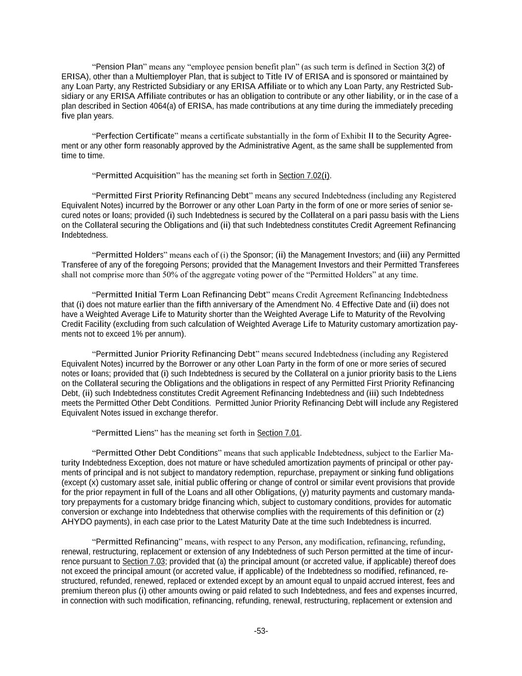 -53- “Pension Plan” means any “employee pension benefit plan” (as such term is defined in Section 3(2) of ERISA), other than a Multiemployer Plan, that is subject to Title IV of ERISA and is sponsored or maintained by any Loan Party, any Restricted Subsidiary or any ERISA Affiliate or to which any Loan Party, any Restricted Sub- sidiary or any ERISA Affiliate contributes or has an obligation to contribute or any other liability, or in the case of a plan described in Section 4064(a) of ERISA, has made contributions at any time during the immediately preceding five plan years. “Perfection Certificate” means a certificate substantially in the form of Exhibit II to the Security Agree- ment or any other form reasonably approved by the Administrative Agent, as the same shall be supplemented from time to time. “Permitted Acquisition” has the meaning set forth in Section 7.02(i). “Permitted First Priority Refinancing Debt” means any secured Indebtedness (including any Registered Equivalent Notes) incurred by the Borrower or any other Loan Party in the form of one or more series of senior se- cured notes or loans; provided (i) such Indebtedness is secured by the Collateral on a pari passu basis with the Liens on the Collateral securing the Obligations and (ii) that such Indebtedness constitutes Credit Agreement Refinancing Indebtedness. “Permitted Holders” means each of (i) the Sponsor; (ii) the Management Investors; and (iii) any Permitted Transferee of any of the foregoing Persons; provided that the Management Investors and their Permitted Transferees shall not comprise more than 50% of the aggregate voting power of the “Permitted Holders” at any time. “Permitted Initial Term Loan Refinancing Debt” means Credit Agreement Refinancing Indebtedness that (i) does not mature earlier than the fifth anniversary of the Amendment No. 4 Effective Date and (ii) does not have a Weighted Average Life to Maturity shorter than the Weighted Average Life to Maturity of the Revolving Credit Facility (excluding from such calculation of Weighted Average Life to Maturity customary amortization pay- ments not to exceed 1% per annum). “Permitted Junior Priority Refinancing Debt” means secured Indebtedness (including any Registered Equivalent Notes) incurred by the Borrower or any other Loan Party in the form of one or more series of secured notes or loans; provided that (i) such Indebtedness is secured by the Collateral on a junior priority basis to the Liens on the Collateral securing the Obligations and the obligations in respect of any Permitted First Priority Refinancing Debt, (ii) such Indebtedness constitutes Credit Agreement Refinancing Indebtedness and (iii) such Indebtedness meets the Permitted Other Debt Conditions. Permitted Junior Priority Refinancing Debt will include any Registered Equivalent Notes issued in exchange therefor. “Permitted Liens” has the meaning set forth in Section 7.01. “Permitted Other Debt Conditions” means that such applicable Indebtedness, subject to the Earlier Ma- turity Indebtedness Exception, does not mature or have scheduled amortization payments of principal or other pay- ments of principal and is not subject to mandatory redemption, repurchase, prepayment or sinking fund obligations (except (x) customary asset sale, initial public offering or change of control or similar event provisions that provide for the prior repayment in full of the Loans and all other Obligations, (y) maturity payments and customary manda- tory prepayments for a customary bridge financing which, subject to customary conditions, provides for automatic conversion or exchange into Indebtedness that otherwise complies with the requirements of this definition or (z) AHYDO payments), in each case prior to the Latest Maturity Date at the time such Indebtedness is incurred. “Permitted Refinancing” means, with respect to any Person, any modification, refinancing, refunding, renewal, restructuring, replacement or extension of any Indebtedness of such Person permitted at the time of incur- rence pursuant to Section 7.03; provided that (a) the principal amount (or accreted value, if applicable) thereof does not exceed the principal amount (or accreted value, if applicable) of the Indebtedness so modified, refinanced, re- structured, refunded, renewed, replaced or extended except by an amount equal to unpaid accrued interest, fees and premium thereon plus (i) other amounts owing or paid related to such Indebtedness, and fees and expenses incurred, in connection with such modification, refinancing, refunding, renewal, restructuring, replacement or extension and