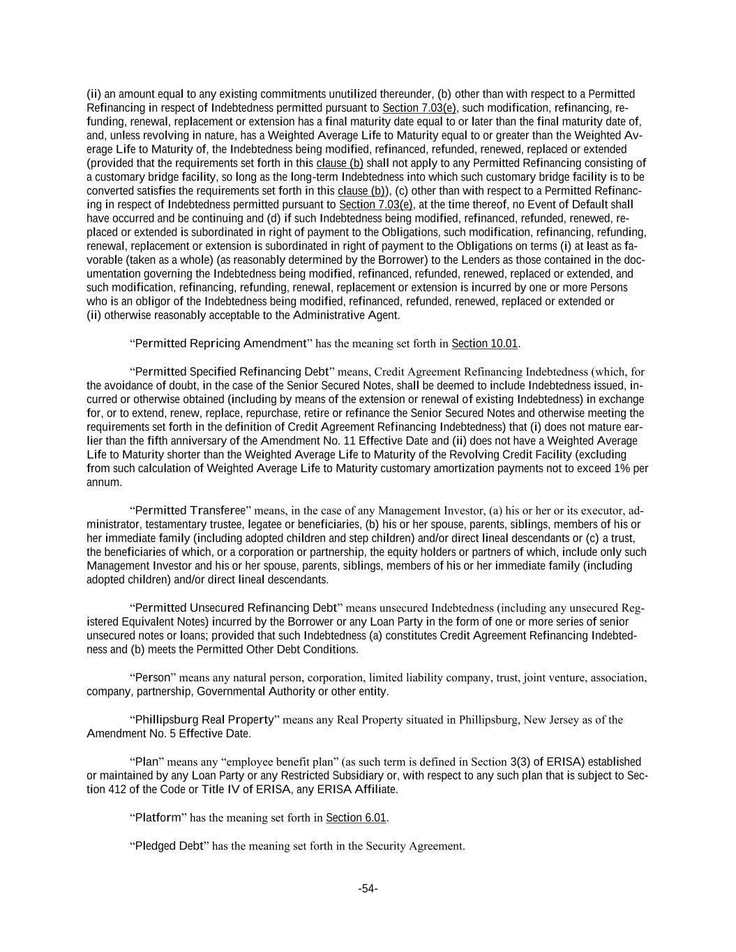 -54- (ii) an amount equal to any existing commitments unutilized thereunder, (b) other than with respect to a Permitted Refinancing in respect of Indebtedness permitted pursuant to Section 7.03(e), such modification, refinancing, re- funding, renewal, replacement or extension has a final maturity date equal to or later than the final maturity date of, and, unless revolving in nature, has a Weighted Average Life to Maturity equal to or greater than the Weighted Av- erage Life to Maturity of, the Indebtedness being modified, refinanced, refunded, renewed, replaced or extended (provided that the requirements set forth in this clause (b) shall not apply to any Permitted Refinancing consisting of a customary bridge facility, so long as the long-term Indebtedness into which such customary bridge facility is to be converted satisfies the requirements set forth in this clause (b)), (c) other than with respect to a Permitted Refinanc- ing in respect of Indebtedness permitted pursuant to Section 7.03(e), at the time thereof, no Event of Default shall have occurred and be continuing and (d) if such Indebtedness being modified, refinanced, refunded, renewed, re- placed or extended is subordinated in right of payment to the Obligations, such modification, refinancing, refunding, renewal, replacement or extension is subordinated in right of payment to the Obligations on terms (i) at least as fa- vorable (taken as a whole) (as reasonably determined by the Borrower) to the Lenders as those contained in the doc- umentation governing the Indebtedness being modified, refinanced, refunded, renewed, replaced or extended, and such modification, refinancing, refunding, renewal, replacement or extension is incurred by one or more Persons who is an obligor of the Indebtedness being modified, refinanced, refunded, renewed, replaced or extended or (ii) otherwise reasonably acceptable to the Administrative Agent. “Permitted Repricing Amendment” has the meaning set forth in Section 10.01. “Permitted Specified Refinancing Debt” means, Credit Agreement Refinancing Indebtedness (which, for the avoidance of doubt, in the case of the Senior Secured Notes, shall be deemed to include Indebtedness issued, in- curred or otherwise obtained (including by means of the extension or renewal of existing Indebtedness) in exchange for, or to extend, renew, replace, repurchase, retire or refinance the Senior Secured Notes and otherwise meeting the requirements set forth in the definition of Credit Agreement Refinancing Indebtedness) that (i) does not mature ear- lier than the fifth anniversary of the Amendment No. 11 Effective Date and (ii) does not have a Weighted Average Life to Maturity shorter than the Weighted Average Life to Maturity of the Revolving Credit Facility (excluding from such calculation of Weighted Average Life to Maturity customary amortization payments not to exceed 1% per annum. “Permitted Transferee” means, in the case of any Management Investor, (a) his or her or its executor, ad- ministrator, testamentary trustee, legatee or beneficiaries, (b) his or her spouse, parents, siblings, members of his or her immediate family (including adopted children and step children) and/or direct lineal descendants or (c) a trust, the beneficiaries of which, or a corporation or partnership, the equity holders or partners of which, include only such Management Investor and his or her spouse, parents, siblings, members of his or her immediate family (including adopted children) and/or direct lineal descendants. “Permitted Unsecured Refinancing Debt” means unsecured Indebtedness (including any unsecured Reg- istered Equivalent Notes) incurred by the Borrower or any Loan Party in the form of one or more series of senior unsecured notes or loans; provided that such Indebtedness (a) constitutes Credit Agreement Refinancing Indebted- ness and (b) meets the Permitted Other Debt Conditions. “Person” means any natural person, corporation, limited liability company, trust, joint venture, association, company, partnership, Governmental Authority or other entity. “Phillipsburg Real Property” means any Real Property situated in Phillipsburg, New Jersey as of the Amendment No. 5 Effective Date. “Plan” means any “employee benefit plan” (as such term is defined in Section 3(3) of ERISA) established or maintained by any Loan Party or any Restricted Subsidiary or, with respect to any such plan that is subject to Sec- tion 412 of the Code or Title IV of ERISA, any ERISA Affiliate. “Platform” has the meaning set forth in Section 6.01. “Pledged Debt” has the meaning set forth in the Security Agreement.