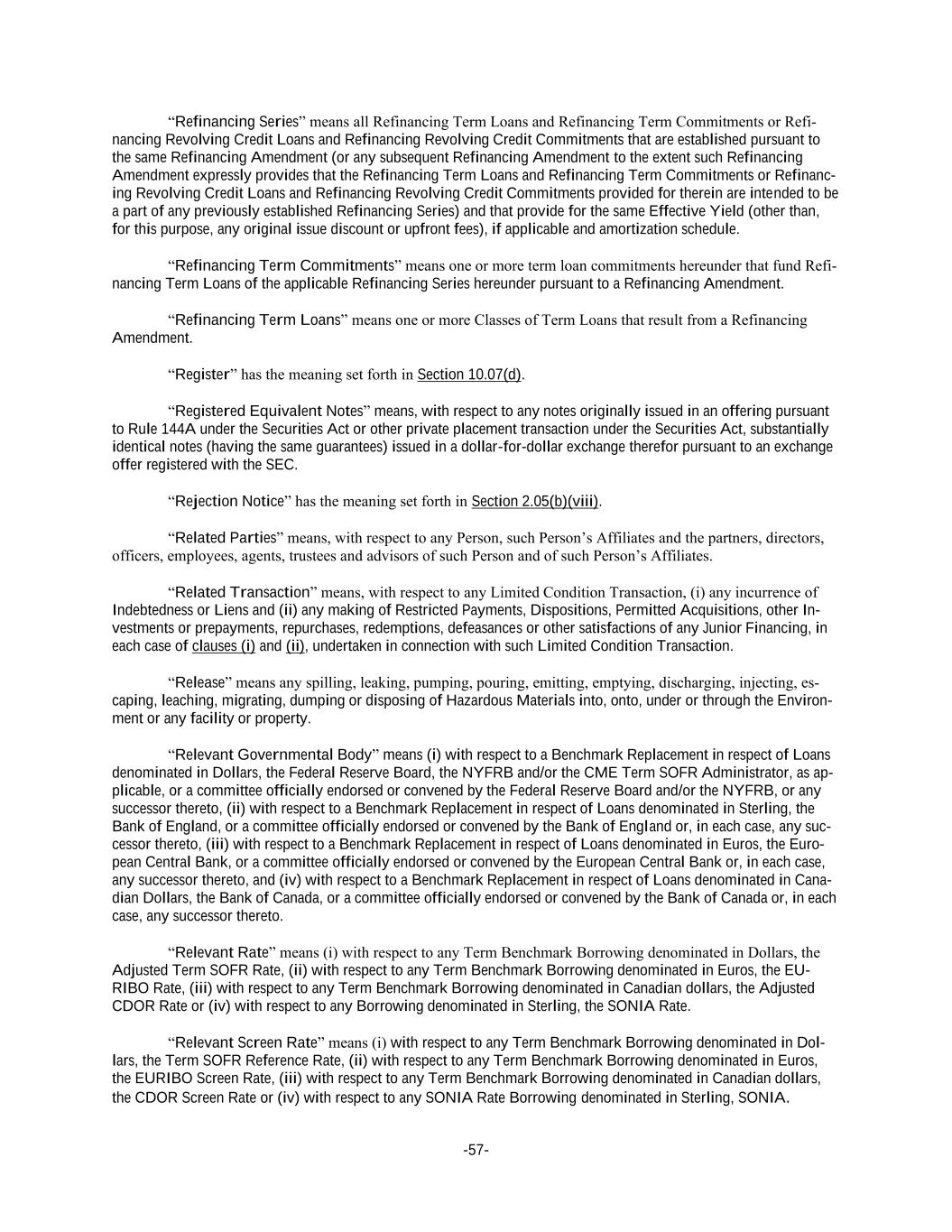 -57- “Refinancing Series” means all Refinancing Term Loans and Refinancing Term Commitments or Refi- nancing Revolving Credit Loans and Refinancing Revolving Credit Commitments that are established pursuant to the same Refinancing Amendment (or any subsequent Refinancing Amendment to the extent such Refinancing Amendment expressly provides that the Refinancing Term Loans and Refinancing Term Commitments or Refinanc- ing Revolving Credit Loans and Refinancing Revolving Credit Commitments provided for therein are intended to be a part of any previously established Refinancing Series) and that provide for the same Effective Yield (other than, for this purpose, any original issue discount or upfront fees), if applicable and amortization schedule. “Refinancing Term Commitments” means one or more term loan commitments hereunder that fund Refi- nancing Term Loans of the applicable Refinancing Series hereunder pursuant to a Refinancing Amendment. “Refinancing Term Loans” means one or more Classes of Term Loans that result from a Refinancing Amendment. “Register” has the meaning set forth in Section 10.07(d). “Registered Equivalent Notes” means, with respect to any notes originally issued in an offering pursuant to Rule 144A under the Securities Act or other private placement transaction under the Securities Act, substantially identical notes (having the same guarantees) issued in a dollar-for-dollar exchange therefor pursuant to an exchange offer registered with the SEC. “Rejection Notice” has the meaning set forth in Section 2.05(b)(viii). “Related Parties” means, with respect to any Person, such Person’s Affiliates and the partners, directors, officers, employees, agents, trustees and advisors of such Person and of such Person’s Affiliates. “Related Transaction” means, with respect to any Limited Condition Transaction, (i) any incurrence of Indebtedness or Liens and (ii) any making of Restricted Payments, Dispositions, Permitted Acquisitions, other In- vestments or prepayments, repurchases, redemptions, defeasances or other satisfactions of any Junior Financing, in each case of clauses (i) and (ii), undertaken in connection with such Limited Condition Transaction. “Release” means any spilling, leaking, pumping, pouring, emitting, emptying, discharging, injecting, es- caping, leaching, migrating, dumping or disposing of Hazardous Materials into, onto, under or through the Environ- ment or any facility or property. “Relevant Governmental Body” means (i) with respect to a Benchmark Replacement in respect of Loans denominated in Dollars, the Federal Reserve Board, the NYFRB and/or the CME Term SOFR Administrator, as ap- plicable, or a committee officially endorsed or convened by the Federal Reserve Board and/or the NYFRB, or any successor thereto, (ii) with respect to a Benchmark Replacement in respect of Loans denominated in Sterling, the Bank of England, or a committee officially endorsed or convened by the Bank of England or, in each case, any suc- cessor thereto, (iii) with respect to a Benchmark Replacement in respect of Loans denominated in Euros, the Euro- pean Central Bank, or a committee officially endorsed or convened by the European Central Bank or, in each case, any successor thereto, and (iv) with respect to a Benchmark Replacement in respect of Loans denominated in Cana- dian Dollars, the Bank of Canada, or a committee officially endorsed or convened by the Bank of Canada or, in each case, any successor thereto. “Relevant Rate” means (i) with respect to any Term Benchmark Borrowing denominated in Dollars, the Adjusted Term SOFR Rate, (ii) with respect to any Term Benchmark Borrowing denominated in Euros, the EU- RIBO Rate, (iii) with respect to any Term Benchmark Borrowing denominated in Canadian dollars, the Adjusted CDOR Rate or (iv) with respect to any Borrowing denominated in Sterling, the SONIA Rate. “Relevant Screen Rate” means (i) with respect to any Term Benchmark Borrowing denominated in Dol- lars, the Term SOFR Reference Rate, (ii) with respect to any Term Benchmark Borrowing denominated in Euros, the EURIBO Screen Rate, (iii) with respect to any Term Benchmark Borrowing denominated in Canadian dollars, the CDOR Screen Rate or (iv) with respect to any SONIA Rate Borrowing denominated in Sterling, SONIA.