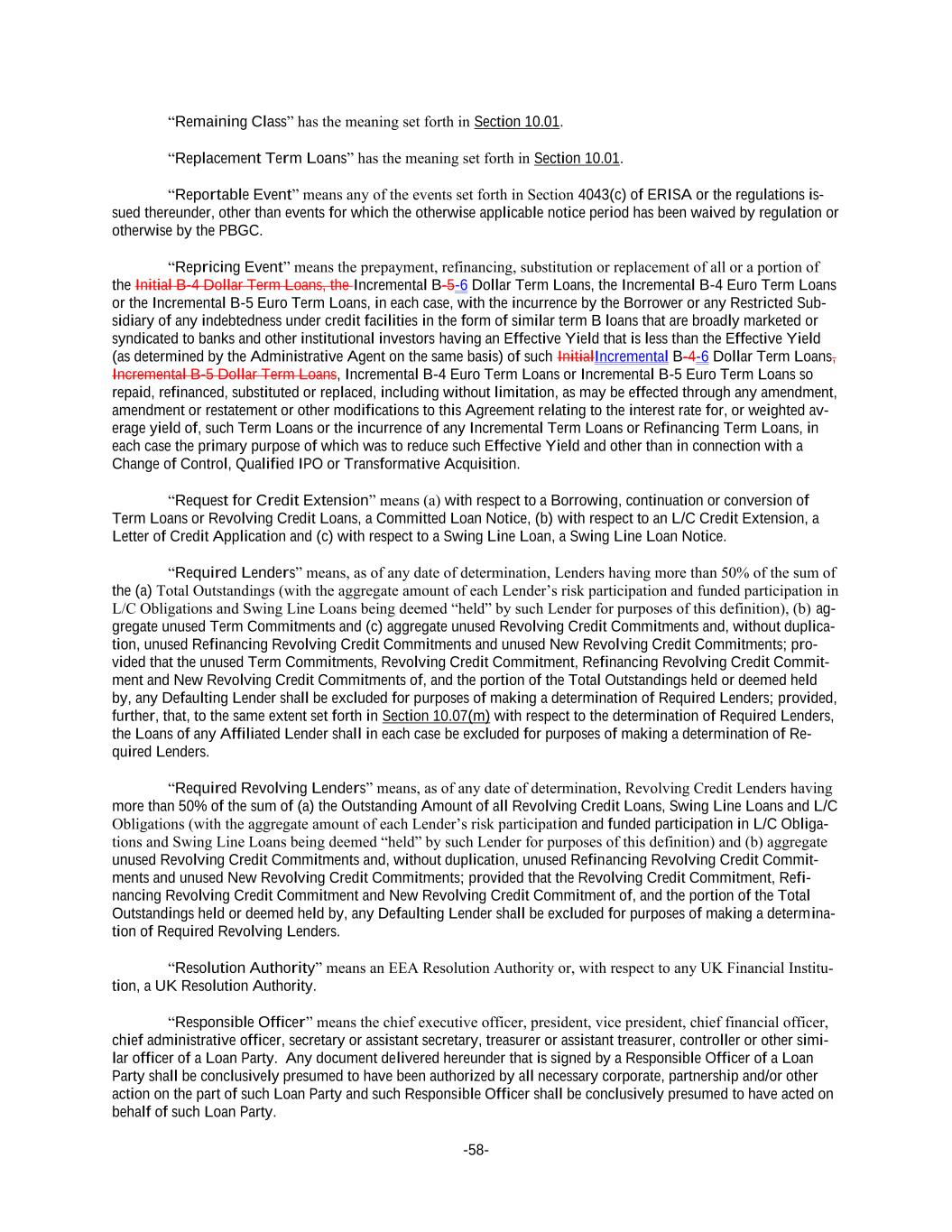 -58- “Remaining Class” has the meaning set forth in Section 10.01. “Replacement Term Loans” has the meaning set forth in Section 10.01. “Reportable Event” means any of the events set forth in Section 4043(c) of ERISA or the regulations is- sued thereunder, other than events for which the otherwise applicable notice period has been waived by regulation or otherwise by the PBGC. “Repricing Event” means the prepayment, refinancing, substitution or replacement of all or a portion of the Initial B-4 Dollar Term Loans, the Incremental B-5-6 Dollar Term Loans, the Incremental B-4 Euro Term Loans or the Incremental B-5 Euro Term Loans, in each case, with the incurrence by the Borrower or any Restricted Sub- sidiary of any indebtedness under credit facilities in the form of similar term B loans that are broadly marketed or syndicated to banks and other institutional investors having an Effective Yield that is less than the Effective Yield (as determined by the Administrative Agent on the same basis) of such InitialIncremental B-4-6 Dollar Term Loans, Incremental B-5 Dollar Term Loans, Incremental B-4 Euro Term Loans or Incremental B-5 Euro Term Loans so repaid, refinanced, substituted or replaced, including without limitation, as may be effected through any amendment, amendment or restatement or other modifications to this Agreement relating to the interest rate for, or weighted av- erage yield of, such Term Loans or the incurrence of any Incremental Term Loans or Refinancing Term Loans, in each case the primary purpose of which was to reduce such Effective Yield and other than in connection with a Change of Control, Qualified IPO or Transformative Acquisition. “Request for Credit Extension” means (a) with respect to a Borrowing, continuation or conversion of Term Loans or Revolving Credit Loans, a Committed Loan Notice, (b) with respect to an L/C Credit Extension, a Letter of Credit Application and (c) with respect to a Swing Line Loan, a Swing Line Loan Notice. “Required Lenders” means, as of any date of determination, Lenders having more than 50% of the sum of the (a) Total Outstandings (with the aggregate amount of each Lender’s risk participation and funded participation in L/C Obligations and Swing Line Loans being deemed “held” by such Lender for purposes of this definition), (b) ag- gregate unused Term Commitments and (c) aggregate unused Revolving Credit Commitments and, without duplica- tion, unused Refinancing Revolving Credit Commitments and unused New Revolving Credit Commitments; pro- vided that the unused Term Commitments, Revolving Credit Commitment, Refinancing Revolving Credit Commit- ment and New Revolving Credit Commitments of, and the portion of the Total Outstandings held or deemed held by, any Defaulting Lender shall be excluded for purposes of making a determination of Required Lenders; provided, further, that, to the same extent set forth in Section 10.07(m) with respect to the determination of Required Lenders, the Loans of any Affiliated Lender shall in each case be excluded for purposes of making a determination of Re- quired Lenders. “Required Revolving Lenders” means, as of any date of determination, Revolving Credit Lenders having more than 50% of the sum of (a) the Outstanding Amount of all Revolving Credit Loans, Swing Line Loans and L/C Obligations (with the aggregate amount of each Lender’s risk participation and funded participation in L/C Obliga- tions and Swing Line Loans being deemed “held” by such Lender for purposes of this definition) and (b) aggregate unused Revolving Credit Commitments and, without duplication, unused Refinancing Revolving Credit Commit- ments and unused New Revolving Credit Commitments; provided that the Revolving Credit Commitment, Refi- nancing Revolving Credit Commitment and New Revolving Credit Commitment of, and the portion of the Total Outstandings held or deemed held by, any Defaulting Lender shall be excluded for purposes of making a determina- tion of Required Revolving Lenders. “Resolution Authority” means an EEA Resolution Authority or, with respect to any UK Financial Institu- tion, a UK Resolution Authority. “Responsible Officer” means the chief executive officer, president, vice president, chief financial officer, chief administrative officer, secretary or assistant secretary, treasurer or assistant treasurer, controller or other simi- lar officer of a Loan Party. Any document delivered hereunder that is signed by a Responsible Officer of a Loan Party shall be conclusively presumed to have been authorized by all necessary corporate, partnership and/or other action on the part of such Loan Party and such Responsible Officer shall be conclusively presumed to have acted on behalf of such Loan Party.