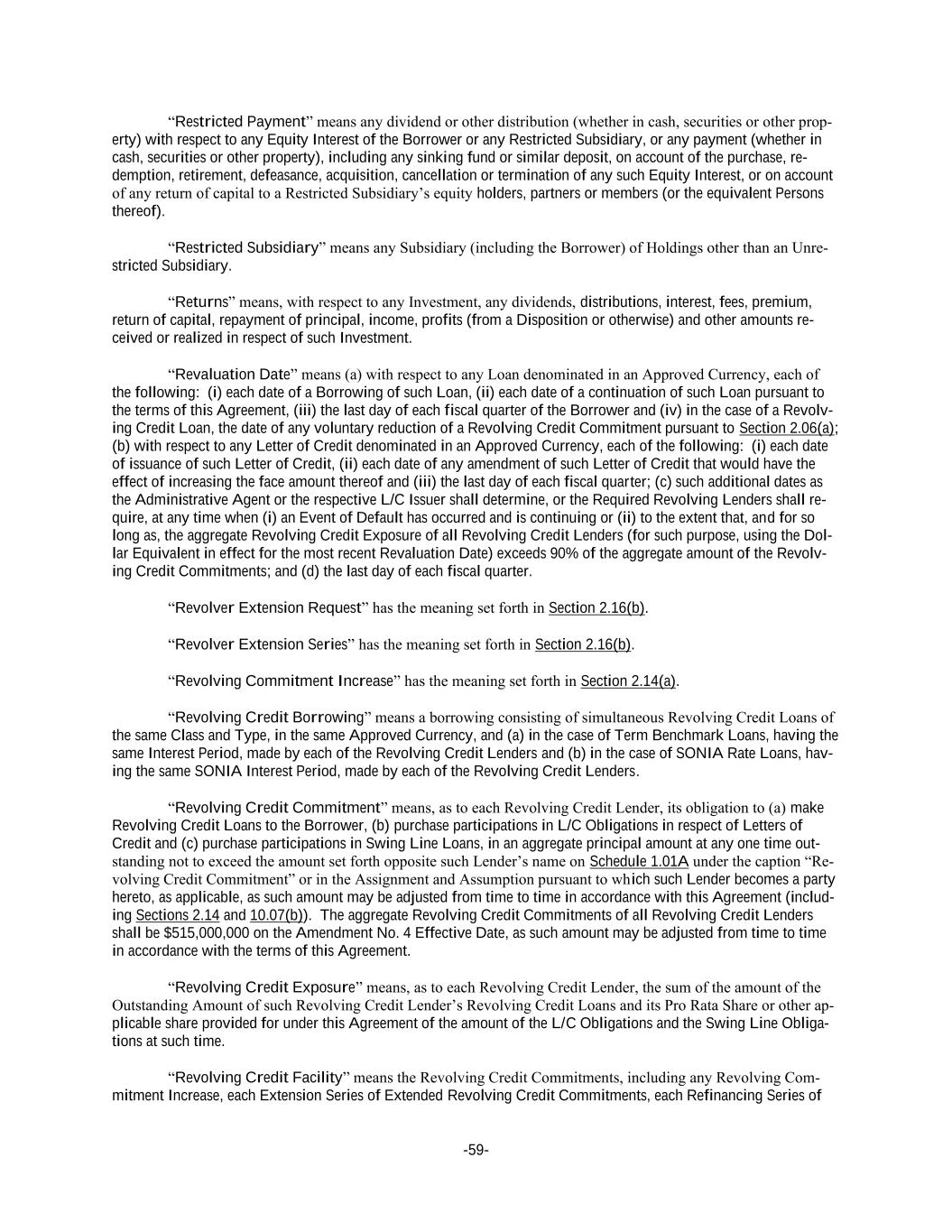 -59- “Restricted Payment” means any dividend or other distribution (whether in cash, securities or other prop- erty) with respect to any Equity Interest of the Borrower or any Restricted Subsidiary, or any payment (whether in cash, securities or other property), including any sinking fund or similar deposit, on account of the purchase, re- demption, retirement, defeasance, acquisition, cancellation or termination of any such Equity Interest, or on account of any return of capital to a Restricted Subsidiary’s equity holders, partners or members (or the equivalent Persons thereof). “Restricted Subsidiary” means any Subsidiary (including the Borrower) of Holdings other than an Unre- stricted Subsidiary. “Returns” means, with respect to any Investment, any dividends, distributions, interest, fees, premium, return of capital, repayment of principal, income, profits (from a Disposition or otherwise) and other amounts re- ceived or realized in respect of such Investment. “Revaluation Date” means (a) with respect to any Loan denominated in an Approved Currency, each of the following: (i) each date of a Borrowing of such Loan, (ii) each date of a continuation of such Loan pursuant to the terms of this Agreement, (iii) the last day of each fiscal quarter of the Borrower and (iv) in the case of a Revolv- ing Credit Loan, the date of any voluntary reduction of a Revolving Credit Commitment pursuant to Section 2.06(a); (b) with respect to any Letter of Credit denominated in an Approved Currency, each of the following: (i) each date of issuance of such Letter of Credit, (ii) each date of any amendment of such Letter of Credit that would have the effect of increasing the face amount thereof and (iii) the last day of each fiscal quarter; (c) such additional dates as the Administrative Agent or the respective L/C Issuer shall determine, or the Required Revolving Lenders shall re- quire, at any time when (i) an Event of Default has occurred and is continuing or (ii) to the extent that, and for so long as, the aggregate Revolving Credit Exposure of all Revolving Credit Lenders (for such purpose, using the Dol- lar Equivalent in effect for the most recent Revaluation Date) exceeds 90% of the aggregate amount of the Revolv- ing Credit Commitments; and (d) the last day of each fiscal quarter. “Revolver Extension Request” has the meaning set forth in Section 2.16(b). “Revolver Extension Series” has the meaning set forth in Section 2.16(b). “Revolving Commitment Increase” has the meaning set forth in Section 2.14(a). “Revolving Credit Borrowing” means a borrowing consisting of simultaneous Revolving Credit Loans of the same Class and Type, in the same Approved Currency, and (a) in the case of Term Benchmark Loans, having the same Interest Period, made by each of the Revolving Credit Lenders and (b) in the case of SONIA Rate Loans, hav- ing the same SONIA Interest Period, made by each of the Revolving Credit Lenders. “Revolving Credit Commitment” means, as to each Revolving Credit Lender, its obligation to (a) make Revolving Credit Loans to the Borrower, (b) purchase participations in L/C Obligations in respect of Letters of Credit and (c) purchase participations in Swing Line Loans, in an aggregate principal amount at any one time out- standing not to exceed the amount set forth opposite such Lender’s name on Schedule 1.01A under the caption “Re- volving Credit Commitment” or in the Assignment and Assumption pursuant to which such Lender becomes a party hereto, as applicable, as such amount may be adjusted from time to time in accordance with this Agreement (includ- ing Sections 2.14 and 10.07(b)). The aggregate Revolving Credit Commitments of all Revolving Credit Lenders shall be $515,000,000 on the Amendment No. 4 Effective Date, as such amount may be adjusted from time to time in accordance with the terms of this Agreement. “Revolving Credit Exposure” means, as to each Revolving Credit Lender, the sum of the amount of the Outstanding Amount of such Revolving Credit Lender’s Revolving Credit Loans and its Pro Rata Share or other ap- plicable share provided for under this Agreement of the amount of the L/C Obligations and the Swing Line Obliga- tions at such time. “Revolving Credit Facility” means the Revolving Credit Commitments, including any Revolving Com- mitment Increase, each Extension Series of Extended Revolving Credit Commitments, each Refinancing Series of