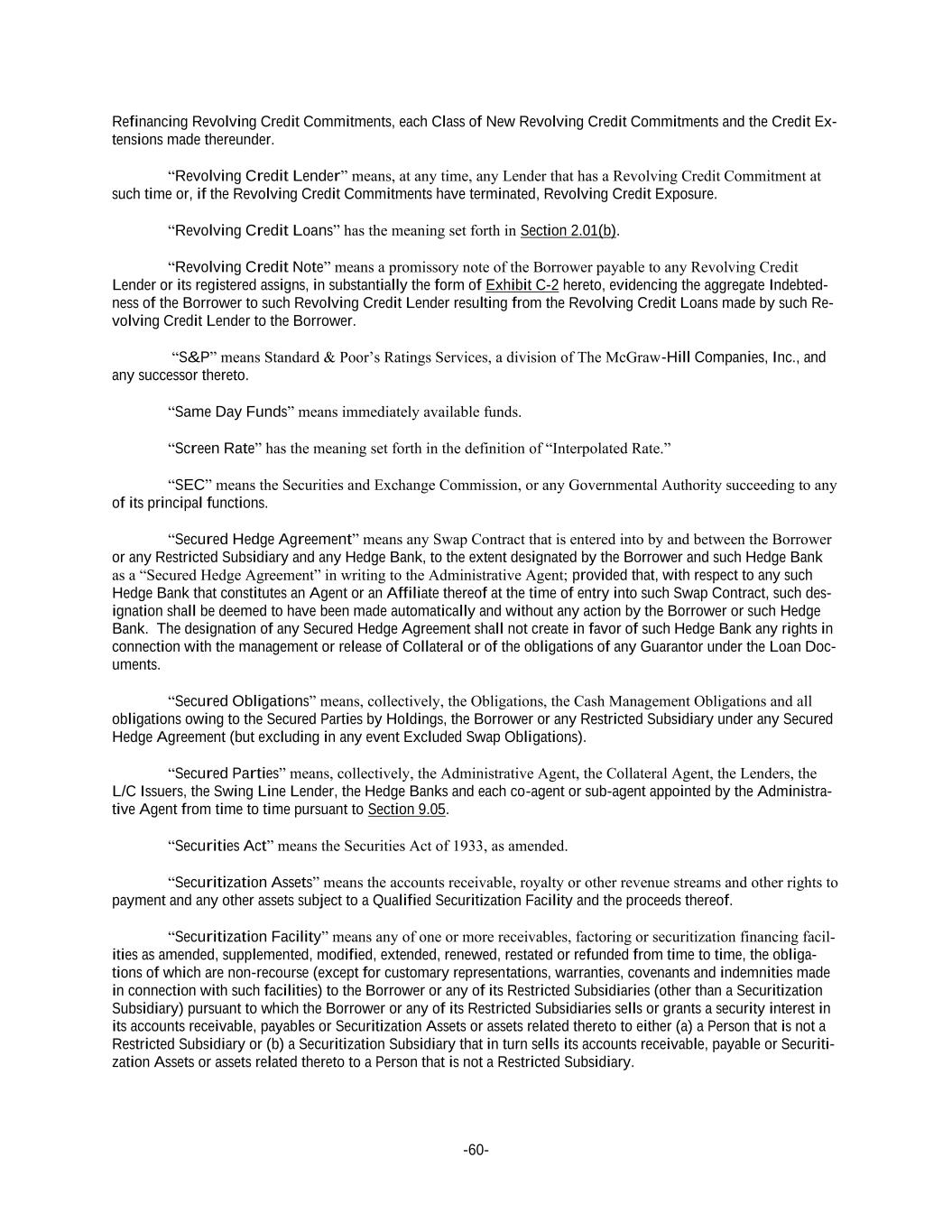 -60- Refinancing Revolving Credit Commitments, each Class of New Revolving Credit Commitments and the Credit Ex- tensions made thereunder. “Revolving Credit Lender” means, at any time, any Lender that has a Revolving Credit Commitment at such time or, if the Revolving Credit Commitments have terminated, Revolving Credit Exposure. “Revolving Credit Loans” has the meaning set forth in Section 2.01(b). “Revolving Credit Note” means a promissory note of the Borrower payable to any Revolving Credit Lender or its registered assigns, in substantially the form of Exhibit C-2 hereto, evidencing the aggregate Indebted- ness of the Borrower to such Revolving Credit Lender resulting from the Revolving Credit Loans made by such Re- volving Credit Lender to the Borrower. “S&P” means Standard & Poor’s Ratings Services, a division of The McGraw-Hill Companies, Inc., and any successor thereto. “Same Day Funds” means immediately available funds. “Screen Rate” has the meaning set forth in the definition of “Interpolated Rate.” “SEC” means the Securities and Exchange Commission, or any Governmental Authority succeeding to any of its principal functions. “Secured Hedge Agreement” means any Swap Contract that is entered into by and between the Borrower or any Restricted Subsidiary and any Hedge Bank, to the extent designated by the Borrower and such Hedge Bank as a “Secured Hedge Agreement” in writing to the Administrative Agent; provided that, with respect to any such Hedge Bank that constitutes an Agent or an Affiliate thereof at the time of entry into such Swap Contract, such des- ignation shall be deemed to have been made automatically and without any action by the Borrower or such Hedge Bank. The designation of any Secured Hedge Agreement shall not create in favor of such Hedge Bank any rights in connection with the management or release of Collateral or of the obligations of any Guarantor under the Loan Doc- uments. “Secured Obligations” means, collectively, the Obligations, the Cash Management Obligations and all obligations owing to the Secured Parties by Holdings, the Borrower or any Restricted Subsidiary under any Secured Hedge Agreement (but excluding in any event Excluded Swap Obligations). “Secured Parties” means, collectively, the Administrative Agent, the Collateral Agent, the Lenders, the L/C Issuers, the Swing Line Lender, the Hedge Banks and each co-agent or sub-agent appointed by the Administra- tive Agent from time to time pursuant to Section 9.05. “Securities Act” means the Securities Act of 1933, as amended. “Securitization Assets” means the accounts receivable, royalty or other revenue streams and other rights to payment and any other assets subject to a Qualified Securitization Facility and the proceeds thereof. “Securitization Facility” means any of one or more receivables, factoring or securitization financing facil- ities as amended, supplemented, modified, extended, renewed, restated or refunded from time to time, the obliga- tions of which are non-recourse (except for customary representations, warranties, covenants and indemnities made in connection with such facilities) to the Borrower or any of its Restricted Subsidiaries (other than a Securitization Subsidiary) pursuant to which the Borrower or any of its Restricted Subsidiaries sells or grants a security interest in its accounts receivable, payables or Securitization Assets or assets related thereto to either (a) a Person that is not a Restricted Subsidiary or (b) a Securitization Subsidiary that in turn sells its accounts receivable, payable or Securiti- zation Assets or assets related thereto to a Person that is not a Restricted Subsidiary.