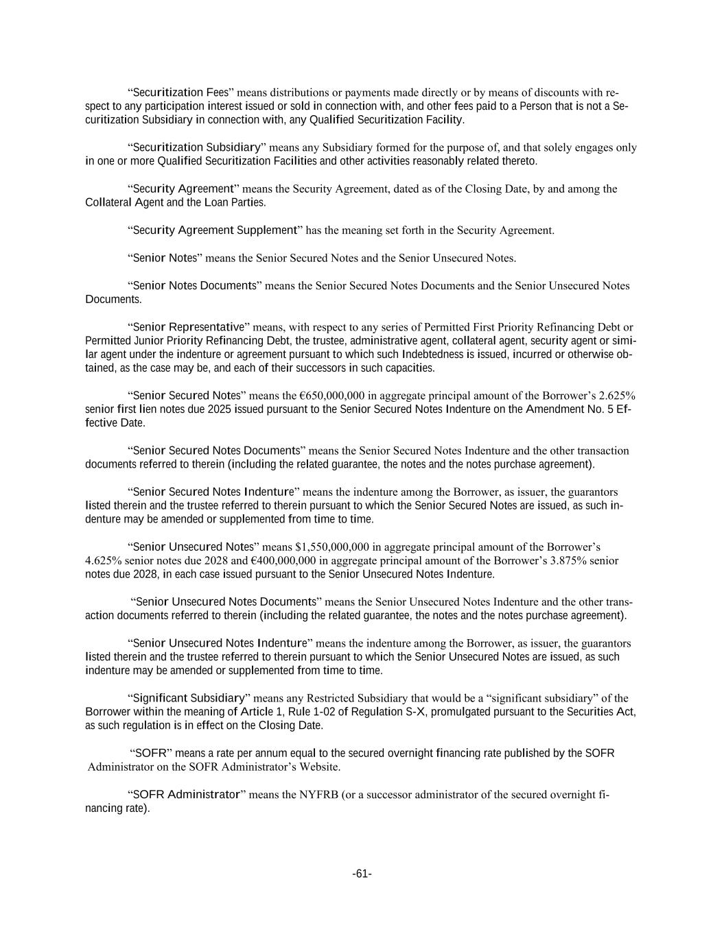 -61- “Securitization Fees” means distributions or payments made directly or by means of discounts with re- spect to any participation interest issued or sold in connection with, and other fees paid to a Person that is not a Se- curitization Subsidiary in connection with, any Qualified Securitization Facility. “Securitization Subsidiary” means any Subsidiary formed for the purpose of, and that solely engages only in one or more Qualified Securitization Facilities and other activities reasonably related thereto. “Security Agreement” means the Security Agreement, dated as of the Closing Date, by and among the Collateral Agent and the Loan Parties. “Security Agreement Supplement” has the meaning set forth in the Security Agreement. “Senior Notes” means the Senior Secured Notes and the Senior Unsecured Notes. “Senior Notes Documents” means the Senior Secured Notes Documents and the Senior Unsecured Notes Documents. “Senior Representative” means, with respect to any series of Permitted First Priority Refinancing Debt or Permitted Junior Priority Refinancing Debt, the trustee, administrative agent, collateral agent, security agent or simi- lar agent under the indenture or agreement pursuant to which such Indebtedness is issued, incurred or otherwise ob- tained, as the case may be, and each of their successors in such capacities. “Senior Secured Notes” means the €650,000,000 in aggregate principal amount of the Borrower’s 2.625% senior first lien notes due 2025 issued pursuant to the Senior Secured Notes Indenture on the Amendment No. 5 Ef- fective Date. “Senior Secured Notes Documents” means the Senior Secured Notes Indenture and the other transaction documents referred to therein (including the related guarantee, the notes and the notes purchase agreement). “Senior Secured Notes Indenture” means the indenture among the Borrower, as issuer, the guarantors listed therein and the trustee referred to therein pursuant to which the Senior Secured Notes are issued, as such in- denture may be amended or supplemented from time to time. “Senior Unsecured Notes” means $1,550,000,000 in aggregate principal amount of the Borrower’s 4.625% senior notes due 2028 and €400,000,000 in aggregate principal amount of the Borrower’s 3.875% senior notes due 2028, in each case issued pursuant to the Senior Unsecured Notes Indenture. “Senior Unsecured Notes Documents” means the Senior Unsecured Notes Indenture and the other trans- action documents referred to therein (including the related guarantee, the notes and the notes purchase agreement). “Senior Unsecured Notes Indenture” means the indenture among the Borrower, as issuer, the guarantors listed therein and the trustee referred to therein pursuant to which the Senior Unsecured Notes are issued, as such indenture may be amended or supplemented from time to time. “Significant Subsidiary” means any Restricted Subsidiary that would be a “significant subsidiary” of the Borrower within the meaning of Article 1, Rule 1-02 of Regulation S-X, promulgated pursuant to the Securities Act, as such regulation is in effect on the Closing Date. “SOFR” means a rate per annum equal to the secured overnight financing rate published by the SOFR Administrator on the SOFR Administrator’s Website. “SOFR Administrator” means the NYFRB (or a successor administrator of the secured overnight fi- nancing rate).