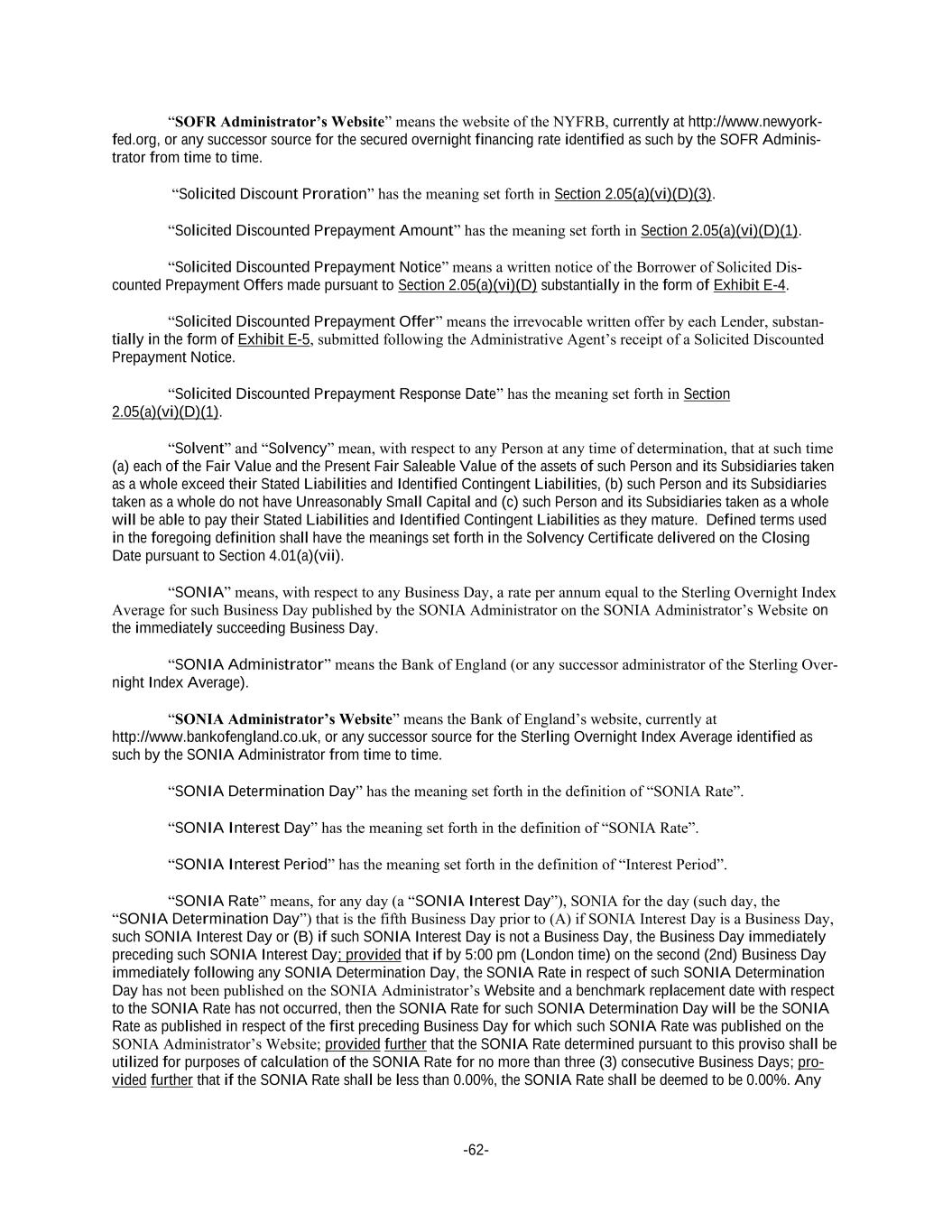 -62- “SOFR Administrator’s Website” means the website of the NYFRB, currently at http://www.newyork- fed.org, or any successor source for the secured overnight financing rate identified as such by the SOFR Adminis- trator from time to time. “Solicited Discount Proration” has the meaning set forth in Section 2.05(a)(vi)(D)(3). “Solicited Discounted Prepayment Amount” has the meaning set forth in Section 2.05(a)(vi)(D)(1). “Solicited Discounted Prepayment Notice” means a written notice of the Borrower of Solicited Dis- counted Prepayment Offers made pursuant to Section 2.05(a)(vi)(D) substantially in the form of Exhibit E-4. “Solicited Discounted Prepayment Offer” means the irrevocable written offer by each Lender, substan- tially in the form of Exhibit E-5, submitted following the Administrative Agent’s receipt of a Solicited Discounted Prepayment Notice. “Solicited Discounted Prepayment Response Date” has the meaning set forth in Section 2.05(a)(vi)(D)(1). “Solvent” and “Solvency” mean, with respect to any Person at any time of determination, that at such time (a) each of the Fair Value and the Present Fair Saleable Value of the assets of such Person and its Subsidiaries taken as a whole exceed their Stated Liabilities and Identified Contingent Liabilities, (b) such Person and its Subsidiaries taken as a whole do not have Unreasonably Small Capital and (c) such Person and its Subsidiaries taken as a whole will be able to pay their Stated Liabilities and Identified Contingent Liabilities as they mature. Defined terms used in the foregoing definition shall have the meanings set forth in the Solvency Certificate delivered on the Closing Date pursuant to Section 4.01(a)(vii). “SONIA” means, with respect to any Business Day, a rate per annum equal to the Sterling Overnight Index Average for such Business Day published by the SONIA Administrator on the SONIA Administrator’s Website on the immediately succeeding Business Day. “SONIA Administrator” means the Bank of England (or any successor administrator of the Sterling Over- night Index Average). “SONIA Administrator’s Website” means the Bank of England’s website, currently at http://www.bankofengland.co.uk, or any successor source for the Sterling Overnight Index Average identified as such by the SONIA Administrator from time to time. “SONIA Determination Day” has the meaning set forth in the definition of “SONIA Rate”. “SONIA Interest Day” has the meaning set forth in the definition of “SONIA Rate”. “SONIA Interest Period” has the meaning set forth in the definition of “Interest Period”. “SONIA Rate” means, for any day (a “SONIA Interest Day”), SONIA for the day (such day, the “SONIA Determination Day”) that is the fifth Business Day prior to (A) if SONIA Interest Day is a Business Day, such SONIA Interest Day or (B) if such SONIA Interest Day is not a Business Day, the Business Day immediately preceding such SONIA Interest Day; provided that if by 5:00 pm (London time) on the second (2nd) Business Day immediately following any SONIA Determination Day, the SONIA Rate in respect of such SONIA Determination Day has not been published on the SONIA Administrator’s Website and a benchmark replacement date with respect to the SONIA Rate has not occurred, then the SONIA Rate for such SONIA Determination Day will be the SONIA Rate as published in respect of the first preceding Business Day for which such SONIA Rate was published on the SONIA Administrator’s Website; provided further that the SONIA Rate determined pursuant to this proviso shall be utilized for purposes of calculation of the SONIA Rate for no more than three (3) consecutive Business Days; pro- vided further that if the SONIA Rate shall be less than 0.00%, the SONIA Rate shall be deemed to be 0.00%. Any