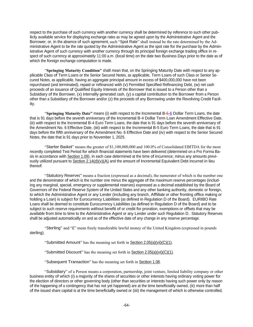 -64- respect to the purchase of such currency with another currency shall be determined by reference to such other pub- licly available service for displaying exchange rates as may be agreed upon by the Administrative Agent and the Borrower, or, in the absence of such agreement, such “Spot Rate” shall instead be the rate determined by the Ad- ministrative Agent to be the rate quoted by the Administrative Agent as the spot rate for the purchase by the Admin- istrative Agent of such currency with another currency through its principal foreign exchange trading office in re- spect of such currency at approximately 11:00 a.m. (local time) on the date two Business Days prior to the date as of which the foreign exchange computation is made. “Springing Maturity Condition” shall mean that, on the Springing Maturity Date with respect to any ap- plicable Class of Term Loans or the Senior Secured Notes, as applicable, Term Loans of such Class or Senior Se- cured Notes, as applicable, having an aggregate principal amount in excess of $400,000,000 have not been repurchased (and terminated), repaid or refinanced with (v) Permitted Specified Refinancing Debt, (w) net cash proceeds of an issuance of Qualified Equity Interests of the Borrower that is issued to a Person other than a Subsidiary of the Borrower, (x) internally generated cash, (y) a capital contribution to the Borrower from a Person other than a Subsidiary of the Borrower and/or (z) the proceeds of any Borrowing under the Revolving Credit Facil- ity. “Springing Maturity Date” means (i) with respect to the Incremental B-5-6 Dollar Term Loans, the date that is 91 days before the seventh anniversary of the Incremental B-4 Dollar Term Loan Amendment Effective Date, (ii) with respect to the Incremental B-4 Euro Term Loans, the date that is 91 days before the seventh anniversary of the Amendment No. 6 Effective Date, (iii) with respect to the Incremental B-5 Euro Term Loans, the date that is 91 days before the fifth anniversary of the Amendment No. 6 Effective Date and (iv) with respect to the Senior Secured Notes, the date that is 91 days prior to November 1, 2025. “Starter Basket” means the greater of $1,100,000,000 and 100.0% of Consolidated EBITDA for the most recently completed Test Period for which financial statements have been delivered (determined on a Pro Forma Ba- sis in accordance with Section 1.09), in each case determined at the time of incurrence; minus any amounts previ- ously utilized pursuant to Section 2.14(d)(v)(A) and the amount of Incremental Equivalent Debt incurred in lieu thereof. “Statutory Reserves” means a fraction (expressed as a decimal), the numerator of which is the number one and the denominator of which is the number one minus the aggregate of the maximum reserve percentages (includ- ing any marginal, special, emergency or supplemental reserves) expressed as a decimal established by the Board of Governors of the Federal Reserve System of the United States and any other banking authority, domestic or foreign, to which the Administrative Agent or any Lender (including any branch, Affiliate or other fronting office making or holding a Loan) is subject for Eurocurrency Liabilities (as defined in Regulation D of the Board). EURIBO Rate Loans shall be deemed to constitute Eurocurrency Liabilities (as defined in Regulation D of the Board) and to be subject to such reserve requirements without benefit of or credit for proration, exemptions or offsets that may be available from time to time to the Administrative Agent or any Lender under such Regulation D. Statutory Reserves shall be adjusted automatically on and as of the effective date of any change in any reserve percentage. “Sterling” and “£” mean freely transferable lawful money of the United Kingdom (expressed in pounds sterling). “Submitted Amount” has the meaning set forth in Section 2.05(a)(vi)(C)(1). “Submitted Discount” has the meaning set forth in Section 2.05(a)(vi)(C)(1). “Subsequent Transaction” has the meaning set forth in Section 1.08. “Subsidiary” of a Person means a corporation, partnership, joint venture, limited liability company or other business entity of which (i) a majority of the shares of securities or other interests having ordinary voting power for the election of directors or other governing body (other than securities or interests having such power only by reason of the happening of a contingency that has not yet happened) are at the time beneficially owned, (ii) more than half of the issued share capital is at the time beneficially owned or (iii) the management of which is otherwise controlled,