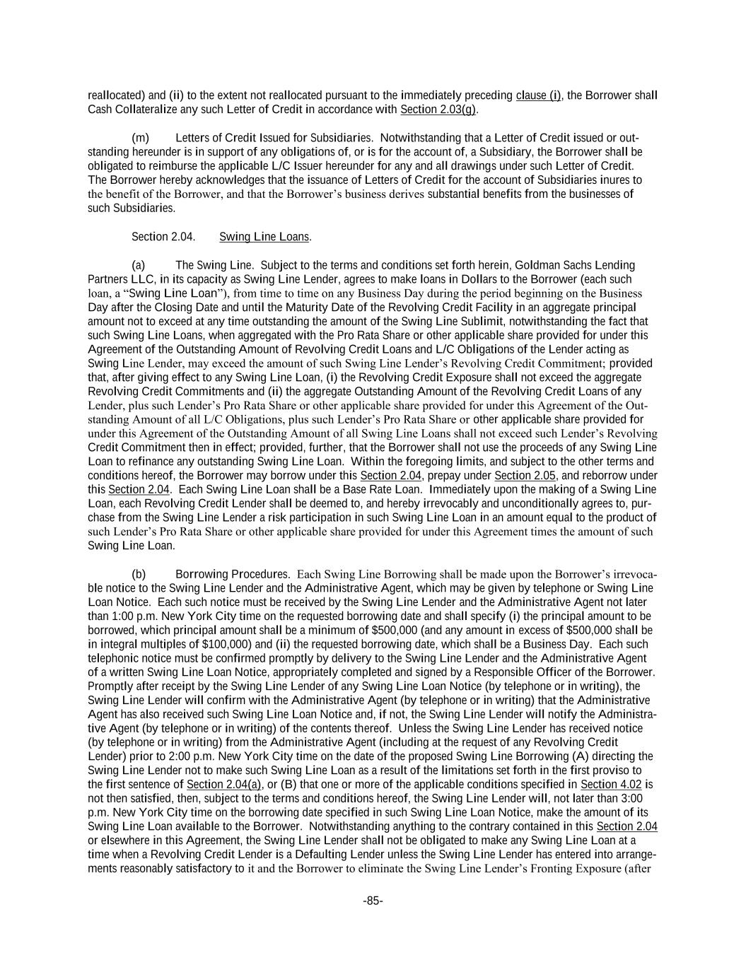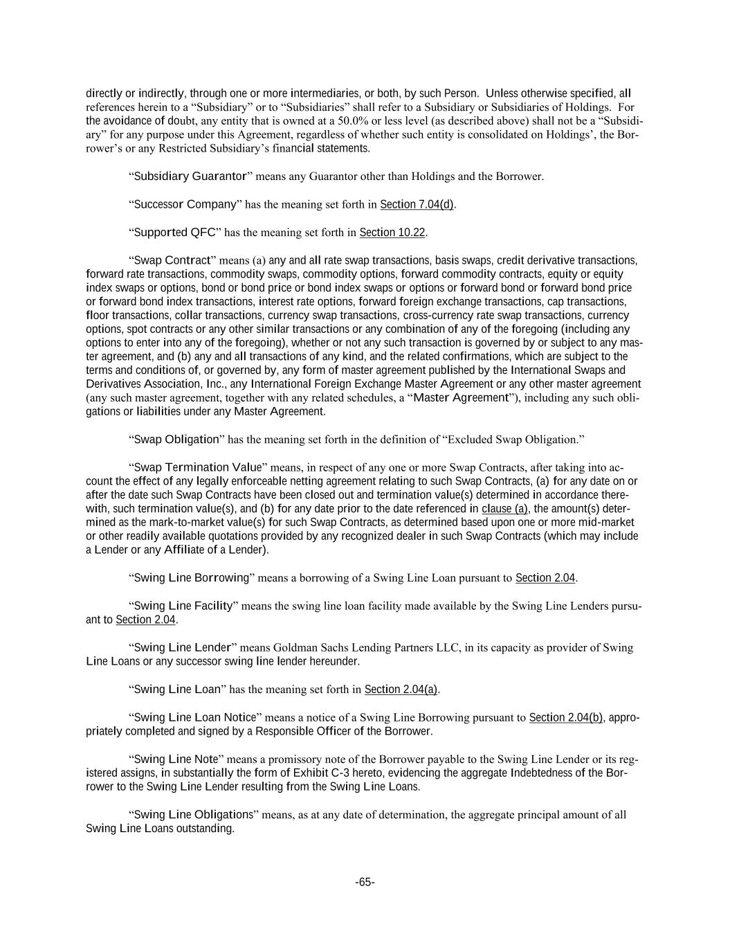 -65- directly or indirectly, through one or more intermediaries, or both, by such Person. Unless otherwise specified, all references herein to a “Subsidiary” or to “Subsidiaries” shall refer to a Subsidiary or Subsidiaries of Holdings. For the avoidance of doubt, any entity that is owned at a 50.0% or less level (as described above) shall not be a “Subsidi- ary” for any purpose under this Agreement, regardless of whether such entity is consolidated on Holdings’, the Bor- rower’s or any Restricted Subsidiary’s financial statements. “Subsidiary Guarantor” means any Guarantor other than Holdings and the Borrower. “Successor Company” has the meaning set forth in Section 7.04(d). “Supported QFC” has the meaning set forth in Section 10.22. “Swap Contract” means (a) any and all rate swap transactions, basis swaps, credit derivative transactions, forward rate transactions, commodity swaps, commodity options, forward commodity contracts, equity or equity index swaps or options, bond or bond price or bond index swaps or options or forward bond or forward bond price or forward bond index transactions, interest rate options, forward foreign exchange transactions, cap transactions, floor transactions, collar transactions, currency swap transactions, cross-currency rate swap transactions, currency options, spot contracts or any other similar transactions or any combination of any of the foregoing (including any options to enter into any of the foregoing), whether or not any such transaction is governed by or subject to any mas- ter agreement, and (b) any and all transactions of any kind, and the related confirmations, which are subject to the terms and conditions of, or governed by, any form of master agreement published by the International Swaps and Derivatives Association, Inc., any International Foreign Exchange Master Agreement or any other master agreement (any such master agreement, together with any related schedules, a “Master Agreement”), including any such obli- gations or liabilities under any Master Agreement. “Swap Obligation” has the meaning set forth in the definition of “Excluded Swap Obligation.” “Swap Termination Value” means, in respect of any one or more Swap Contracts, after taking into ac- count the effect of any legally enforceable netting agreement relating to such Swap Contracts, (a) for any date on or after the date such Swap Contracts have been closed out and termination value(s) determined in accordance there- with, such termination value(s), and (b) for any date prior to the date referenced in clause (a), the amount(s) deter- mined as the mark-to-market value(s) for such Swap Contracts, as determined based upon one or more mid-market or other readily available quotations provided by any recognized dealer in such Swap Contracts (which may include a Lender or any Affiliate of a Lender). “Swing Line Borrowing” means a borrowing of a Swing Line Loan pursuant to Section 2.04. “Swing Line Facility” means the swing line loan facility made available by the Swing Line Lenders pursu- ant to Section 2.04. “Swing Line Lender” means Goldman Sachs Lending Partners LLC, in its capacity as provider of Swing Line Loans or any successor swing line lender hereunder. “Swing Line Loan” has the meaning set forth in Section 2.04(a). “Swing Line Loan Notice” means a notice of a Swing Line Borrowing pursuant to Section 2.04(b), appro- priately completed and signed by a Responsible Officer of the Borrower. “Swing Line Note” means a promissory note of the Borrower payable to the Swing Line Lender or its reg- istered assigns, in substantially the form of Exhibit C-3 hereto, evidencing the aggregate Indebtedness of the Bor- rower to the Swing Line Lender resulting from the Swing Line Loans. “Swing Line Obligations” means, as at any date of determination, the aggregate principal amount of all Swing Line Loans outstanding.