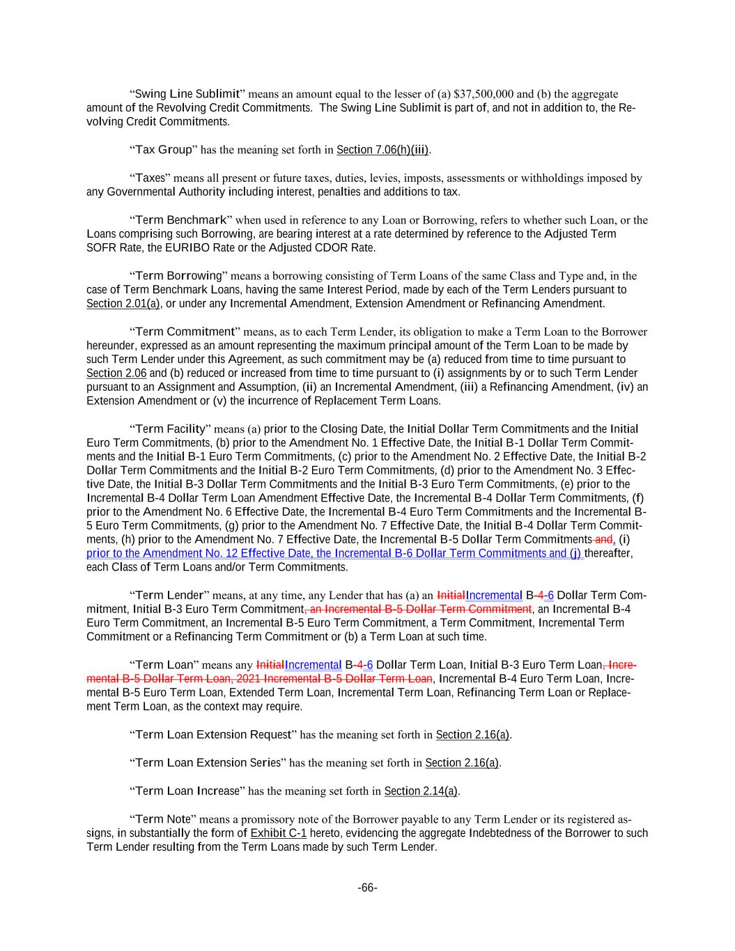 -66- “Swing Line Sublimit” means an amount equal to the lesser of (a) $37,500,000 and (b) the aggregate amount of the Revolving Credit Commitments. The Swing Line Sublimit is part of, and not in addition to, the Re- volving Credit Commitments. “Tax Group” has the meaning set forth in Section 7.06(h)(iii). “Taxes” means all present or future taxes, duties, levies, imposts, assessments or withholdings imposed by any Governmental Authority including interest, penalties and additions to tax. “Term Benchmark” when used in reference to any Loan or Borrowing, refers to whether such Loan, or the Loans comprising such Borrowing, are bearing interest at a rate determined by reference to the Adjusted Term SOFR Rate, the EURIBO Rate or the Adjusted CDOR Rate. “Term Borrowing” means a borrowing consisting of Term Loans of the same Class and Type and, in the case of Term Benchmark Loans, having the same Interest Period, made by each of the Term Lenders pursuant to Section 2.01(a), or under any Incremental Amendment, Extension Amendment or Refinancing Amendment. “Term Commitment” means, as to each Term Lender, its obligation to make a Term Loan to the Borrower hereunder, expressed as an amount representing the maximum principal amount of the Term Loan to be made by such Term Lender under this Agreement, as such commitment may be (a) reduced from time to time pursuant to Section 2.06 and (b) reduced or increased from time to time pursuant to (i) assignments by or to such Term Lender pursuant to an Assignment and Assumption, (ii) an Incremental Amendment, (iii) a Refinancing Amendment, (iv) an Extension Amendment or (v) the incurrence of Replacement Term Loans. “Term Facility” means (a) prior to the Closing Date, the Initial Dollar Term Commitments and the Initial Euro Term Commitments, (b) prior to the Amendment No. 1 Effective Date, the Initial B-1 Dollar Term Commit- ments and the Initial B-1 Euro Term Commitments, (c) prior to the Amendment No. 2 Effective Date, the Initial B-2 Dollar Term Commitments and the Initial B-2 Euro Term Commitments, (d) prior to the Amendment No. 3 Effec- tive Date, the Initial B-3 Dollar Term Commitments and the Initial B-3 Euro Term Commitments, (e) prior to the Incremental B-4 Dollar Term Loan Amendment Effective Date, the Incremental B-4 Dollar Term Commitments, (f) prior to the Amendment No. 6 Effective Date, the Incremental B-4 Euro Term Commitments and the Incremental B- 5 Euro Term Commitments, (g) prior to the Amendment No. 7 Effective Date, the Initial B-4 Dollar Term Commit- ments, (h) prior to the Amendment No. 7 Effective Date, the Incremental B-5 Dollar Term Commitments and, (i) prior to the Amendment No. 12 Effective Date, the Incremental B-6 Dollar Term Commitments and (j) thereafter, each Class of Term Loans and/or Term Commitments. “Term Lender” means, at any time, any Lender that has (a) an InitialIncremental B-4-6 Dollar Term Com- mitment, Initial B-3 Euro Term Commitment, an Incremental B-5 Dollar Term Commitment, an Incremental B-4 Euro Term Commitment, an Incremental B-5 Euro Term Commitment, a Term Commitment, Incremental Term Commitment or a Refinancing Term Commitment or (b) a Term Loan at such time. “Term Loan” means any InitialIncremental B-4-6 Dollar Term Loan, Initial B-3 Euro Term Loan, Incre- mental B-5 Dollar Term Loan, 2021 Incremental B-5 Dollar Term Loan, Incremental B-4 Euro Term Loan, Incre- mental B-5 Euro Term Loan, Extended Term Loan, Incremental Term Loan, Refinancing Term Loan or Replace- ment Term Loan, as the context may require. “Term Loan Extension Request” has the meaning set forth in Section 2.16(a). “Term Loan Extension Series” has the meaning set forth in Section 2.16(a). “Term Loan Increase” has the meaning set forth in Section 2.14(a). “Term Note” means a promissory note of the Borrower payable to any Term Lender or its registered as- signs, in substantially the form of Exhibit C-1 hereto, evidencing the aggregate Indebtedness of the Borrower to such Term Lender resulting from the Term Loans made by such Term Lender.