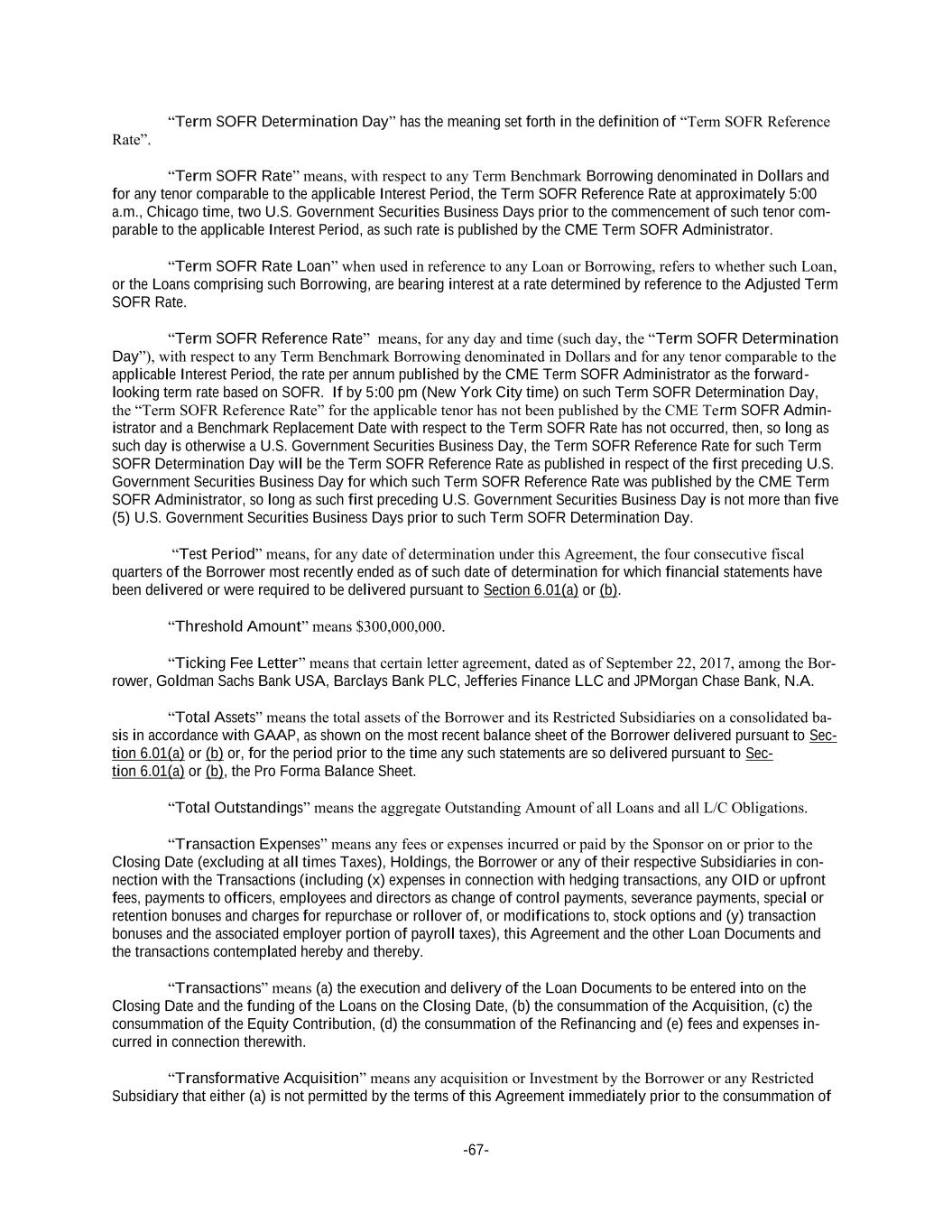 -67- “Term SOFR Determination Day” has the meaning set forth in the definition of “Term SOFR Reference Rate”. “Term SOFR Rate” means, with respect to any Term Benchmark Borrowing denominated in Dollars and for any tenor comparable to the applicable Interest Period, the Term SOFR Reference Rate at approximately 5:00 a.m., Chicago time, two U.S. Government Securities Business Days prior to the commencement of such tenor com- parable to the applicable Interest Period, as such rate is published by the CME Term SOFR Administrator. “Term SOFR Rate Loan” when used in reference to any Loan or Borrowing, refers to whether such Loan, or the Loans comprising such Borrowing, are bearing interest at a rate determined by reference to the Adjusted Term SOFR Rate. “Term SOFR Reference Rate” means, for any day and time (such day, the “Term SOFR Determination Day”), with respect to any Term Benchmark Borrowing denominated in Dollars and for any tenor comparable to the applicable Interest Period, the rate per annum published by the CME Term SOFR Administrator as the forward- looking term rate based on SOFR. If by 5:00 pm (New York City time) on such Term SOFR Determination Day, the “Term SOFR Reference Rate” for the applicable tenor has not been published by the CME Term SOFR Admin- istrator and a Benchmark Replacement Date with respect to the Term SOFR Rate has not occurred, then, so long as such day is otherwise a U.S. Government Securities Business Day, the Term SOFR Reference Rate for such Term SOFR Determination Day will be the Term SOFR Reference Rate as published in respect of the first preceding U.S. Government Securities Business Day for which such Term SOFR Reference Rate was published by the CME Term SOFR Administrator, so long as such first preceding U.S. Government Securities Business Day is not more than five (5) U.S. Government Securities Business Days prior to such Term SOFR Determination Day. “Test Period” means, for any date of determination under this Agreement, the four consecutive fiscal quarters of the Borrower most recently ended as of such date of determination for which financial statements have been delivered or were required to be delivered pursuant to Section 6.01(a) or (b). “Threshold Amount” means $300,000,000. “Ticking Fee Letter” means that certain letter agreement, dated as of September 22, 2017, among the Bor- rower, Goldman Sachs Bank USA, Barclays Bank PLC, Jefferies Finance LLC and JPMorgan Chase Bank, N.A. “Total Assets” means the total assets of the Borrower and its Restricted Subsidiaries on a consolidated ba- sis in accordance with GAAP, as shown on the most recent balance sheet of the Borrower delivered pursuant to Sec- tion 6.01(a) or (b) or, for the period prior to the time any such statements are so delivered pursuant to Sec- tion 6.01(a) or (b), the Pro Forma Balance Sheet. “Total Outstandings” means the aggregate Outstanding Amount of all Loans and all L/C Obligations. “Transaction Expenses” means any fees or expenses incurred or paid by the Sponsor on or prior to the Closing Date (excluding at all times Taxes), Holdings, the Borrower or any of their respective Subsidiaries in con- nection with the Transactions (including (x) expenses in connection with hedging transactions, any OID or upfront fees, payments to officers, employees and directors as change of control payments, severance payments, special or retention bonuses and charges for repurchase or rollover of, or modifications to, stock options and (y) transaction bonuses and the associated employer portion of payroll taxes), this Agreement and the other Loan Documents and the transactions contemplated hereby and thereby. “Transactions” means (a) the execution and delivery of the Loan Documents to be entered into on the Closing Date and the funding of the Loans on the Closing Date, (b) the consummation of the Acquisition, (c) the consummation of the Equity Contribution, (d) the consummation of the Refinancing and (e) fees and expenses in- curred in connection therewith. “Transformative Acquisition” means any acquisition or Investment by the Borrower or any Restricted Subsidiary that either (a) is not permitted by the terms of this Agreement immediately prior to the consummation of