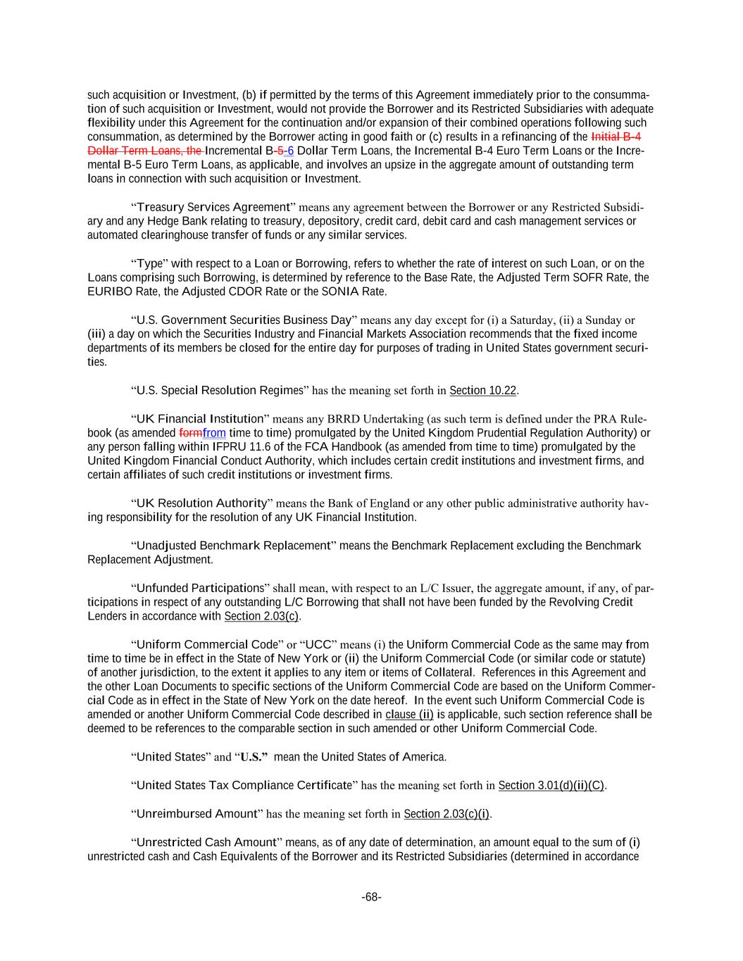 -68- such acquisition or Investment, (b) if permitted by the terms of this Agreement immediately prior to the consumma- tion of such acquisition or Investment, would not provide the Borrower and its Restricted Subsidiaries with adequate flexibility under this Agreement for the continuation and/or expansion of their combined operations following such consummation, as determined by the Borrower acting in good faith or (c) results in a refinancing of the Initial B-4 Dollar Term Loans, the Incremental B-5-6 Dollar Term Loans, the Incremental B-4 Euro Term Loans or the Incre- mental B-5 Euro Term Loans, as applicable, and involves an upsize in the aggregate amount of outstanding term loans in connection with such acquisition or Investment. “Treasury Services Agreement” means any agreement between the Borrower or any Restricted Subsidi- ary and any Hedge Bank relating to treasury, depository, credit card, debit card and cash management services or automated clearinghouse transfer of funds or any similar services. “Type” with respect to a Loan or Borrowing, refers to whether the rate of interest on such Loan, or on the Loans comprising such Borrowing, is determined by reference to the Base Rate, the Adjusted Term SOFR Rate, the EURIBO Rate, the Adjusted CDOR Rate or the SONIA Rate. “U.S. Government Securities Business Day” means any day except for (i) a Saturday, (ii) a Sunday or (iii) a day on which the Securities Industry and Financial Markets Association recommends that the fixed income departments of its members be closed for the entire day for purposes of trading in United States government securi- ties. “U.S. Special Resolution Regimes” has the meaning set forth in Section 10.22. “UK Financial Institution” means any BRRD Undertaking (as such term is defined under the PRA Rule- book (as amended formfrom time to time) promulgated by the United Kingdom Prudential Regulation Authority) or any person falling within IFPRU 11.6 of the FCA Handbook (as amended from time to time) promulgated by the United Kingdom Financial Conduct Authority, which includes certain credit institutions and investment firms, and certain affiliates of such credit institutions or investment firms. “UK Resolution Authority” means the Bank of England or any other public administrative authority hav- ing responsibility for the resolution of any UK Financial Institution. “Unadjusted Benchmark Replacement” means the Benchmark Replacement excluding the Benchmark Replacement Adjustment. “Unfunded Participations” shall mean, with respect to an L/C Issuer, the aggregate amount, if any, of par- ticipations in respect of any outstanding L/C Borrowing that shall not have been funded by the Revolving Credit Lenders in accordance with Section 2.03(c). “Uniform Commercial Code” or “UCC” means (i) the Uniform Commercial Code as the same may from time to time be in effect in the State of New York or (ii) the Uniform Commercial Code (or similar code or statute) of another jurisdiction, to the extent it applies to any item or items of Collateral. References in this Agreement and the other Loan Documents to specific sections of the Uniform Commercial Code are based on the Uniform Commer- cial Code as in effect in the State of New York on the date hereof. In the event such Uniform Commercial Code is amended or another Uniform Commercial Code described in clause (ii) is applicable, such section reference shall be deemed to be references to the comparable section in such amended or other Uniform Commercial Code. “United States” and “U.S.” mean the United States of America. “United States Tax Compliance Certificate” has the meaning set forth in Section 3.01(d)(ii)(C). “Unreimbursed Amount” has the meaning set forth in Section 2.03(c)(i). “Unrestricted Cash Amount” means, as of any date of determination, an amount equal to the sum of (i) unrestricted cash and Cash Equivalents of the Borrower and its Restricted Subsidiaries (determined in accordance