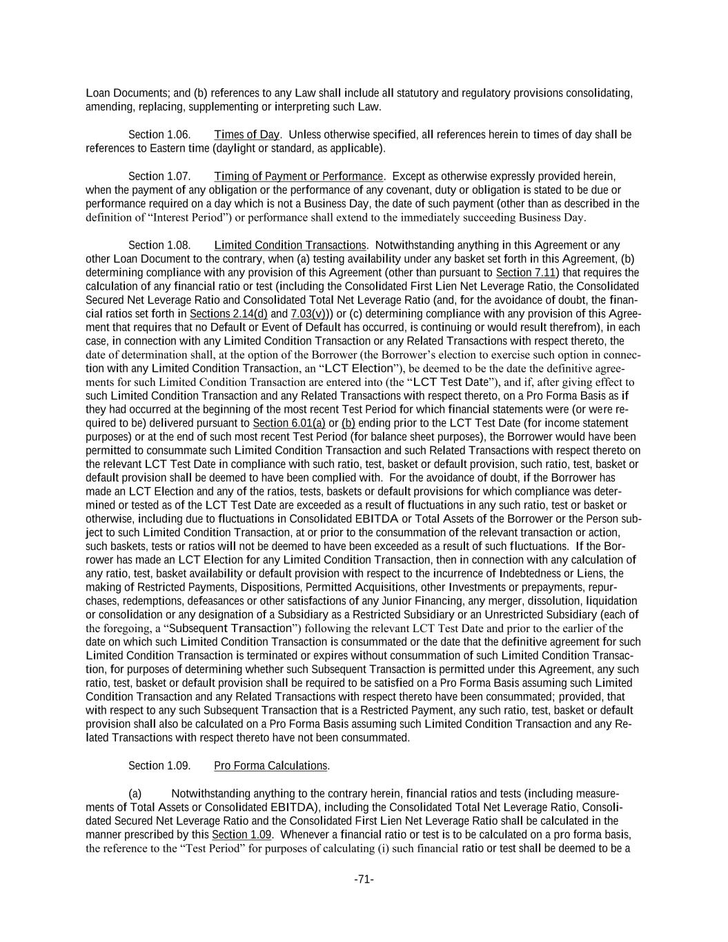 -71- Loan Documents; and (b) references to any Law shall include all statutory and regulatory provisions consolidating, amending, replacing, supplementing or interpreting such Law. Section 1.06. Times of Day. Unless otherwise specified, all references herein to times of day shall be references to Eastern time (daylight or standard, as applicable). Section 1.07. Timing of Payment or Performance. Except as otherwise expressly provided herein, when the payment of any obligation or the performance of any covenant, duty or obligation is stated to be due or performance required on a day which is not a Business Day, the date of such payment (other than as described in the definition of “Interest Period”) or performance shall extend to the immediately succeeding Business Day. Section 1.08. Limited Condition Transactions. Notwithstanding anything in this Agreement or any other Loan Document to the contrary, when (a) testing availability under any basket set forth in this Agreement, (b) determining compliance with any provision of this Agreement (other than pursuant to Section 7.11) that requires the calculation of any financial ratio or test (including the Consolidated First Lien Net Leverage Ratio, the Consolidated Secured Net Leverage Ratio and Consolidated Total Net Leverage Ratio (and, for the avoidance of doubt, the finan- cial ratios set forth in Sections 2.14(d) and 7.03(v))) or (c) determining compliance with any provision of this Agree- ment that requires that no Default or Event of Default has occurred, is continuing or would result therefrom), in each case, in connection with any Limited Condition Transaction or any Related Transactions with respect thereto, the date of determination shall, at the option of the Borrower (the Borrower’s election to exercise such option in connec- tion with any Limited Condition Transaction, an “LCT Election”), be deemed to be the date the definitive agree- ments for such Limited Condition Transaction are entered into (the “LCT Test Date”), and if, after giving effect to such Limited Condition Transaction and any Related Transactions with respect thereto, on a Pro Forma Basis as if they had occurred at the beginning of the most recent Test Period for which financial statements were (or were re- quired to be) delivered pursuant to Section 6.01(a) or (b) ending prior to the LCT Test Date (for income statement purposes) or at the end of such most recent Test Period (for balance sheet purposes), the Borrower would have been permitted to consummate such Limited Condition Transaction and such Related Transactions with respect thereto on the relevant LCT Test Date in compliance with such ratio, test, basket or default provision, such ratio, test, basket or default provision shall be deemed to have been complied with. For the avoidance of doubt, if the Borrower has made an LCT Election and any of the ratios, tests, baskets or default provisions for which compliance was deter- mined or tested as of the LCT Test Date are exceeded as a result of fluctuations in any such ratio, test or basket or otherwise, including due to fluctuations in Consolidated EBITDA or Total Assets of the Borrower or the Person sub- ject to such Limited Condition Transaction, at or prior to the consummation of the relevant transaction or action, such baskets, tests or ratios will not be deemed to have been exceeded as a result of such fluctuations. If the Bor- rower has made an LCT Election for any Limited Condition Transaction, then in connection with any calculation of any ratio, test, basket availability or default provision with respect to the incurrence of Indebtedness or Liens, the making of Restricted Payments, Dispositions, Permitted Acquisitions, other Investments or prepayments, repur- chases, redemptions, defeasances or other satisfactions of any Junior Financing, any merger, dissolution, liquidation or consolidation or any designation of a Subsidiary as a Restricted Subsidiary or an Unrestricted Subsidiary (each of the foregoing, a “Subsequent Transaction”) following the relevant LCT Test Date and prior to the earlier of the date on which such Limited Condition Transaction is consummated or the date that the definitive agreement for such Limited Condition Transaction is terminated or expires without consummation of such Limited Condition Transac- tion, for purposes of determining whether such Subsequent Transaction is permitted under this Agreement, any such ratio, test, basket or default provision shall be required to be satisfied on a Pro Forma Basis assuming such Limited Condition Transaction and any Related Transactions with respect thereto have been consummated; provided, that with respect to any such Subsequent Transaction that is a Restricted Payment, any such ratio, test, basket or default provision shall also be calculated on a Pro Forma Basis assuming such Limited Condition Transaction and any Re- lated Transactions with respect thereto have not been consummated. Section 1.09. Pro Forma Calculations. (a) Notwithstanding anything to the contrary herein, financial ratios and tests (including measure- ments of Total Assets or Consolidated EBITDA), including the Consolidated Total Net Leverage Ratio, Consoli- dated Secured Net Leverage Ratio and the Consolidated First Lien Net Leverage Ratio shall be calculated in the manner prescribed by this Section 1.09. Whenever a financial ratio or test is to be calculated on a pro forma basis, the reference to the “Test Period” for purposes of calculating (i) such financial ratio or test shall be deemed to be a