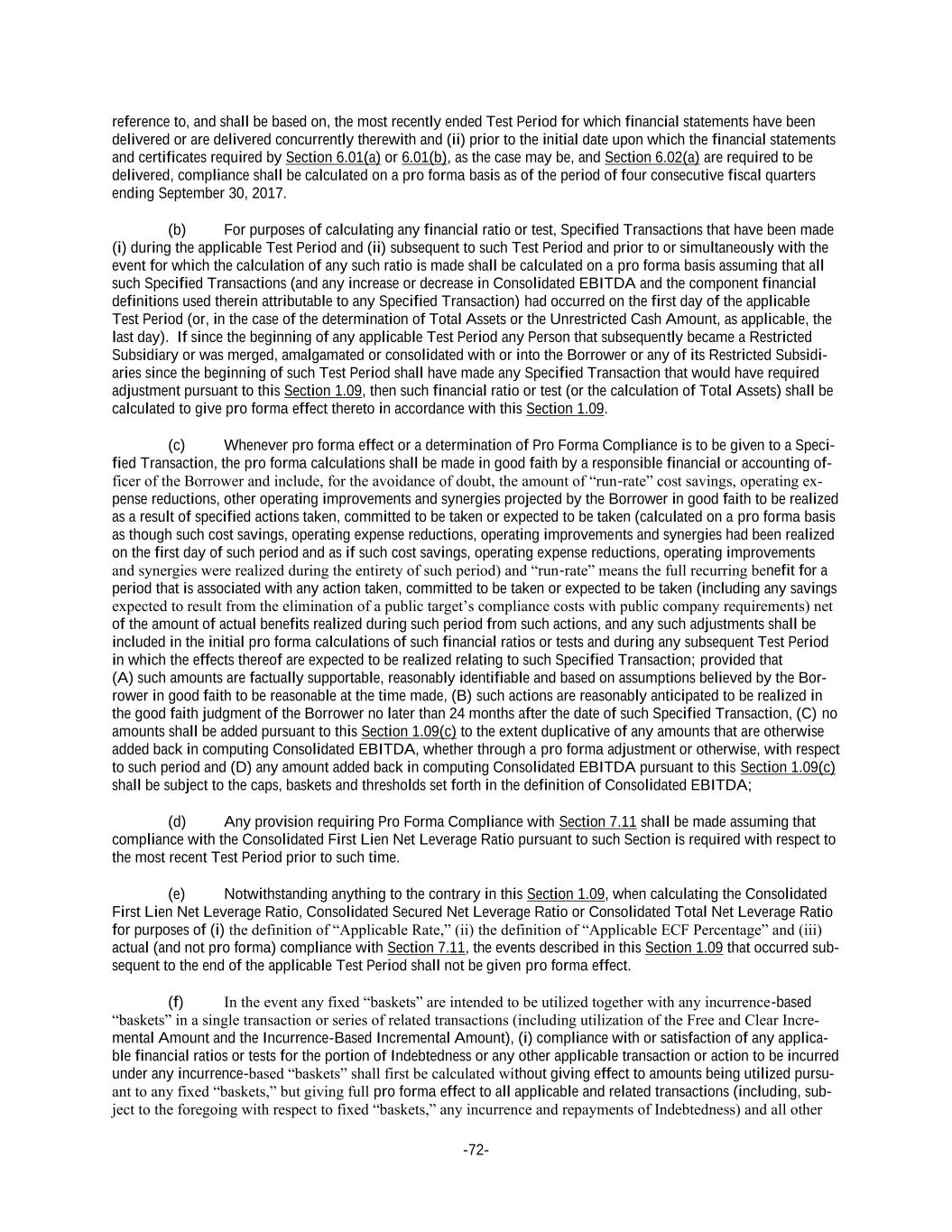 -72- reference to, and shall be based on, the most recently ended Test Period for which financial statements have been delivered or are delivered concurrently therewith and (ii) prior to the initial date upon which the financial statements and certificates required by Section 6.01(a) or 6.01(b), as the case may be, and Section 6.02(a) are required to be delivered, compliance shall be calculated on a pro forma basis as of the period of four consecutive fiscal quarters ending September 30, 2017. (b) For purposes of calculating any financial ratio or test, Specified Transactions that have been made (i) during the applicable Test Period and (ii) subsequent to such Test Period and prior to or simultaneously with the event for which the calculation of any such ratio is made shall be calculated on a pro forma basis assuming that all such Specified Transactions (and any increase or decrease in Consolidated EBITDA and the component financial definitions used therein attributable to any Specified Transaction) had occurred on the first day of the applicable Test Period (or, in the case of the determination of Total Assets or the Unrestricted Cash Amount, as applicable, the last day). If since the beginning of any applicable Test Period any Person that subsequently became a Restricted Subsidiary or was merged, amalgamated or consolidated with or into the Borrower or any of its Restricted Subsidi- aries since the beginning of such Test Period shall have made any Specified Transaction that would have required adjustment pursuant to this Section 1.09, then such financial ratio or test (or the calculation of Total Assets) shall be calculated to give pro forma effect thereto in accordance with this Section 1.09. (c) Whenever pro forma effect or a determination of Pro Forma Compliance is to be given to a Speci- fied Transaction, the pro forma calculations shall be made in good faith by a responsible financial or accounting of- ficer of the Borrower and include, for the avoidance of doubt, the amount of “run-rate” cost savings, operating ex- pense reductions, other operating improvements and synergies projected by the Borrower in good faith to be realized as a result of specified actions taken, committed to be taken or expected to be taken (calculated on a pro forma basis as though such cost savings, operating expense reductions, operating improvements and synergies had been realized on the first day of such period and as if such cost savings, operating expense reductions, operating improvements and synergies were realized during the entirety of such period) and “run-rate” means the full recurring benefit for a period that is associated with any action taken, committed to be taken or expected to be taken (including any savings expected to result from the elimination of a public target’s compliance costs with public company requirements) net of the amount of actual benefits realized during such period from such actions, and any such adjustments shall be included in the initial pro forma calculations of such financial ratios or tests and during any subsequent Test Period in which the effects thereof are expected to be realized relating to such Specified Transaction; provided that (A) such amounts are factually supportable, reasonably identifiable and based on assumptions believed by the Bor- rower in good faith to be reasonable at the time made, (B) such actions are reasonably anticipated to be realized in the good faith judgment of the Borrower no later than 24 months after the date of such Specified Transaction, (C) no amounts shall be added pursuant to this Section 1.09(c) to the extent duplicative of any amounts that are otherwise added back in computing Consolidated EBITDA, whether through a pro forma adjustment or otherwise, with respect to such period and (D) any amount added back in computing Consolidated EBITDA pursuant to this Section 1.09(c) shall be subject to the caps, baskets and thresholds set forth in the definition of Consolidated EBITDA; (d) Any provision requiring Pro Forma Compliance with Section 7.11 shall be made assuming that compliance with the Consolidated First Lien Net Leverage Ratio pursuant to such Section is required with respect to the most recent Test Period prior to such time. (e) Notwithstanding anything to the contrary in this Section 1.09, when calculating the Consolidated First Lien Net Leverage Ratio, Consolidated Secured Net Leverage Ratio or Consolidated Total Net Leverage Ratio for purposes of (i) the definition of “Applicable Rate,” (ii) the definition of “Applicable ECF Percentage” and (iii) actual (and not pro forma) compliance with Section 7.11, the events described in this Section 1.09 that occurred sub- sequent to the end of the applicable Test Period shall not be given pro forma effect. (f) In the event any fixed “baskets” are intended to be utilized together with any incurrence-based “baskets” in a single transaction or series of related transactions (including utilization of the Free and Clear Incre- mental Amount and the Incurrence-Based Incremental Amount), (i) compliance with or satisfaction of any applica- ble financial ratios or tests for the portion of Indebtedness or any other applicable transaction or action to be incurred under any incurrence-based “baskets” shall first be calculated without giving effect to amounts being utilized pursu- ant to any fixed “baskets,” but giving full pro forma effect to all applicable and related transactions (including, sub- ject to the foregoing with respect to fixed “baskets,” any incurrence and repayments of Indebtedness) and all other