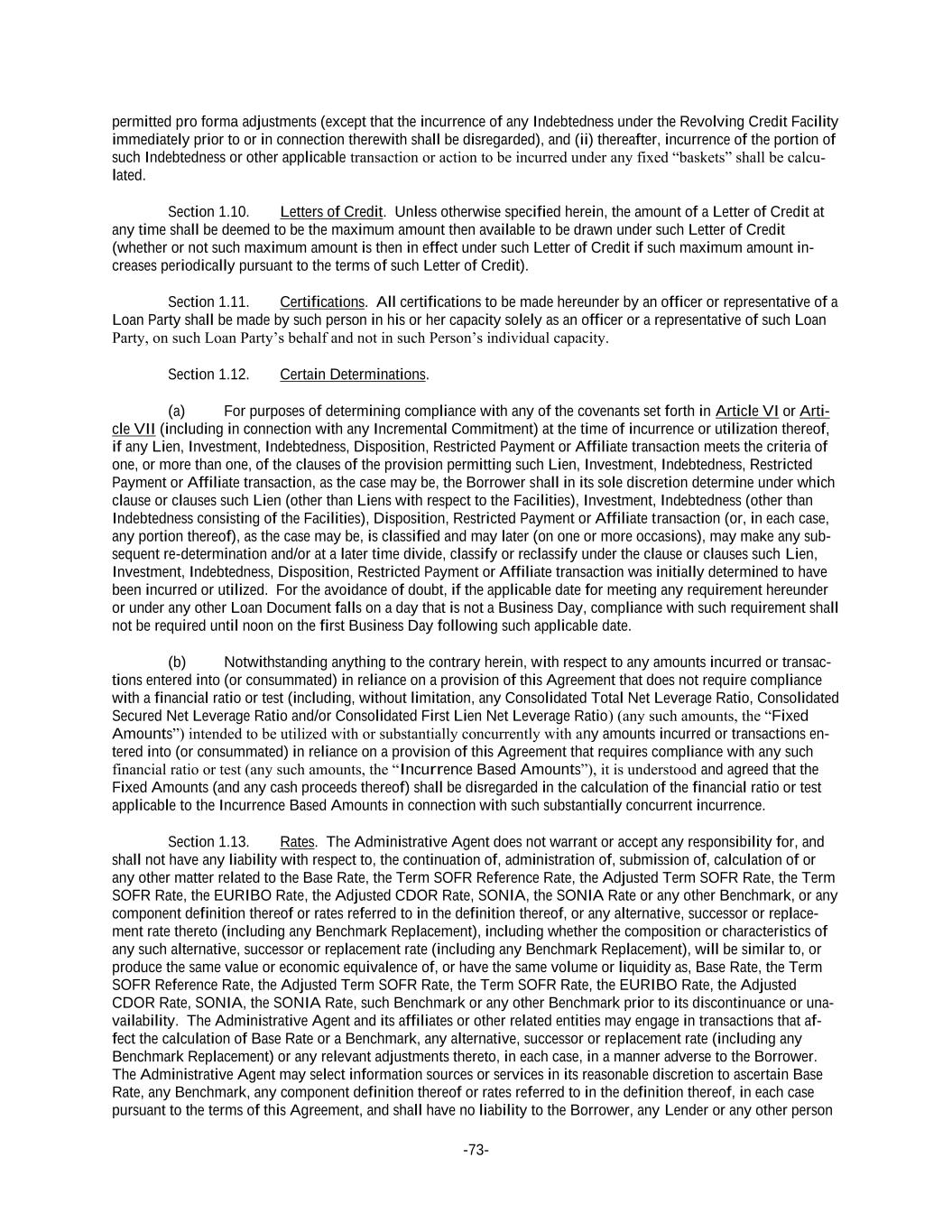 -73- permitted pro forma adjustments (except that the incurrence of any Indebtedness under the Revolving Credit Facility immediately prior to or in connection therewith shall be disregarded), and (ii) thereafter, incurrence of the portion of such Indebtedness or other applicable transaction or action to be incurred under any fixed “baskets” shall be calcu- lated. Section 1.10. Letters of Credit. Unless otherwise specified herein, the amount of a Letter of Credit at any time shall be deemed to be the maximum amount then available to be drawn under such Letter of Credit (whether or not such maximum amount is then in effect under such Letter of Credit if such maximum amount in- creases periodically pursuant to the terms of such Letter of Credit). Section 1.11. Certifications. All certifications to be made hereunder by an officer or representative of a Loan Party shall be made by such person in his or her capacity solely as an officer or a representative of such Loan Party, on such Loan Party’s behalf and not in such Person’s individual capacity. Section 1.12. Certain Determinations. (a) For purposes of determining compliance with any of the covenants set forth in Article VI or Arti- cle VII (including in connection with any Incremental Commitment) at the time of incurrence or utilization thereof, if any Lien, Investment, Indebtedness, Disposition, Restricted Payment or Affiliate transaction meets the criteria of one, or more than one, of the clauses of the provision permitting such Lien, Investment, Indebtedness, Restricted Payment or Affiliate transaction, as the case may be, the Borrower shall in its sole discretion determine under which clause or clauses such Lien (other than Liens with respect to the Facilities), Investment, Indebtedness (other than Indebtedness consisting of the Facilities), Disposition, Restricted Payment or Affiliate transaction (or, in each case, any portion thereof), as the case may be, is classified and may later (on one or more occasions), may make any sub- sequent re-determination and/or at a later time divide, classify or reclassify under the clause or clauses such Lien, Investment, Indebtedness, Disposition, Restricted Payment or Affiliate transaction was initially determined to have been incurred or utilized. For the avoidance of doubt, if the applicable date for meeting any requirement hereunder or under any other Loan Document falls on a day that is not a Business Day, compliance with such requirement shall not be required until noon on the first Business Day following such applicable date. (b) Notwithstanding anything to the contrary herein, with respect to any amounts incurred or transac- tions entered into (or consummated) in reliance on a provision of this Agreement that does not require compliance with a financial ratio or test (including, without limitation, any Consolidated Total Net Leverage Ratio, Consolidated Secured Net Leverage Ratio and/or Consolidated First Lien Net Leverage Ratio) (any such amounts, the “Fixed Amounts”) intended to be utilized with or substantially concurrently with any amounts incurred or transactions en- tered into (or consummated) in reliance on a provision of this Agreement that requires compliance with any such financial ratio or test (any such amounts, the “Incurrence Based Amounts”), it is understood and agreed that the Fixed Amounts (and any cash proceeds thereof) shall be disregarded in the calculation of the financial ratio or test applicable to the Incurrence Based Amounts in connection with such substantially concurrent incurrence. Section 1.13. Rates. The Administrative Agent does not warrant or accept any responsibility for, and shall not have any liability with respect to, the continuation of, administration of, submission of, calculation of or any other matter related to the Base Rate, the Term SOFR Reference Rate, the Adjusted Term SOFR Rate, the Term SOFR Rate, the EURIBO Rate, the Adjusted CDOR Rate, SONIA, the SONIA Rate or any other Benchmark, or any component definition thereof or rates referred to in the definition thereof, or any alternative, successor or replace- ment rate thereto (including any Benchmark Replacement), including whether the composition or characteristics of any such alternative, successor or replacement rate (including any Benchmark Replacement), will be similar to, or produce the same value or economic equivalence of, or have the same volume or liquidity as, Base Rate, the Term SOFR Reference Rate, the Adjusted Term SOFR Rate, the Term SOFR Rate, the EURIBO Rate, the Adjusted CDOR Rate, SONIA, the SONIA Rate, such Benchmark or any other Benchmark prior to its discontinuance or una- vailability. The Administrative Agent and its affiliates or other related entities may engage in transactions that af- fect the calculation of Base Rate or a Benchmark, any alternative, successor or replacement rate (including any Benchmark Replacement) or any relevant adjustments thereto, in each case, in a manner adverse to the Borrower. The Administrative Agent may select information sources or services in its reasonable discretion to ascertain Base Rate, any Benchmark, any component definition thereof or rates referred to in the definition thereof, in each case pursuant to the terms of this Agreement, and shall have no liability to the Borrower, any Lender or any other person
