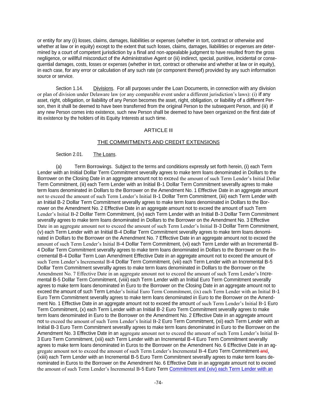 -74- or entity for any (i) losses, claims, damages, liabilities or expenses (whether in tort, contract or otherwise and whether at law or in equity) except to the extent that such losses, claims, damages, liabilities or expenses are deter- mined by a court of competent jurisdiction by a final and non-appealable judgment to have resulted from the gross negligence, or willful misconduct of the Administrative Agent or (ii) indirect, special, punitive, incidental or conse- quential damages, costs, losses or expenses (whether in tort, contract or otherwise and whether at law or in equity), in each case, for any error or calculation of any such rate (or component thereof) provided by any such information source or service. Section 1.14. Divisions. For all purposes under the Loan Documents, in connection with any division or plan of division under Delaware law (or any comparable event under a different jurisdiction’s laws): (i) if any asset, right, obligation, or liability of any Person becomes the asset, right, obligation, or liability of a different Per- son, then it shall be deemed to have been transferred from the original Person to the subsequent Person, and (ii) if any new Person comes into existence, such new Person shall be deemed to have been organized on the first date of its existence by the holders of its Equity Interests at such time. ARTICLE II THE COMMITMENTS AND CREDIT EXTENSIONS Section 2.01. The Loans. (a) Term Borrowings. Subject to the terms and conditions expressly set forth herein, (i) each Term Lender with an Initial Dollar Term Commitment severally agrees to make term loans denominated in Dollars to the Borrower on the Closing Date in an aggregate amount not to exceed the amount of such Term Lender’s Initial Dollar Term Commitment, (ii) each Term Lender with an Initial B-1 Dollar Term Commitment severally agrees to make term loans denominated in Dollars to the Borrower on the Amendment No. 1 Effective Date in an aggregate amount not to exceed the amount of such Term Lender’s Initial B-1 Dollar Term Commitment, (iii) each Term Lender with an Initial B-2 Dollar Term Commitment severally agrees to make term loans denominated in Dollars to the Bor- rower on the Amendment No. 2 Effective Date in an aggregate amount not to exceed the amount of such Term Lender’s Initial B-2 Dollar Term Commitment, (iv) each Term Lender with an Initial B-3 Dollar Term Commitment severally agrees to make term loans denominated in Dollars to the Borrower on the Amendment No. 3 Effective Date in an aggregate amount not to exceed the amount of such Term Lender’s Initial B-3 Dollar Term Commitment, (v) each Term Lender with an Initial B-4 Dollar Term Commitment severally agrees to make term loans denomi- nated in Dollars to the Borrower on the Amendment No. 7 Effective Date in an aggregate amount not to exceed the amount of such Term Lender’s Initial B-4 Dollar Term Commitment, (vi) each Term Lender with an Incremental B- 4 Dollar Term Commitment severally agrees to make term loans denominated in Dollars to the Borrower on the In- cremental B-4 Dollar Term Loan Amendment Effective Date in an aggregate amount not to exceed the amount of such Term Lender’s Incremental B-4 Dollar Term Commitment, (vii) each Term Lender with an Incremental B-5 Dollar Term Commitment severally agrees to make term loans denominated in Dollars to the Borrower on the Amendment No. 7 Effective Date in an aggregate amount not to exceed the amount of such Term Lender’s Incre- mental B-5 Dollar Term Commitment, (viii) each Term Lender with an Initial Euro Term Commitment severally agrees to make term loans denominated in Euro to the Borrower on the Closing Date in an aggregate amount not to exceed the amount of such Term Lender’s Initial Euro Term Commitment, (ix) each Term Lender with an Initial B-1 Euro Term Commitment severally agrees to make term loans denominated in Euro to the Borrower on the Amend- ment No. 1 Effective Date in an aggregate amount not to exceed the amount of such Term Lender’s Initial B-1 Euro Term Commitment, (x) each Term Lender with an Initial B-2 Euro Term Commitment severally agrees to make term loans denominated in Euro to the Borrower on the Amendment No. 2 Effective Date in an aggregate amount not to exceed the amount of such Term Lender’s Initial B-2 Euro Term Commitment, (xi) each Term Lender with an Initial B-3 Euro Term Commitment severally agrees to make term loans denominated in Euro to the Borrower on the Amendment No. 3 Effective Date in an aggregate amount not to exceed the amount of such Term Lender’s Initial B- 3 Euro Term Commitment, (xii) each Term Lender with an Incremental B-4 Euro Term Commitment severally agrees to make term loans denominated in Euros to the Borrower on the Amendment No. 6 Effective Date in an ag- gregate amount not to exceed the amount of such Term Lender’s Incremental B-4 Euro Term Commitment and, (xiii) each Term Lender with an Incremental B-5 Euro Term Commitment severally agrees to make term loans de- nominated in Euros to the Borrower on the Amendment No. 6 Effective Date in an aggregate amount not to exceed the amount of such Term Lender’s Incremental B-5 Euro Term Commitment and (xiv) each Term Lender with an