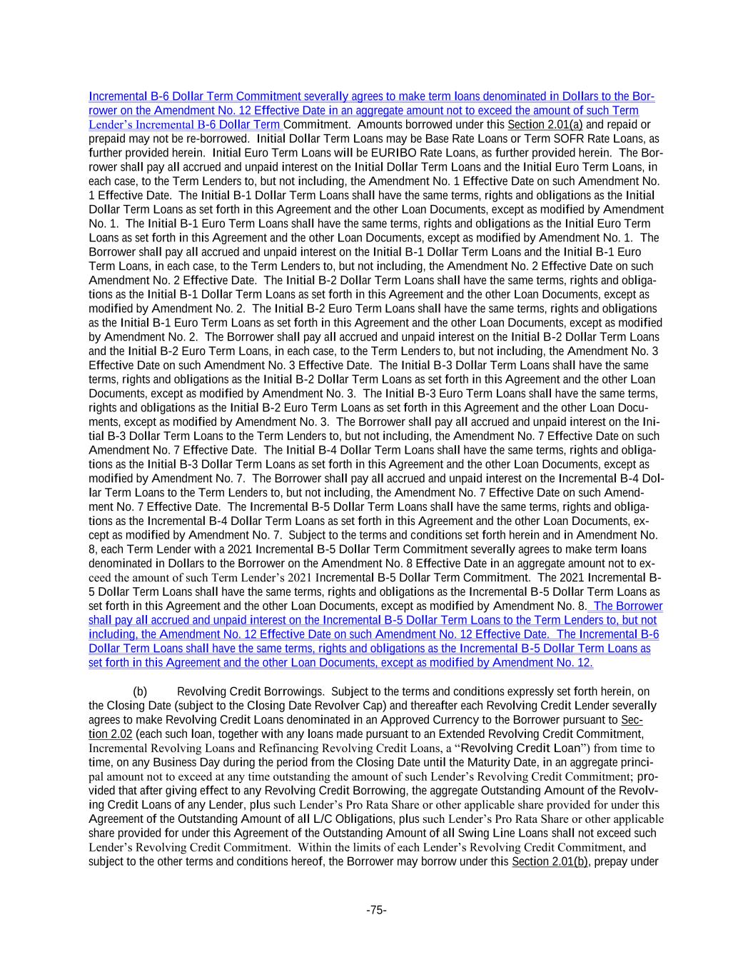 -75- Incremental B-6 Dollar Term Commitment severally agrees to make term loans denominated in Dollars to the Bor- rower on the Amendment No. 12 Effective Date in an aggregate amount not to exceed the amount of such Term Lender’s Incremental B-6 Dollar Term Commitment. Amounts borrowed under this Section 2.01(a) and repaid or prepaid may not be re-borrowed. Initial Dollar Term Loans may be Base Rate Loans or Term SOFR Rate Loans, as further provided herein. Initial Euro Term Loans will be EURIBO Rate Loans, as further provided herein. The Bor- rower shall pay all accrued and unpaid interest on the Initial Dollar Term Loans and the Initial Euro Term Loans, in each case, to the Term Lenders to, but not including, the Amendment No. 1 Effective Date on such Amendment No. 1 Effective Date. The Initial B-1 Dollar Term Loans shall have the same terms, rights and obligations as the Initial Dollar Term Loans as set forth in this Agreement and the other Loan Documents, except as modified by Amendment No. 1. The Initial B-1 Euro Term Loans shall have the same terms, rights and obligations as the Initial Euro Term Loans as set forth in this Agreement and the other Loan Documents, except as modified by Amendment No. 1. The Borrower shall pay all accrued and unpaid interest on the Initial B-1 Dollar Term Loans and the Initial B-1 Euro Term Loans, in each case, to the Term Lenders to, but not including, the Amendment No. 2 Effective Date on such Amendment No. 2 Effective Date. The Initial B-2 Dollar Term Loans shall have the same terms, rights and obliga- tions as the Initial B-1 Dollar Term Loans as set forth in this Agreement and the other Loan Documents, except as modified by Amendment No. 2. The Initial B-2 Euro Term Loans shall have the same terms, rights and obligations as the Initial B-1 Euro Term Loans as set forth in this Agreement and the other Loan Documents, except as modified by Amendment No. 2. The Borrower shall pay all accrued and unpaid interest on the Initial B-2 Dollar Term Loans and the Initial B-2 Euro Term Loans, in each case, to the Term Lenders to, but not including, the Amendment No. 3 Effective Date on such Amendment No. 3 Effective Date. The Initial B-3 Dollar Term Loans shall have the same terms, rights and obligations as the Initial B-2 Dollar Term Loans as set forth in this Agreement and the other Loan Documents, except as modified by Amendment No. 3. The Initial B-3 Euro Term Loans shall have the same terms, rights and obligations as the Initial B-2 Euro Term Loans as set forth in this Agreement and the other Loan Docu- ments, except as modified by Amendment No. 3. The Borrower shall pay all accrued and unpaid interest on the Ini- tial B-3 Dollar Term Loans to the Term Lenders to, but not including, the Amendment No. 7 Effective Date on such Amendment No. 7 Effective Date. The Initial B-4 Dollar Term Loans shall have the same terms, rights and obliga- tions as the Initial B-3 Dollar Term Loans as set forth in this Agreement and the other Loan Documents, except as modified by Amendment No. 7. The Borrower shall pay all accrued and unpaid interest on the Incremental B-4 Dol- lar Term Loans to the Term Lenders to, but not including, the Amendment No. 7 Effective Date on such Amend- ment No. 7 Effective Date. The Incremental B-5 Dollar Term Loans shall have the same terms, rights and obliga- tions as the Incremental B-4 Dollar Term Loans as set forth in this Agreement and the other Loan Documents, ex- cept as modified by Amendment No. 7. Subject to the terms and conditions set forth herein and in Amendment No. 8, each Term Lender with a 2021 Incremental B-5 Dollar Term Commitment severally agrees to make term loans denominated in Dollars to the Borrower on the Amendment No. 8 Effective Date in an aggregate amount not to ex- ceed the amount of such Term Lender’s 2021 Incremental B-5 Dollar Term Commitment. The 2021 Incremental B- 5 Dollar Term Loans shall have the same terms, rights and obligations as the Incremental B-5 Dollar Term Loans as set forth in this Agreement and the other Loan Documents, except as modified by Amendment No. 8. The Borrower shall pay all accrued and unpaid interest on the Incremental B-5 Dollar Term Loans to the Term Lenders to, but not including, the Amendment No. 12 Effective Date on such Amendment No. 12 Effective Date. The Incremental B-6 Dollar Term Loans shall have the same terms, rights and obligations as the Incremental B-5 Dollar Term Loans as set forth in this Agreement and the other Loan Documents, except as modified by Amendment No. 12. (b) Revolving Credit Borrowings. Subject to the terms and conditions expressly set forth herein, on the Closing Date (subject to the Closing Date Revolver Cap) and thereafter each Revolving Credit Lender severally agrees to make Revolving Credit Loans denominated in an Approved Currency to the Borrower pursuant to Sec- tion 2.02 (each such loan, together with any loans made pursuant to an Extended Revolving Credit Commitment, Incremental Revolving Loans and Refinancing Revolving Credit Loans, a “Revolving Credit Loan”) from time to time, on any Business Day during the period from the Closing Date until the Maturity Date, in an aggregate princi- pal amount not to exceed at any time outstanding the amount of such Lender’s Revolving Credit Commitment; pro- vided that after giving effect to any Revolving Credit Borrowing, the aggregate Outstanding Amount of the Revolv- ing Credit Loans of any Lender, plus such Lender’s Pro Rata Share or other applicable share provided for under this Agreement of the Outstanding Amount of all L/C Obligations, plus such Lender’s Pro Rata Share or other applicable share provided for under this Agreement of the Outstanding Amount of all Swing Line Loans shall not exceed such Lender’s Revolving Credit Commitment. Within the limits of each Lender’s Revolving Credit Commitment, and subject to the other terms and conditions hereof, the Borrower may borrow under this S