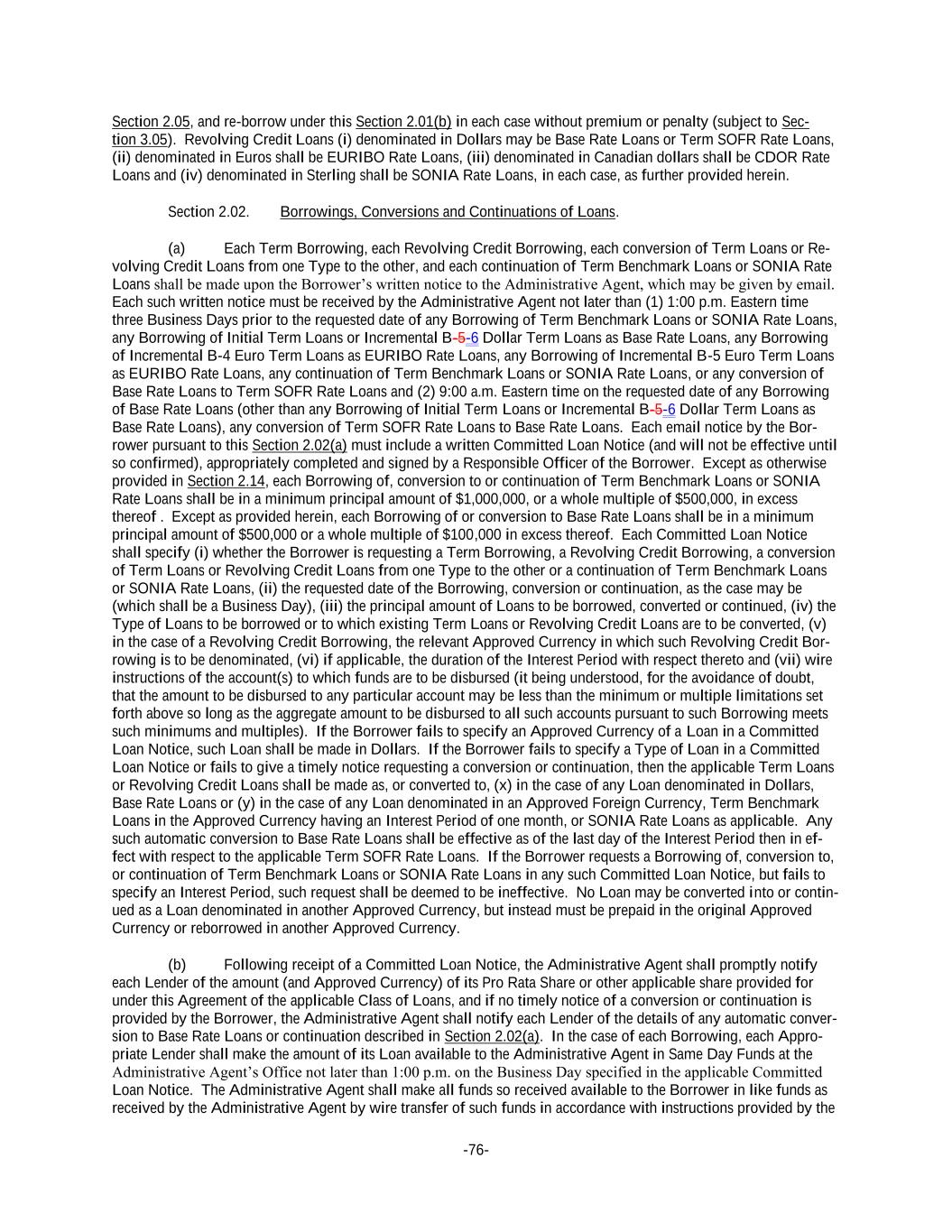 -76- Section 2.05, and re-borrow under this Section 2.01(b) in each case without premium or penalty (subject to Sec- tion 3.05). Revolving Credit Loans (i) denominated in Dollars may be Base Rate Loans or Term SOFR Rate Loans, (ii) denominated in Euros shall be EURIBO Rate Loans, (iii) denominated in Canadian dollars shall be CDOR Rate Loans and (iv) denominated in Sterling shall be SONIA Rate Loans, in each case, as further provided herein. Section 2.02. Borrowings, Conversions and Continuations of Loans. (a) Each Term Borrowing, each Revolving Credit Borrowing, each conversion of Term Loans or Re- volving Credit Loans from one Type to the other, and each continuation of Term Benchmark Loans or SONIA Rate Loans shall be made upon the Borrower’s written notice to the Administrative Agent, which may be given by email. Each such written notice must be received by the Administrative Agent not later than (1) 1:00 p.m. Eastern time three Business Days prior to the requested date of any Borrowing of Term Benchmark Loans or SONIA Rate Loans, any Borrowing of Initial Term Loans or Incremental B-5-6 Dollar Term Loans as Base Rate Loans, any Borrowing of Incremental B-4 Euro Term Loans as EURIBO Rate Loans, any Borrowing of Incremental B-5 Euro Term Loans as EURIBO Rate Loans, any continuation of Term Benchmark Loans or SONIA Rate Loans, or any conversion of Base Rate Loans to Term SOFR Rate Loans and (2) 9:00 a.m. Eastern time on the requested date of any Borrowing of Base Rate Loans (other than any Borrowing of Initial Term Loans or Incremental B-5-6 Dollar Term Loans as Base Rate Loans), any conversion of Term SOFR Rate Loans to Base Rate Loans. Each email notice by the Bor- rower pursuant to this Section 2.02(a) must include a written Committed Loan Notice (and will not be effective until so confirmed), appropriately completed and signed by a Responsible Officer of the Borrower. Except as otherwise provided in Section 2.14, each Borrowing of, conversion to or continuation of Term Benchmark Loans or SONIA Rate Loans shall be in a minimum principal amount of $1,000,000, or a whole multiple of $500,000, in excess thereof . Except as provided herein, each Borrowing of or conversion to Base Rate Loans shall be in a minimum principal amount of $500,000 or a whole multiple of $100,000 in excess thereof. Each Committed Loan Notice shall specify (i) whether the Borrower is requesting a Term Borrowing, a Revolving Credit Borrowing, a conversion of Term Loans or Revolving Credit Loans from one Type to the other or a continuation of Term Benchmark Loans or SONIA Rate Loans, (ii) the requested date of the Borrowing, conversion or continuation, as the case may be (which shall be a Business Day), (iii) the principal amount of Loans to be borrowed, converted or continued, (iv) the Type of Loans to be borrowed or to which existing Term Loans or Revolving Credit Loans are to be converted, (v) in the case of a Revolving Credit Borrowing, the relevant Approved Currency in which such Revolving Credit Bor- rowing is to be denominated, (vi) if applicable, the duration of the Interest Period with respect thereto and (vii) wire instructions of the account(s) to which funds are to be disbursed (it being understood, for the avoidance of doubt, that the amount to be disbursed to any particular account may be less than the minimum or multiple limitations set forth above so long as the aggregate amount to be disbursed to all such accounts pursuant to such Borrowing meets such minimums and multiples). If the Borrower fails to specify an Approved Currency of a Loan in a Committed Loan Notice, such Loan shall be made in Dollars. If the Borrower fails to specify a Type of Loan in a Committed Loan Notice or fails to give a timely notice requesting a conversion or continuation, then the applicable Term Loans or Revolving Credit Loans shall be made as, or converted to, (x) in the case of any Loan denominated in Dollars, Base Rate Loans or (y) in the case of any Loan denominated in an Approved Foreign Currency, Term Benchmark Loans in the Approved Currency having an Interest Period of one month, or SONIA Rate Loans as applicable. Any such automatic conversion to Base Rate Loans shall be effective as of the last day of the Interest Period then in ef- fect with respect to the applicable Term SOFR Rate Loans. If the Borrower requests a Borrowing of, conversion to, or continuation of Term Benchmark Loans or SONIA Rate Loans in any such Committed Loan Notice, but fails to specify an Interest Period, such request shall be deemed to be ineffective. No Loan may be converted into or contin- ued as a Loan denominated in another Approved Currency, but instead must be prepaid in the original Approved Currency or reborrowed in another Approved Currency. (b) Following receipt of a Committed Loan Notice, the Administrative Agent shall promptly notify each Lender of the amount (and Approved Currency) of its Pro Rata Share or other applicable share provided for under this Agreement of the applicable Class of Loans, and if no timely notice of a conversion or continuation is provided by the Borrower, the Administrative Agent shall notify each Lender of the details of any automatic conver- sion to Base Rate Loans or continuation described in Section 2.02(a). In the case of each Borrowing, each Appro- priate Lender shall make the amount of its Loan available to the Administrative Agent in Same Day Funds at the Administrative Agent’s Office not later than 1:00 p.m. on the Business Day specified in the applicable Committed Loan Notice. The Administrative Agent shall make all funds so received available to the Borrower in like funds as received by the Administrative Agent by wire transfer of such funds in accordance with instructions provided by the