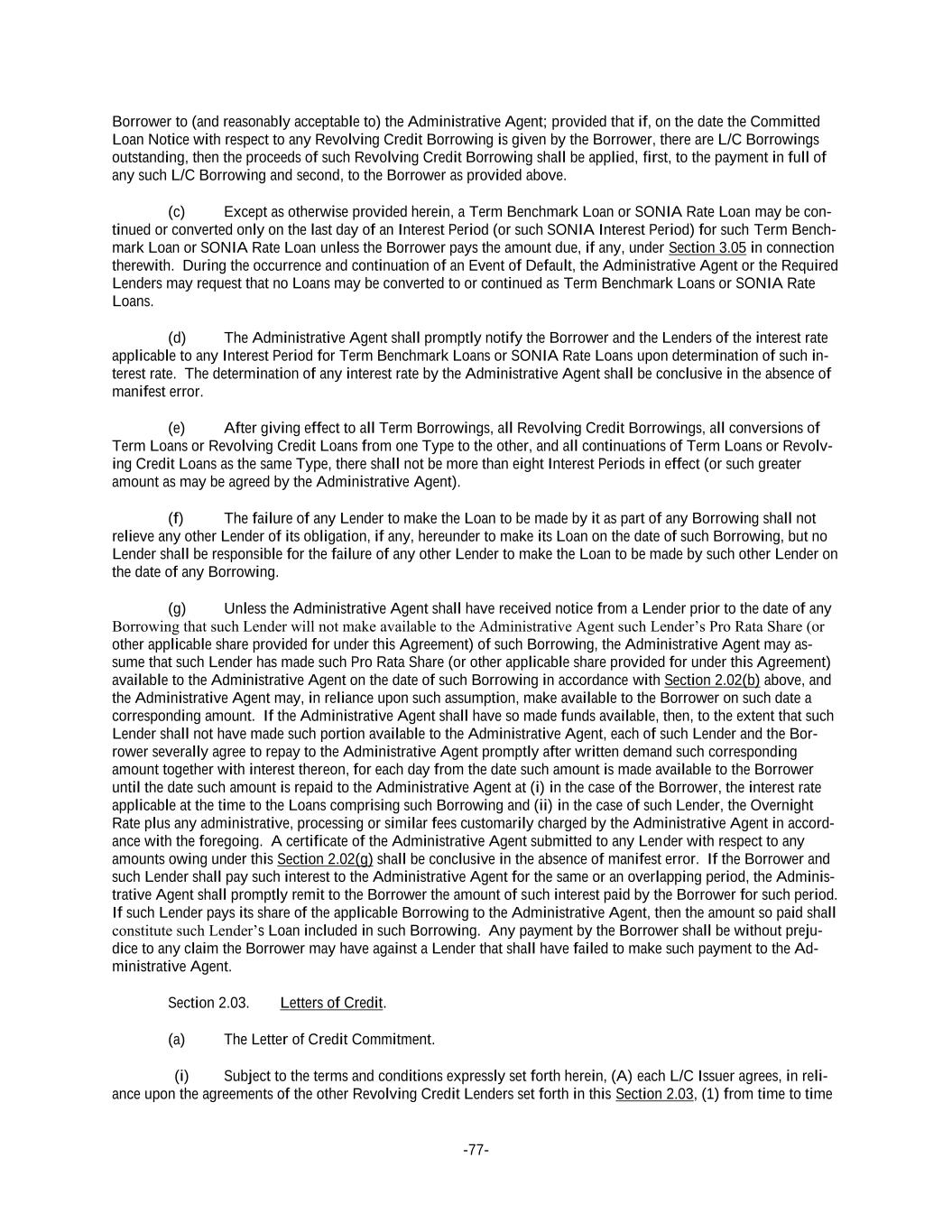 -77- Borrower to (and reasonably acceptable to) the Administrative Agent; provided that if, on the date the Committed Loan Notice with respect to any Revolving Credit Borrowing is given by the Borrower, there are L/C Borrowings outstanding, then the proceeds of such Revolving Credit Borrowing shall be applied, first, to the payment in full of any such L/C Borrowing and second, to the Borrower as provided above. (c) Except as otherwise provided herein, a Term Benchmark Loan or SONIA Rate Loan may be con- tinued or converted only on the last day of an Interest Period (or such SONIA Interest Period) for such Term Bench- mark Loan or SONIA Rate Loan unless the Borrower pays the amount due, if any, under Section 3.05 in connection therewith. During the occurrence and continuation of an Event of Default, the Administrative Agent or the Required Lenders may request that no Loans may be converted to or continued as Term Benchmark Loans or SONIA Rate Loans. (d) The Administrative Agent shall promptly notify the Borrower and the Lenders of the interest rate applicable to any Interest Period for Term Benchmark Loans or SONIA Rate Loans upon determination of such in- terest rate. The determination of any interest rate by the Administrative Agent shall be conclusive in the absence of manifest error. (e) After giving effect to all Term Borrowings, all Revolving Credit Borrowings, all conversions of Term Loans or Revolving Credit Loans from one Type to the other, and all continuations of Term Loans or Revolv- ing Credit Loans as the same Type, there shall not be more than eight Interest Periods in effect (or such greater amount as may be agreed by the Administrative Agent). (f) The failure of any Lender to make the Loan to be made by it as part of any Borrowing shall not relieve any other Lender of its obligation, if any, hereunder to make its Loan on the date of such Borrowing, but no Lender shall be responsible for the failure of any other Lender to make the Loan to be made by such other Lender on the date of any Borrowing. (g) Unless the Administrative Agent shall have received notice from a Lender prior to the date of any Borrowing that such Lender will not make available to the Administrative Agent such Lender’s Pro Rata Share (or other applicable share provided for under this Agreement) of such Borrowing, the Administrative Agent may as- sume that such Lender has made such Pro Rata Share (or other applicable share provided for under this Agreement) available to the Administrative Agent on the date of such Borrowing in accordance with Section 2.02(b) above, and the Administrative Agent may, in reliance upon such assumption, make available to the Borrower on such date a corresponding amount. If the Administrative Agent shall have so made funds available, then, to the extent that such Lender shall not have made such portion available to the Administrative Agent, each of such Lender and the Bor- rower severally agree to repay to the Administrative Agent promptly after written demand such corresponding amount together with interest thereon, for each day from the date such amount is made available to the Borrower until the date such amount is repaid to the Administrative Agent at (i) in the case of the Borrower, the interest rate applicable at the time to the Loans comprising such Borrowing and (ii) in the case of such Lender, the Overnight Rate plus any administrative, processing or similar fees customarily charged by the Administrative Agent in accord- ance with the foregoing. A certificate of the Administrative Agent submitted to any Lender with respect to any amounts owing under this Section 2.02(g) shall be conclusive in the absence of manifest error. If the Borrower and such Lender shall pay such interest to the Administrative Agent for the same or an overlapping period, the Adminis- trative Agent shall promptly remit to the Borrower the amount of such interest paid by the Borrower for such period. If such Lender pays its share of the applicable Borrowing to the Administrative Agent, then the amount so paid shall constitute such Lender’s Loan included in such Borrowing. Any payment by the Borrower shall be without preju- dice to any claim the Borrower may have against a Lender that shall have failed to make such payment to the Ad- ministrative Agent. Section 2.03. Letters of Credit. (a) The Letter of Credit Commitment. (i) Subject to the terms and conditions expressly set forth herein, (A) each L/C Issuer agrees, in reli- ance upon the agreements of the other Revolving Credit Lenders set forth in this Section 2.03, (1) from time to time