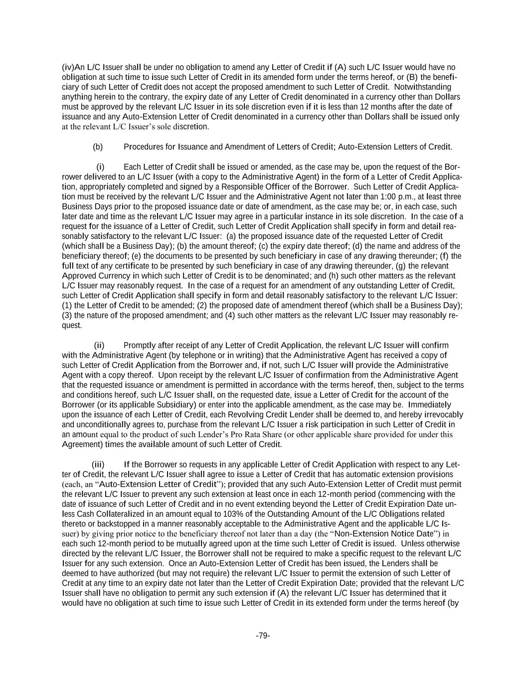 -79- (iv)An L/C Issuer shall be under no obligation to amend any Letter of Credit if (A) such L/C Issuer would have no obligation at such time to issue such Letter of Credit in its amended form under the terms hereof, or (B) the benefi- ciary of such Letter of Credit does not accept the proposed amendment to such Letter of Credit. Notwithstanding anything herein to the contrary, the expiry date of any Letter of Credit denominated in a currency other than Dollars must be approved by the relevant L/C Issuer in its sole discretion even if it is less than 12 months after the date of issuance and any Auto-Extension Letter of Credit denominated in a currency other than Dollars shall be issued only at the relevant L/C Issuer’s sole discretion. (b) Procedures for Issuance and Amendment of Letters of Credit; Auto-Extension Letters of Credit. (i) Each Letter of Credit shall be issued or amended, as the case may be, upon the request of the Bor- rower delivered to an L/C Issuer (with a copy to the Administrative Agent) in the form of a Letter of Credit Applica- tion, appropriately completed and signed by a Responsible Officer of the Borrower. Such Letter of Credit Applica- tion must be received by the relevant L/C Issuer and the Administrative Agent not later than 1:00 p.m., at least three Business Days prior to the proposed issuance date or date of amendment, as the case may be; or, in each case, such later date and time as the relevant L/C Issuer may agree in a particular instance in its sole discretion. In the case of a request for the issuance of a Letter of Credit, such Letter of Credit Application shall specify in form and detail rea- sonably satisfactory to the relevant L/C Issuer: (a) the proposed issuance date of the requested Letter of Credit (which shall be a Business Day); (b) the amount thereof; (c) the expiry date thereof; (d) the name and address of the beneficiary thereof; (e) the documents to be presented by such beneficiary in case of any drawing thereunder; (f) the full text of any certificate to be presented by such beneficiary in case of any drawing thereunder, (g) the relevant Approved Currency in which such Letter of Credit is to be denominated; and (h) such other matters as the relevant L/C Issuer may reasonably request. In the case of a request for an amendment of any outstanding Letter of Credit, such Letter of Credit Application shall specify in form and detail reasonably satisfactory to the relevant L/C Issuer: (1) the Letter of Credit to be amended; (2) the proposed date of amendment thereof (which shall be a Business Day); (3) the nature of the proposed amendment; and (4) such other matters as the relevant L/C Issuer may reasonably re- quest. (ii) Promptly after receipt of any Letter of Credit Application, the relevant L/C Issuer will confirm with the Administrative Agent (by telephone or in writing) that the Administrative Agent has received a copy of such Letter of Credit Application from the Borrower and, if not, such L/C Issuer will provide the Administrative Agent with a copy thereof. Upon receipt by the relevant L/C Issuer of confirmation from the Administrative Agent that the requested issuance or amendment is permitted in accordance with the terms hereof, then, subject to the terms and conditions hereof, such L/C Issuer shall, on the requested date, issue a Letter of Credit for the account of the Borrower (or its applicable Subsidiary) or enter into the applicable amendment, as the case may be. Immediately upon the issuance of each Letter of Credit, each Revolving Credit Lender shall be deemed to, and hereby irrevocably and unconditionally agrees to, purchase from the relevant L/C Issuer a risk participation in such Letter of Credit in an amount equal to the product of such Lender’s Pro Rata Share (or other applicable share provided for under this Agreement) times the available amount of such Letter of Credit. (iii) If the Borrower so requests in any applicable Letter of Credit Application with respect to any Let- ter of Credit, the relevant L/C Issuer shall agree to issue a Letter of Credit that has automatic extension provisions (each, an “Auto-Extension Letter of Credit”); provided that any such Auto-Extension Letter of Credit must permit the relevant L/C Issuer to prevent any such extension at least once in each 12-month period (commencing with the date of issuance of such Letter of Credit and in no event extending beyond the Letter of Credit Expiration Date un- less Cash Collateralized in an amount equal to 103% of the Outstanding Amount of the L/C Obligations related thereto or backstopped in a manner reasonably acceptable to the Administrative Agent and the applicable L/C Is- suer) by giving prior notice to the beneficiary thereof not later than a day (the “Non-Extension Notice Date”) in each such 12-month period to be mutually agreed upon at the time such Letter of Credit is issued. Unless otherwise directed by the relevant L/C Issuer, the Borrower shall not be required to make a specific request to the relevant L/C Issuer for any such extension. Once an Auto-Extension Letter of Credit has been issued, the Lenders shall be deemed to have authorized (but may not require) the relevant L/C Issuer to permit the extension of such Letter of Credit at any time to an expiry date not later than the Letter of Credit Expiration Date; provided that the relevant L/C Issuer shall have no obligation to permit any such extension if (A) the relevant L/C Issuer has determined that it would have no obligation at such time to issue such Letter of Credit in its extended form under the terms hereof (by