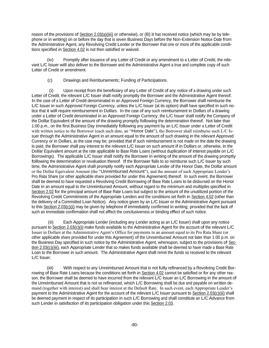 -80- reason of the provisions of Section 2.03(a)(iii) or otherwise), or (B) it has received notice (which may be by tele- phone or in writing) on or before the day that is seven Business Days before the Non-Extension Notice Date from the Administrative Agent, any Revolving Credit Lender or the Borrower that one or more of the applicable condi- tions specified in Section 4.02 is not then satisfied or waived. (iv) Promptly after issuance of any Letter of Credit or any amendment to a Letter of Credit, the rele- vant L/C Issuer will also deliver to the Borrower and the Administrative Agent a true and complete copy of such Letter of Credit or amendment. (c) Drawings and Reimbursements; Funding of Participations. (i) Upon receipt from the beneficiary of any Letter of Credit of any notice of a drawing under such Letter of Credit, the relevant L/C Issuer shall notify promptly the Borrower and the Administrative Agent thereof. In the case of a Letter of Credit denominated in an Approved Foreign Currency, the Borrower shall reimburse the L/C Issuer in such Approved Foreign Currency, unless the L/C Issuer (at its option) shall have specified in such no- tice that it will require reimbursement in Dollars. In the case of any such reimbursement in Dollars of a drawing under a Letter of Credit denominated in an Approved Foreign Currency, the L/C Issuer shall notify the Company of the Dollar Equivalent of the amount of the drawing promptly following the determination thereof. Not later than 1:00 p.m., on the first Business Day immediately following any payment by an L/C Issuer under a Letter of Credit with written notice to the Borrower (each such date, an “Honor Date”), the Borrower shall reimburse such L/C Is- suer through the Administrative Agent in an amount equal to the amount of such drawing in the relevant Approved Currency or in Dollars, as the case may be; provided that if such reimbursement is not made on the date the drawing is paid, the Borrower shall pay interest to the relevant L/C Issuer on such amount if in Dollars or, otherwise, in the Dollar Equivalent amount at the rate applicable to Base Rate Loans (without duplication of interest payable on L/C Borrowings). The applicable L/C Issuer shall notify the Borrower in writing of the amount of the drawing promptly following the determination or revaluation thereof. If the Borrower fails to so reimburse such L/C Issuer by such time, the Administrative Agent shall promptly notify each Appropriate Lender of the Honor Date, the Dollar amount or the Dollar Equivalent Amount (the “Unreimbursed Amount”), and the amount of such Appropriate Lender’s Pro Rata Share (or other applicable share provided for under this Agreement) thereof. In such event, the Borrower shall be deemed to have requested a Revolving Credit Borrowing of Base Rate Loans to be disbursed on the Honor Date in an amount equal to the Unreimbursed Amount, without regard to the minimum and multiples specified in Section 2.02 for the principal amount of Base Rate Loans but subject to the amount of the unutilized portion of the Revolving Credit Commitments of the Appropriate Lenders and the conditions set forth in Section 4.02 (other than the delivery of a Committed Loan Notice). Any notice given by an L/C Issuer or the Administrative Agent pursuant to this Section 2.03(c)(i) may be given by telephone if immediately confirmed in writing; provided that the lack of such an immediate confirmation shall not affect the conclusiveness or binding effect of such notice. (ii) Each Appropriate Lender (including any Lender acting as an L/C Issuer) shall upon any notice pursuant to Section 2.03(c)(i) make funds available to the Administrative Agent for the account of the relevant L/C Issuer in Dollars at the Administrative Agent’s Office for payments in an amount equal to its Pro Rata Share (or other applicable share provided for under this Agreement) of the Unreimbursed Amount not later than 1:00 p.m. on the Business Day specified in such notice by the Administrative Agent, whereupon, subject to the provisions of Sec- tion 2.03(c)(iii), each Appropriate Lender that so makes funds available shall be deemed to have made a Base Rate Loan to the Borrower in such amount. The Administrative Agent shall remit the funds so received to the relevant L/C Issuer. (iii) With respect to any Unreimbursed Amount that is not fully refinanced by a Revolving Credit Bor- rowing of Base Rate Loans because the conditions set forth in Section 4.02 cannot be satisfied or for any other rea- son, the Borrower shall be deemed to have incurred from the relevant L/C Issuer an L/C Borrowing in the amount of the Unreimbursed Amount that is not so refinanced, which L/C Borrowing shall be due and payable on written de- mand (together with interest) and shall bear interest at the Default Rate. In such event, each Appropriate Lender’s payment to the Administrative Agent for the account of the relevant L/C Issuer pursuant to Section 2.03(c)(ii) shall be deemed payment in respect of its participation in such L/C Borrowing and shall constitute an L/C Advance from such Lender in satisfaction of its participation obligation under this Section 2.03.