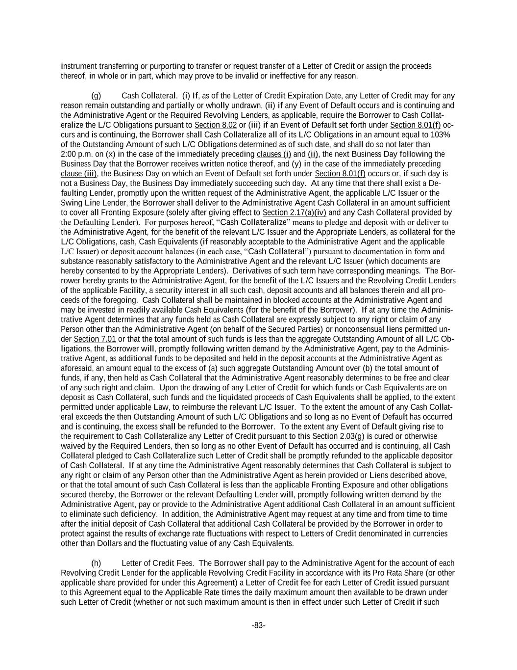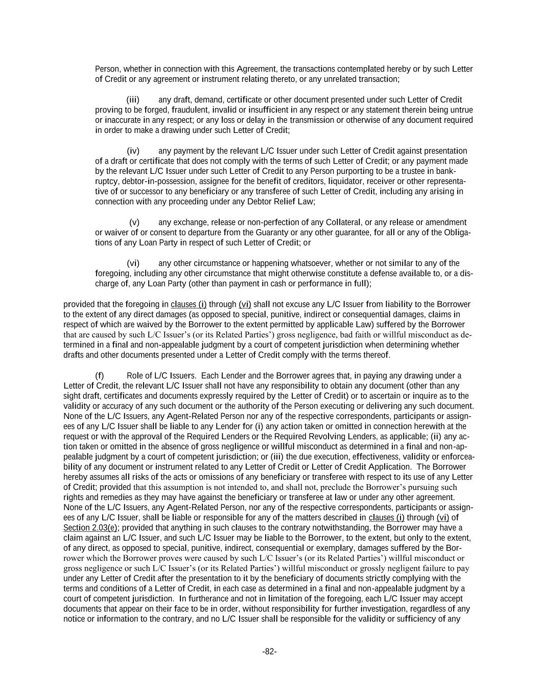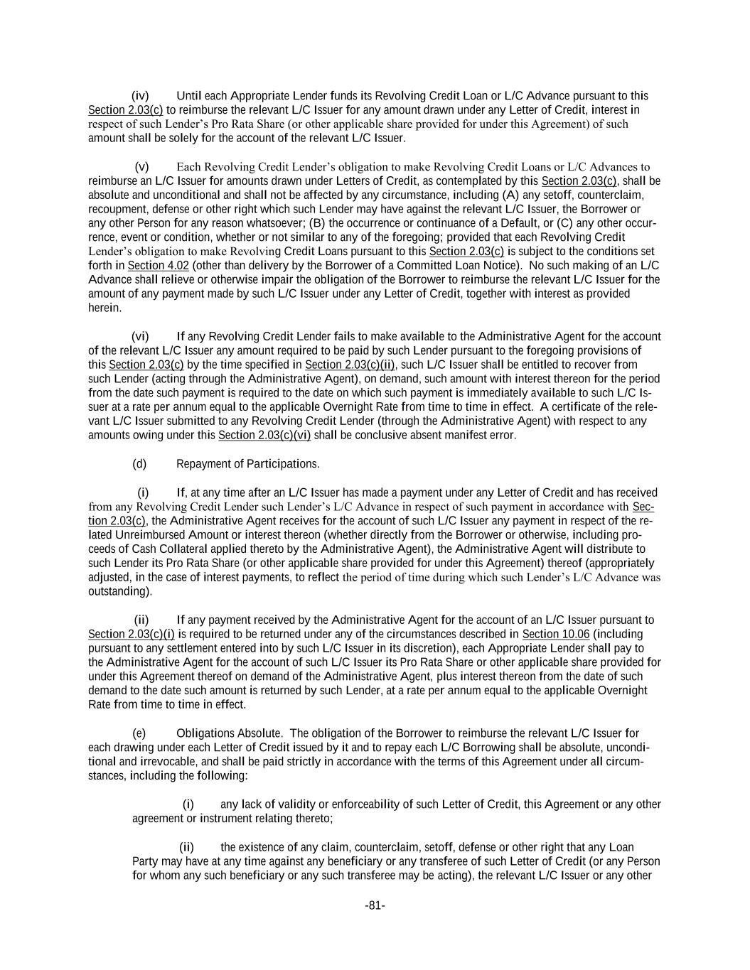 -81- (iv) Until each Appropriate Lender funds its Revolving Credit Loan or L/C Advance pursuant to this Section 2.03(c) to reimburse the relevant L/C Issuer for any amount drawn under any Letter of Credit, interest in respect of such Lender’s Pro Rata Share (or other applicable share provided for under this Agreement) of such amount shall be solely for the account of the relevant L/C Issuer. (v) Each Revolving Credit Lender’s obligation to make Revolving Credit Loans or L/C Advances to reimburse an L/C Issuer for amounts drawn under Letters of Credit, as contemplated by this Section 2.03(c), shall be absolute and unconditional and shall not be affected by any circumstance, including (A) any setoff, counterclaim, recoupment, defense or other right which such Lender may have against the relevant L/C Issuer, the Borrower or any other Person for any reason whatsoever; (B) the occurrence or continuance of a Default, or (C) any other occur- rence, event or condition, whether or not similar to any of the foregoing; provided that each Revolving Credit Lender’s obligation to make Revolving Credit Loans pursuant to this Section 2.03(c) is subject to the conditions set forth in Section 4.02 (other than delivery by the Borrower of a Committed Loan Notice). No such making of an L/C Advance shall relieve or otherwise impair the obligation of the Borrower to reimburse the relevant L/C Issuer for the amount of any payment made by such L/C Issuer under any Letter of Credit, together with interest as provided herein. (vi) If any Revolving Credit Lender fails to make available to the Administrative Agent for the account of the relevant L/C Issuer any amount required to be paid by such Lender pursuant to the foregoing provisions of this Section 2.03(c) by the time specified in Section 2.03(c)(ii), such L/C Issuer shall be entitled to recover from such Lender (acting through the Administrative Agent), on demand, such amount with interest thereon for the period from the date such payment is required to the date on which such payment is immediately available to such L/C Is- suer at a rate per annum equal to the applicable Overnight Rate from time to time in effect. A certificate of the rele- vant L/C Issuer submitted to any Revolving Credit Lender (through the Administrative Agent) with respect to any amounts owing under this Section 2.03(c)(vi) shall be conclusive absent manifest error. (d) Repayment of Participations. (i) If, at any time after an L/C Issuer has made a payment under any Letter of Credit and has received from any Revolving Credit Lender such Lender’s L/C Advance in respect of such payment in accordance with Sec- tion 2.03(c), the Administrative Agent receives for the account of such L/C Issuer any payment in respect of the re- lated Unreimbursed Amount or interest thereon (whether directly from the Borrower or otherwise, including pro- ceeds of Cash Collateral applied thereto by the Administrative Agent), the Administrative Agent will distribute to such Lender its Pro Rata Share (or other applicable share provided for under this Agreement) thereof (appropriately adjusted, in the case of interest payments, to reflect the period of time during which such Lender’s L/C Advance was outstanding). (ii) If any payment received by the Administrative Agent for the account of an L/C Issuer pursuant to Section 2.03(c)(i) is required to be returned under any of the circumstances described in Section 10.06 (including pursuant to any settlement entered into by such L/C Issuer in its discretion), each Appropriate Lender shall pay to the Administrative Agent for the account of such L/C Issuer its Pro Rata Share or other applicable share provided for under this Agreement thereof on demand of the Administrative Agent, plus interest thereon from the date of such demand to the date such amount is returned by such Lender, at a rate per annum equal to the applicable Overnight Rate from time to time in effect. (e) Obligations Absolute. The obligation of the Borrower to reimburse the relevant L/C Issuer for each drawing under each Letter of Credit issued by it and to repay each L/C Borrowing shall be absolute, uncondi- tional and irrevocable, and shall be paid strictly in accordance with the terms of this Agreement under all circum- stances, including the following: (i) any lack of validity or enforceability of such Letter of Credit, this Agreement or any other agreement or instrument relating thereto; (ii) the existence of any claim, counterclaim, setoff, defense or other right that any Loan Party may have at any time against any beneficiary or any transferee of such Letter of Credit (or any Person for whom any such beneficiary or any such transferee may be acting), the relevant L/C Issuer or any other