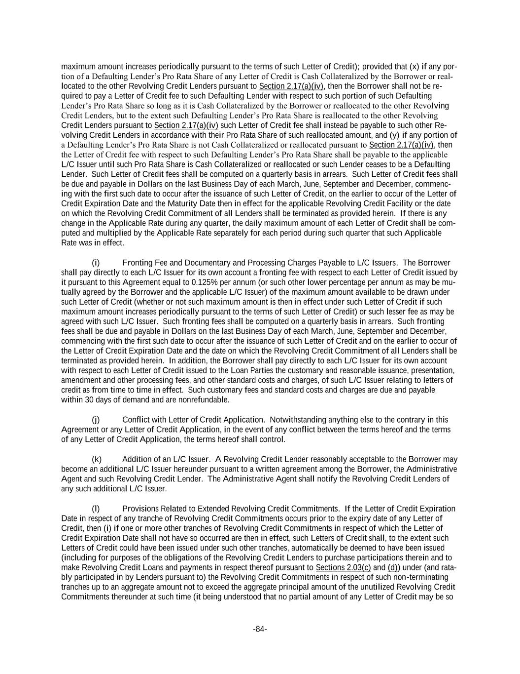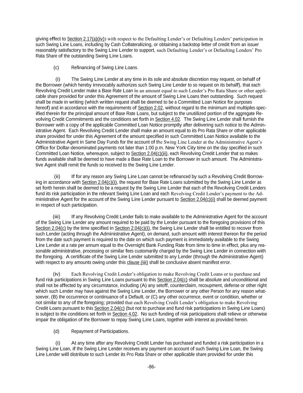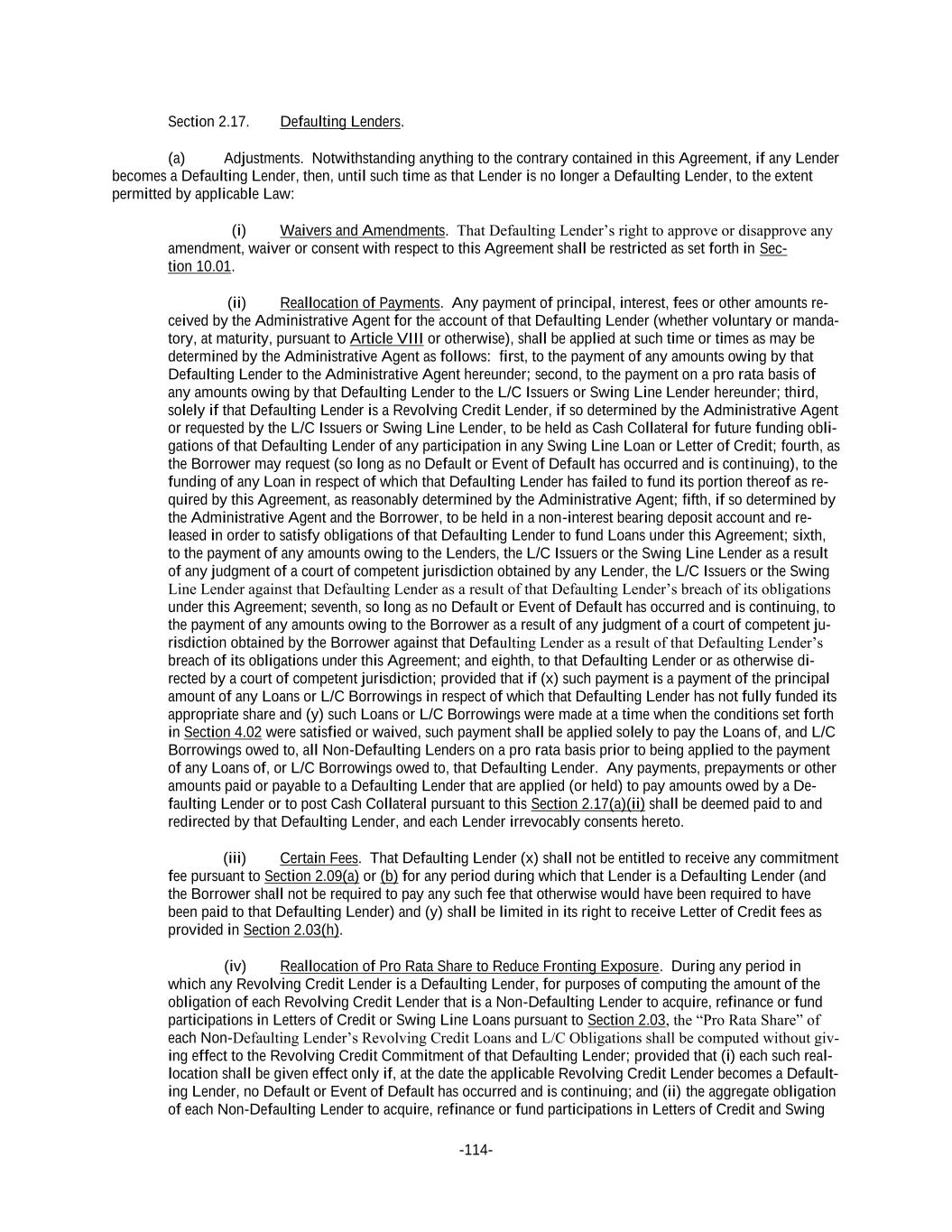 -114- Section 2.17. Defaulting Lenders. (a) Adjustments. Notwithstanding anything to the contrary contained in this Agreement, if any Lender becomes a Defaulting Lender, then, until such time as that Lender is no longer a Defaulting Lender, to the extent permitted by applicable Law: (i) Waivers and Amendments. That Defaulting Lender’s right to approve or disapprove any amendment, waiver or consent with respect to this Agreement shall be restricted as set forth in Sec- tion 10.01. (ii) Reallocation of Payments. Any payment of principal, interest, fees or other amounts re- ceived by the Administrative Agent for the account of that Defaulting Lender (whether voluntary or manda- tory, at maturity, pursuant to Article VIII or otherwise), shall be applied at such time or times as may be determined by the Administrative Agent as follows: first, to the payment of any amounts owing by that Defaulting Lender to the Administrative Agent hereunder; second, to the payment on a pro rata basis of any amounts owing by that Defaulting Lender to the L/C Issuers or Swing Line Lender hereunder; third, solely if that Defaulting Lender is a Revolving Credit Lender, if so determined by the Administrative Agent or requested by the L/C Issuers or Swing Line Lender, to be held as Cash Collateral for future funding obli- gations of that Defaulting Lender of any participation in any Swing Line Loan or Letter of Credit; fourth, as the Borrower may request (so long as no Default or Event of Default has occurred and is continuing), to the funding of any Loan in respect of which that Defaulting Lender has failed to fund its portion thereof as re- quired by this Agreement, as reasonably determined by the Administrative Agent; fifth, if so determined by the Administrative Agent and the Borrower, to be held in a non-interest bearing deposit account and re- leased in order to satisfy obligations of that Defaulting Lender to fund Loans under this Agreement; sixth, to the payment of any amounts owing to the Lenders, the L/C Issuers or the Swing Line Lender as a result of any judgment of a court of competent jurisdiction obtained by any Lender, the L/C Issuers or the Swing Line Lender against that Defaulting Lender as a result of that Defaulting Lender’s breach of its obligations under this Agreement; seventh, so long as no Default or Event of Default has occurred and is continuing, to the payment of any amounts owing to the Borrower as a result of any judgment of a court of competent ju- risdiction obtained by the Borrower against that Defaulting Lender as a result of that Defaulting Lender’s breach of its obligations under this Agreement; and eighth, to that Defaulting Lender or as otherwise di- rected by a court of competent jurisdiction; provided that if (x) such payment is a payment of the principal amount of any Loans or L/C Borrowings in respect of which that Defaulting Lender has not fully funded its appropriate share and (y) such Loans or L/C Borrowings were made at a time when the conditions set forth in Section 4.02 were satisfied or waived, such payment shall be applied solely to pay the Loans of, and L/C Borrowings owed to, all Non-Defaulting Lenders on a pro rata basis prior to being applied to the payment of any Loans of, or L/C Borrowings owed to, that Defaulting Lender. Any payments, prepayments or other amounts paid or payable to a Defaulting Lender that are applied (or held) to pay amounts owed by a De- faulting Lender or to post Cash Collateral pursuant to this Section 2.17(a)(ii) shall be deemed paid to and redirected by that Defaulting Lender, and each Lender irrevocably consents hereto. (iii) Certain Fees. That Defaulting Lender (x) shall not be entitled to receive any commitment fee pursuant to Section 2.09(a) or (b) for any period during which that Lender is a Defaulting Lender (and the Borrower shall not be required to pay any such fee that otherwise would have been required to have been paid to that Defaulting Lender) and (y) shall be limited in its right to receive Letter of Credit fees as provided in Section 2.03(h). (iv) Reallocation of Pro Rata Share to Reduce Fronting Exposure. During any period in which any Revolving Credit Lender is a Defaulting Lender, for purposes of computing the amount of the obligation of each Revolving Credit Lender that is a Non-Defaulting Lender to acquire, refinance or fund participations in Letters of Credit or Swing Line Loans pursuant to Section 2.03, the “Pro Rata Share” of each Non-Defaulting Lender’s Revolving Credit Loans and L/C Obligations shall be computed without giv- ing effect to the Revolving Credit Commitment of that Defaulting Lender; provided that (i) each such real- location shall be given effect only if, at the date the applicable Revolving Credit Lender becomes a Default- ing Lender, no Default or Event of Default has occurred and is continuing; and (ii) the aggregate obligation of each Non-Defaulting Lender to acquire, refinance or fund participations in Letters of Credit and Swing