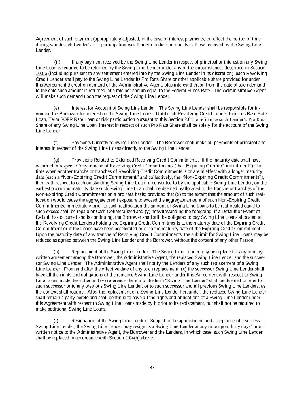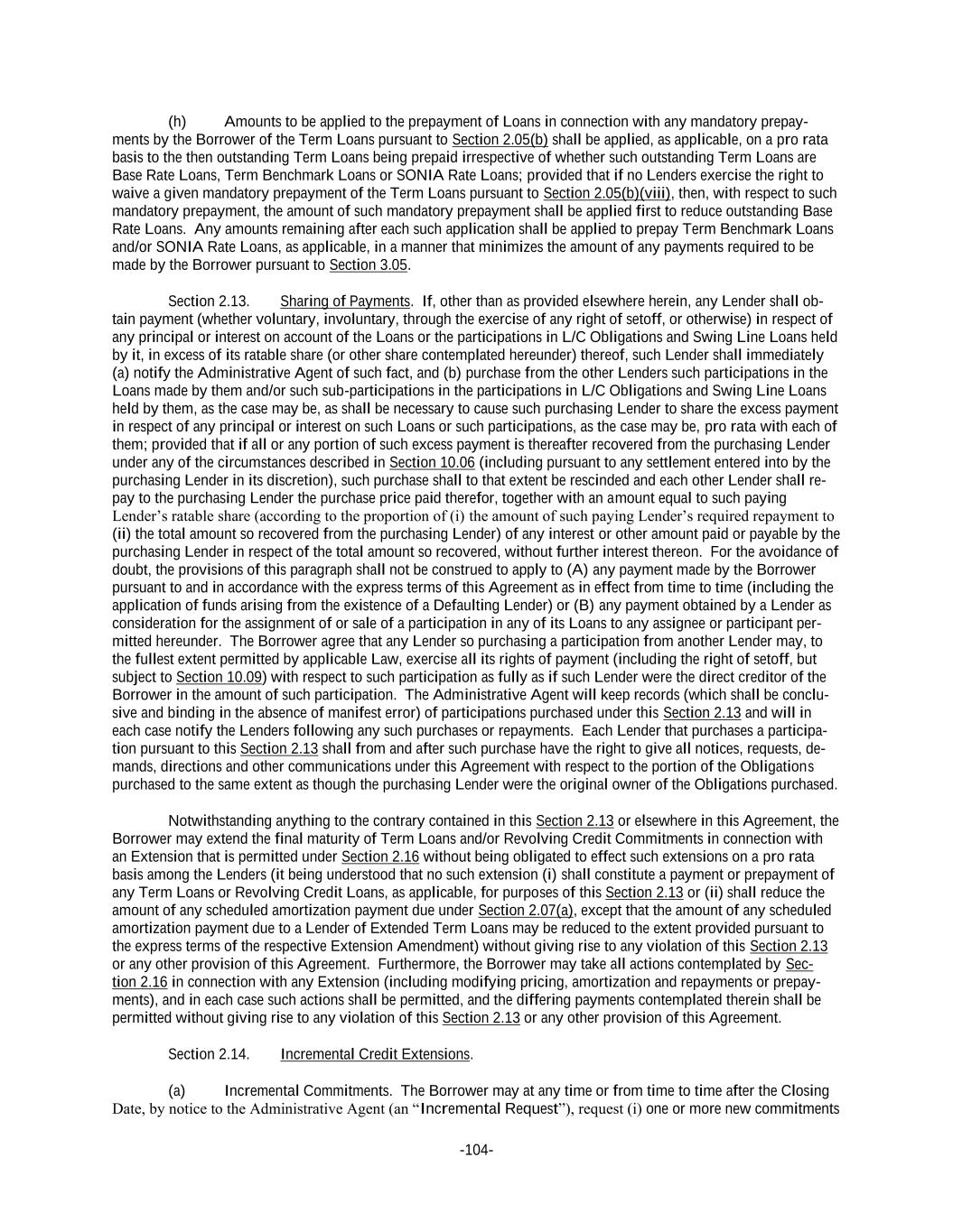 -104- (h) Amounts to be applied to the prepayment of Loans in connection with any mandatory prepay- ments by the Borrower of the Term Loans pursuant to Section 2.05(b) shall be applied, as applicable, on a pro rata basis to the then outstanding Term Loans being prepaid irrespective of whether such outstanding Term Loans are Base Rate Loans, Term Benchmark Loans or SONIA Rate Loans; provided that if no Lenders exercise the right to waive a given mandatory prepayment of the Term Loans pursuant to Section 2.05(b)(viii), then, with respect to such mandatory prepayment, the amount of such mandatory prepayment shall be applied first to reduce outstanding Base Rate Loans. Any amounts remaining after each such application shall be applied to prepay Term Benchmark Loans and/or SONIA Rate Loans, as applicable, in a manner that minimizes the amount of any payments required to be made by the Borrower pursuant to Section 3.05. Section 2.13. Sharing of Payments. If, other than as provided elsewhere herein, any Lender shall ob- tain payment (whether voluntary, involuntary, through the exercise of any right of setoff, or otherwise) in respect of any principal or interest on account of the Loans or the participations in L/C Obligations and Swing Line Loans held by it, in excess of its ratable share (or other share contemplated hereunder) thereof, such Lender shall immediately (a) notify the Administrative Agent of such fact, and (b) purchase from the other Lenders such participations in the Loans made by them and/or such sub-participations in the participations in L/C Obligations and Swing Line Loans held by them, as the case may be, as shall be necessary to cause such purchasing Lender to share the excess payment in respect of any principal or interest on such Loans or such participations, as the case may be, pro rata with each of them; provided that if all or any portion of such excess payment is thereafter recovered from the purchasing Lender under any of the circumstances described in Section 10.06 (including pursuant to any settlement entered into by the purchasing Lender in its discretion), such purchase shall to that extent be rescinded and each other Lender shall re- pay to the purchasing Lender the purchase price paid therefor, together with an amount equal to such paying Lender’s ratable share (according to the proportion of (i) the amount of such paying Lender’s required repayment to (ii) the total amount so recovered from the purchasing Lender) of any interest or other amount paid or payable by the purchasing Lender in respect of the total amount so recovered, without further interest thereon. For the avoidance of doubt, the provisions of this paragraph shall not be construed to apply to (A) any payment made by the Borrower pursuant to and in accordance with the express terms of this Agreement as in effect from time to time (including the application of funds arising from the existence of a Defaulting Lender) or (B) any payment obtained by a Lender as consideration for the assignment of or sale of a participation in any of its Loans to any assignee or participant per- mitted hereunder. The Borrower agree that any Lender so purchasing a participation from another Lender may, to the fullest extent permitted by applicable Law, exercise all its rights of payment (including the right of setoff, but subject to Section 10.09) with respect to such participation as fully as if such Lender were the direct creditor of the Borrower in the amount of such participation. The Administrative Agent will keep records (which shall be conclu- sive and binding in the absence of manifest error) of participations purchased under this Section 2.13 and will in each case notify the Lenders following any such purchases or repayments. Each Lender that purchases a participa- tion pursuant to this Section 2.13 shall from and after such purchase have the right to give all notices, requests, de- mands, directions and other communications under this Agreement with respect to the portion of the Obligations purchased to the same extent as though the purchasing Lender were the original owner of the Obligations purchased. Notwithstanding anything to the contrary contained in this Section 2.13 or elsewhere in this Agreement, the Borrower may extend the final maturity of Term Loans and/or Revolving Credit Commitments in connection with an Extension that is permitted under Section 2.16 without being obligated to effect such extensions on a pro rata basis among the Lenders (it being understood that no such extension (i) shall constitute a payment or prepayment of any Term Loans or Revolving Credit Loans, as applicable, for purposes of this Section 2.13 or (ii) shall reduce the amount of any scheduled amortization payment due under Section 2.07(a), except that the amount of any scheduled amortization payment due to a Lender of Extended Term Loans may be reduced to the extent provided pursuant to the express terms of the respective Extension Amendment) without giving rise to any violation of this Section 2.13 or any other provision of this Agreement. Furthermore, the Borrower may take all actions contemplated by Sec- tion 2.16 in connection with any Extension (including modifying pricing, amortization and repayments or prepay- ments), and in each case such actions shall be permitted, and the differing payments contemplated therein shall be permitted without giving rise to any violation of this Section 2.13 or any other provision of this Agreement. Section 2.14. Incremental Credit Extensions. (a) Incremental Commitments. The Borrower may at any time or from time to time after the Closing Date, by notice to the Administrative Agent (an “Incremental Request”), request (i) one or more new commitments