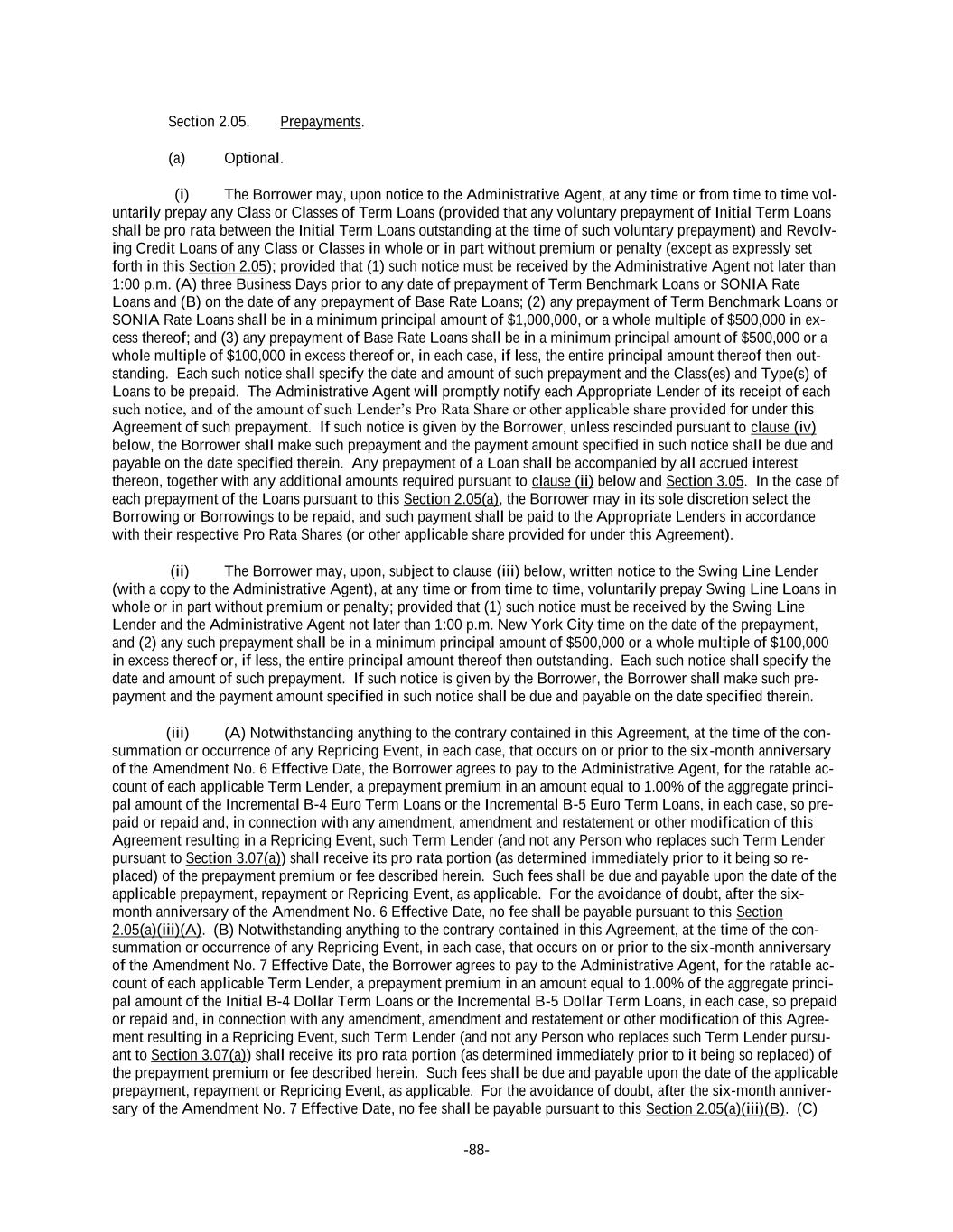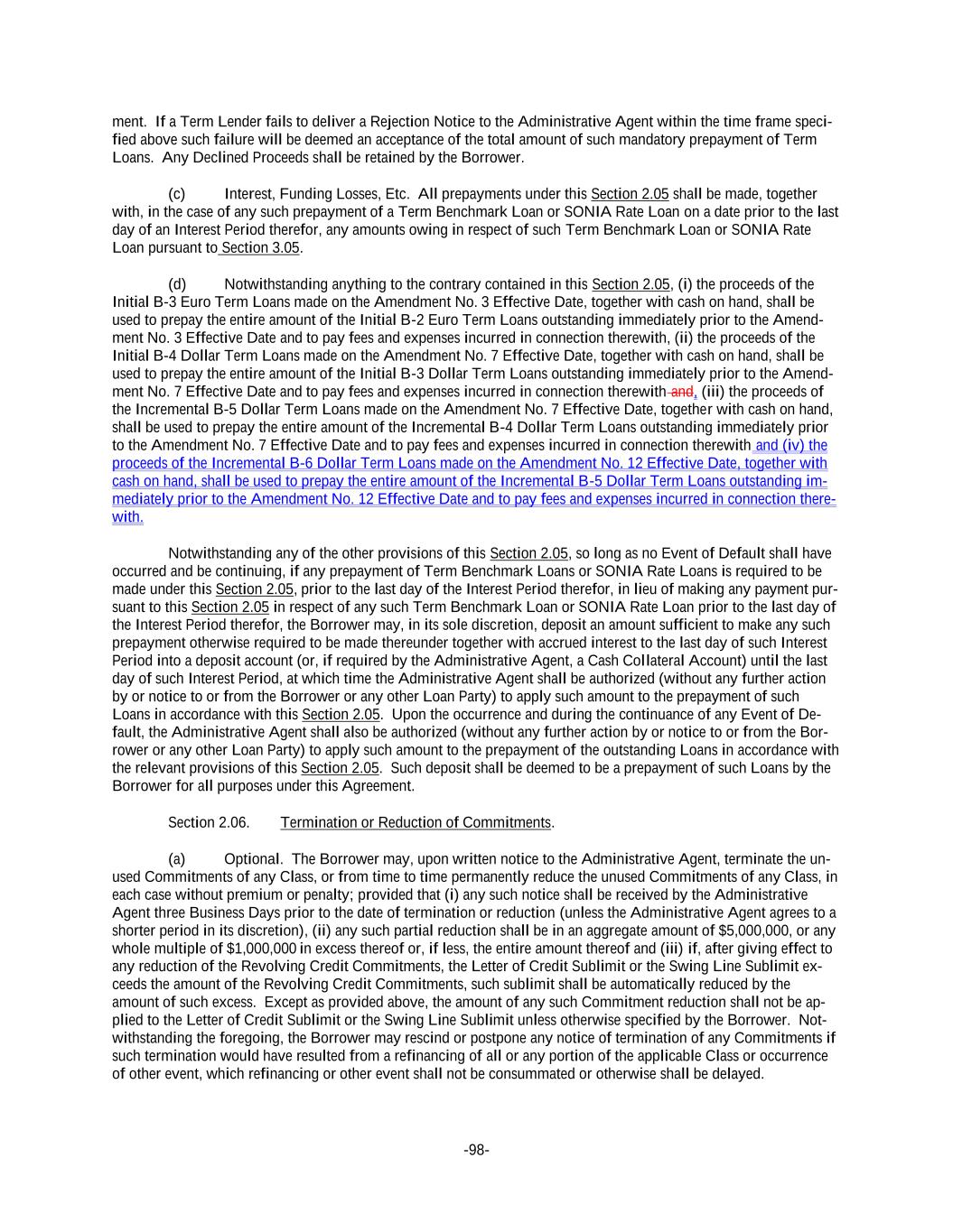 -98- ment. If a Term Lender fails to deliver a Rejection Notice to the Administrative Agent within the time frame speci- fied above such failure will be deemed an acceptance of the total amount of such mandatory prepayment of Term Loans. Any Declined Proceeds shall be retained by the Borrower. (c) Interest, Funding Losses, Etc. All prepayments under this Section 2.05 shall be made, together with, in the case of any such prepayment of a Term Benchmark Loan or SONIA Rate Loan on a date prior to the last day of an Interest Period therefor, any amounts owing in respect of such Term Benchmark Loan or SONIA Rate Loan pursuant to Section 3.05. (d) Notwithstanding anything to the contrary contained in this Section 2.05, (i) the proceeds of the Initial B-3 Euro Term Loans made on the Amendment No. 3 Effective Date, together with cash on hand, shall be used to prepay the entire amount of the Initial B-2 Euro Term Loans outstanding immediately prior to the Amend- ment No. 3 Effective Date and to pay fees and expenses incurred in connection therewith, (ii) the proceeds of the Initial B-4 Dollar Term Loans made on the Amendment No. 7 Effective Date, together with cash on hand, shall be used to prepay the entire amount of the Initial B-3 Dollar Term Loans outstanding immediately prior to the Amend- ment No. 7 Effective Date and to pay fees and expenses incurred in connection therewith and, (iii) the proceeds of the Incremental B-5 Dollar Term Loans made on the Amendment No. 7 Effective Date, together with cash on hand, shall be used to prepay the entire amount of the Incremental B-4 Dollar Term Loans outstanding immediately prior to the Amendment No. 7 Effective Date and to pay fees and expenses incurred in connection therewith and (iv) the proceeds of the Incremental B-6 Dollar Term Loans made on the Amendment No. 12 Effective Date, together with cash on hand, shall be used to prepay the entire amount of the Incremental B-5 Dollar Term Loans outstanding im- mediately prior to the Amendment No. 12 Effective Date and to pay fees and expenses incurred in connection there- with. Notwithstanding any of the other provisions of this Section 2.05, so long as no Event of Default shall have occurred and be continuing, if any prepayment of Term Benchmark Loans or SONIA Rate Loans is required to be made under this Section 2.05, prior to the last day of the Interest Period therefor, in lieu of making any payment pur- suant to this Section 2.05 in respect of any such Term Benchmark Loan or SONIA Rate Loan prior to the last day of the Interest Period therefor, the Borrower may, in its sole discretion, deposit an amount sufficient to make any such prepayment otherwise required to be made thereunder together with accrued interest to the last day of such Interest Period into a deposit account (or, if required by the Administrative Agent, a Cash Collateral Account) until the last day of such Interest Period, at which time the Administrative Agent shall be authorized (without any further action by or notice to or from the Borrower or any other Loan Party) to apply such amount to the prepayment of such Loans in accordance with this Section 2.05. Upon the occurrence and during the continuance of any Event of De- fault, the Administrative Agent shall also be authorized (without any further action by or notice to or from the Bor- rower or any other Loan Party) to apply such amount to the prepayment of the outstanding Loans in accordance with the relevant provisions of this Section 2.05. Such deposit shall be deemed to be a prepayment of such Loans by the Borrower for all purposes under this Agreement. Section 2.06. Termination or Reduction of Commitments. (a) Optional. The Borrower may, upon written notice to the Administrative Agent, terminate the un- used Commitments of any Class, or from time to time permanently reduce the unused Commitments of any Class, in each case without premium or penalty; provided that (i) any such notice shall be received by the Administrative Agent three Business Days prior to the date of termination or reduction (unless the Administrative Agent agrees to a shorter period in its discretion), (ii) any such partial reduction shall be in an aggregate amount of $5,000,000, or any whole multiple of $1,000,000 in excess thereof or, if less, the entire amount thereof and (iii) if, after giving effect to any reduction of the Revolving Credit Commitments, the Letter of Credit Sublimit or the Swing Line Sublimit ex- ceeds the amount of the Revolving Credit Commitments, such sublimit shall be automatically reduced by the amount of such excess. Except as provided above, the amount of any such Commitment reduction shall not be ap- plied to the Letter of Credit Sublimit or the Swing Line Sublimit unless otherwise specified by the Borrower. Not- withstanding the foregoing, the Borrower may rescind or postpone any notice of termination of any Commitments if such termination would have resulted from a refinancing of all or any portion of the applicable Class or occurrence of other event, which refinancing or other event shall not be consummated or otherwise shall be delayed.