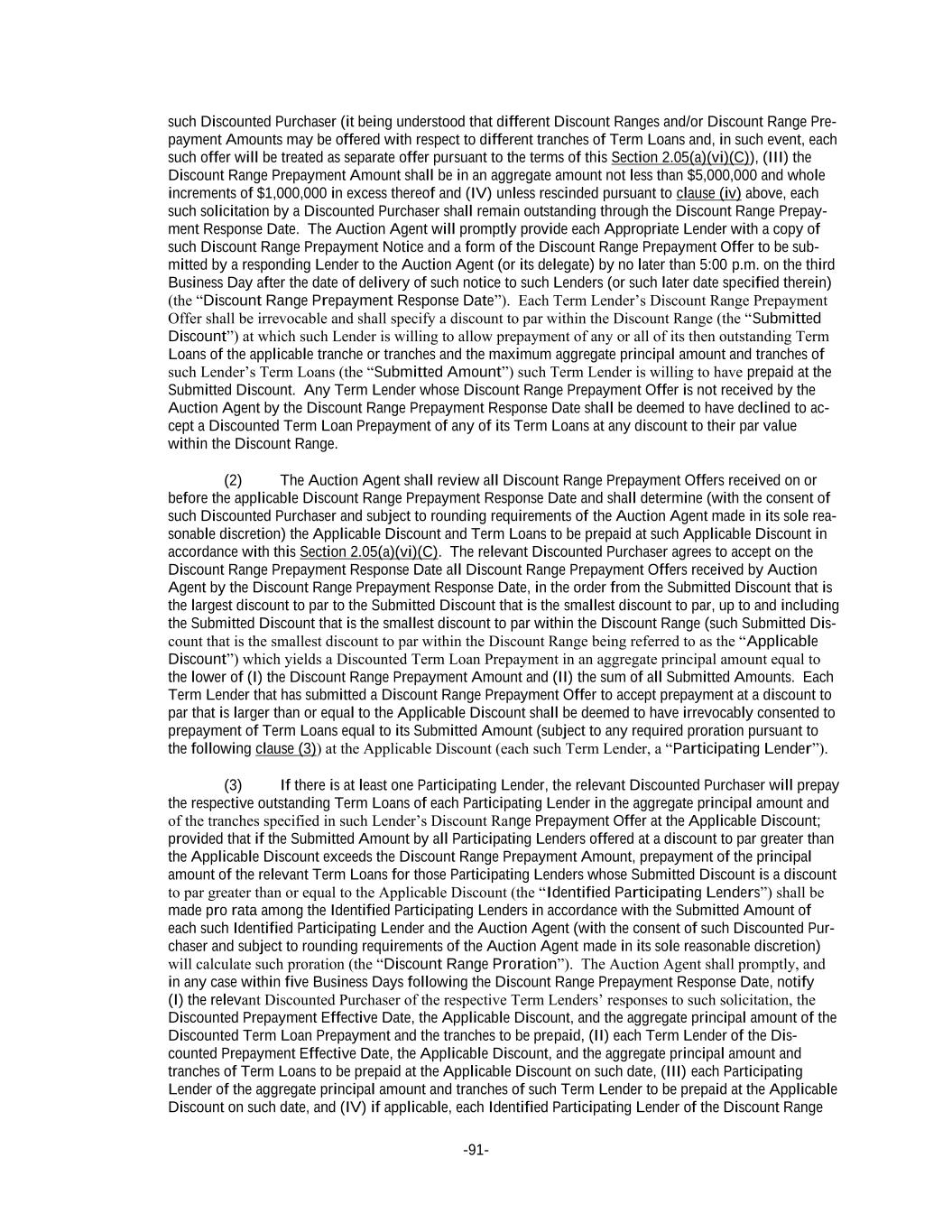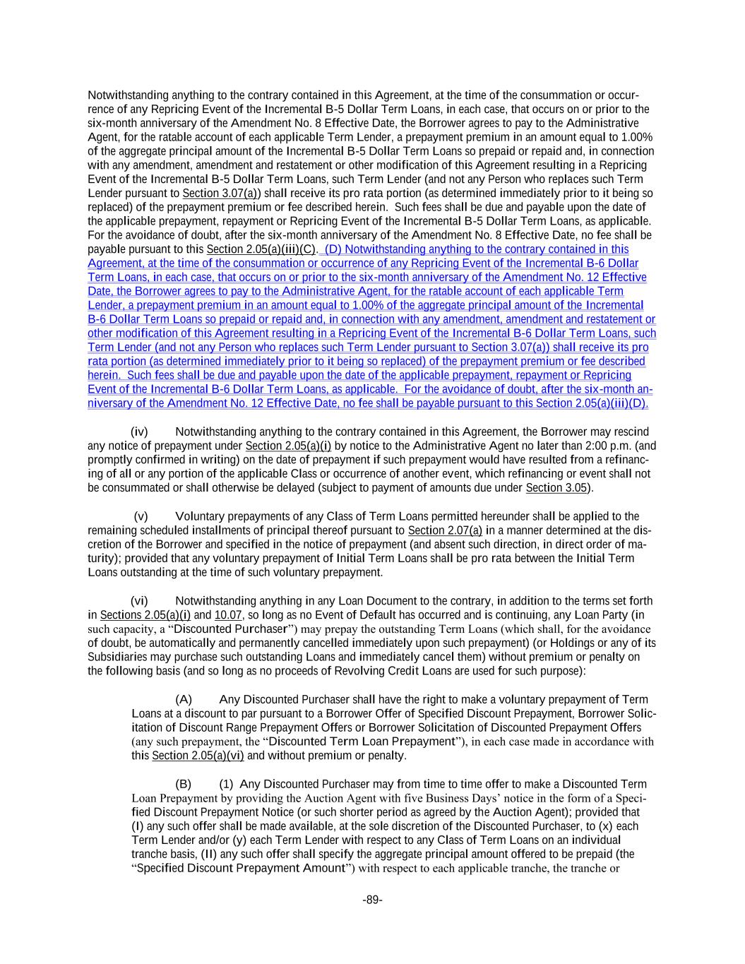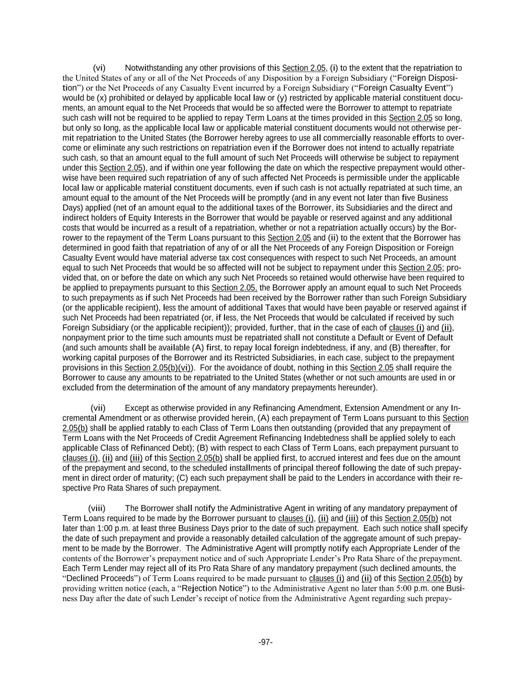 -97- (vi) Notwithstanding any other provisions of this Section 2.05, (i) to the extent that the repatriation to the United States of any or all of the Net Proceeds of any Disposition by a Foreign Subsidiary (“Foreign Disposi- tion”) or the Net Proceeds of any Casualty Event incurred by a Foreign Subsidiary (“Foreign Casualty Event”) would be (x) prohibited or delayed by applicable local law or (y) restricted by applicable material constituent docu- ments, an amount equal to the Net Proceeds that would be so affected were the Borrower to attempt to repatriate such cash will not be required to be applied to repay Term Loans at the times provided in this Section 2.05 so long, but only so long, as the applicable local law or applicable material constituent documents would not otherwise per- mit repatriation to the United States (the Borrower hereby agrees to use all commercially reasonable efforts to over- come or eliminate any such restrictions on repatriation even if the Borrower does not intend to actually repatriate such cash, so that an amount equal to the full amount of such Net Proceeds will otherwise be subject to repayment under this Section 2.05), and if within one year following the date on which the respective prepayment would other- wise have been required such repatriation of any of such affected Net Proceeds is permissible under the applicable local law or applicable material constituent documents, even if such cash is not actually repatriated at such time, an amount equal to the amount of the Net Proceeds will be promptly (and in any event not later than five Business Days) applied (net of an amount equal to the additional taxes of the Borrower, its Subsidiaries and the direct and indirect holders of Equity Interests in the Borrower that would be payable or reserved against and any additional costs that would be incurred as a result of a repatriation, whether or not a repatriation actually occurs) by the Bor- rower to the repayment of the Term Loans pursuant to this Section 2.05 and (ii) to the extent that the Borrower has determined in good faith that repatriation of any of or all the Net Proceeds of any Foreign Disposition or Foreign Casualty Event would have material adverse tax cost consequences with respect to such Net Proceeds, an amount equal to such Net Proceeds that would be so affected will not be subject to repayment under this Section 2.05; pro- vided that, on or before the date on which any such Net Proceeds so retained would otherwise have been required to be applied to prepayments pursuant to this Section 2.05, the Borrower apply an amount equal to such Net Proceeds to such prepayments as if such Net Proceeds had been received by the Borrower rather than such Foreign Subsidiary (or the applicable recipient), less the amount of additional Taxes that would have been payable or reserved against if such Net Proceeds had been repatriated (or, if less, the Net Proceeds that would be calculated if received by such Foreign Subsidiary (or the applicable recipient)); provided, further, that in the case of each of clauses (i) and (ii), nonpayment prior to the time such amounts must be repatriated shall not constitute a Default or Event of Default (and such amounts shall be available (A) first, to repay local foreign indebtedness, if any, and (B) thereafter, for working capital purposes of the Borrower and its Restricted Subsidiaries, in each case, subject to the prepayment provisions in this Section 2.05(b)(vi)). For the avoidance of doubt, nothing in this Section 2.05 shall require the Borrower to cause any amounts to be repatriated to the United States (whether or not such amounts are used in or excluded from the determination of the amount of any mandatory prepayments hereunder). (vii) Except as otherwise provided in any Refinancing Amendment, Extension Amendment or any In- cremental Amendment or as otherwise provided herein, (A) each prepayment of Term Loans pursuant to this Section 2.05(b) shall be applied ratably to each Class of Term Loans then outstanding (provided that any prepayment of Term Loans with the Net Proceeds of Credit Agreement Refinancing Indebtedness shall be applied solely to each applicable Class of Refinanced Debt); (B) with respect to each Class of Term Loans, each prepayment pursuant to clauses (i), (ii) and (iii) of this Section 2.05(b) shall be applied first, to accrued interest and fees due on the amount of the prepayment and second, to the scheduled installments of principal thereof following the date of such prepay- ment in direct order of maturity; (C) each such prepayment shall be paid to the Lenders in accordance with their re- spective Pro Rata Shares of such prepayment. (viii) The Borrower shall notify the Administrative Agent in writing of any mandatory prepayment of Term Loans required to be made by the Borrower pursuant to clauses (i), (ii) and (iii) of this Section 2.05(b) not later than 1:00 p.m. at least three Business Days prior to the date of such prepayment. Each such notice shall specify the date of such prepayment and provide a reasonably detailed calculation of the aggregate amount of such prepay- ment to be made by the Borrower. The Administrative Agent will promptly notify each Appropriate Lender of the contents of the Borrower’s prepayment notice and of such Appropriate Lender’s Pro Rata Share of the prepayment. Each Term Lender may reject all of its Pro Rata Share of any mandatory prepayment (such declined amounts, the “Declined Proceeds”) of Term Loans required to be made pursuant to clauses (i) and (ii) of this Section 2.05(b) by providing written notice (each, a “Rejection Notice”) to the Administrative Agent no later than 5:00 p.m. one Busi- ness Day after the date of such Lender’s receipt of notice from the Administrative Agent regarding such prepay-