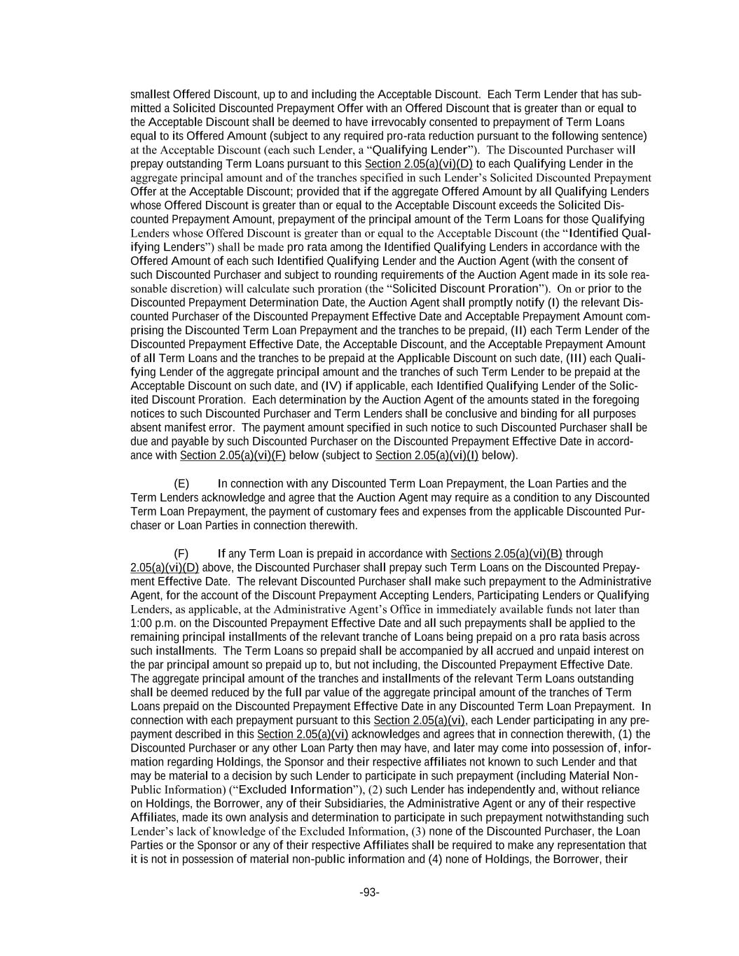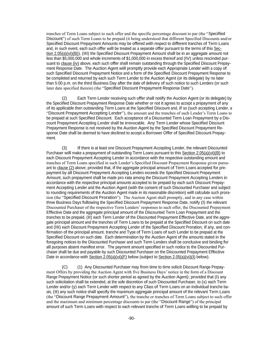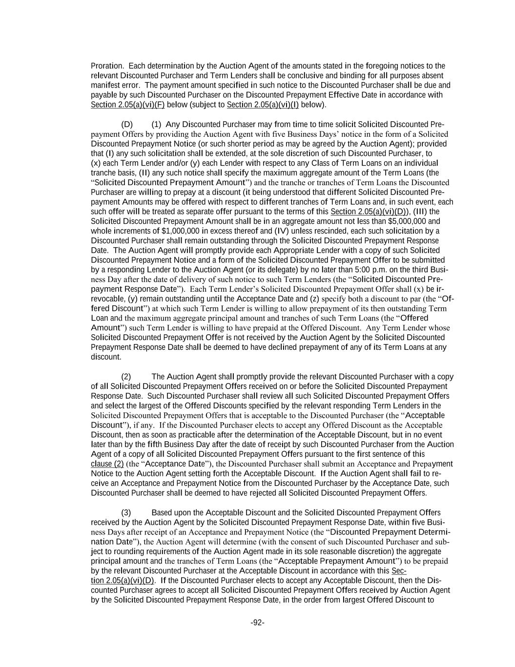 -97- (vi) Notwithstanding any other provisions of this Section 2.05, (i) to the extent that the repatriation to the United States of any or all of the Net Proceeds of any Disposition by a Foreign Subsidiary (“Foreign Disposi- tion”) or the Net Proceeds of any Casualty Event incurred by a Foreign Subsidiary (“Foreign Casualty Event”) would be (x) prohibited or delayed by applicable local law or (y) restricted by applicable material constituent docu- ments, an amount equal to the Net Proceeds that would be so affected were the Borrower to attempt to repatriate such cash will not be required to be applied to repay Term Loans at the times provided in this Section 2.05 so long, but only so long, as the applicable local law or applicable material constituent documents would not otherwise per- mit repatriation to the United States (the Borrower hereby agrees to use all commercially reasonable efforts to over- come or eliminate any such restrictions on repatriation even if the Borrower does not intend to actually repatriate such cash, so that an amount equal to the full amount of such Net Proceeds will otherwise be subject to repayment under this Section 2.05), and if within one year following the date on which the respective prepayment would other- wise have been required such repatriation of any of such affected Net Proceeds is permissible under the applicable local law or applicable material constituent documents, even if such cash is not actually repatriated at such time, an amount equal to the amount of the Net Proceeds will be promptly (and in any event not later than five Business Days) applied (net of an amount equal to the additional taxes of the Borrower, its Subsidiaries and the direct and indirect holders of Equity Interests in the Borrower that would be payable or reserved against and any additional costs that would be incurred as a result of a repatriation, whether or not a repatriation actually occurs) by the Bor- rower to the repayment of the Term Loans pursuant to this Section 2.05 and (ii) to the extent that the Borrower has determined in good faith that repatriation of any of or all the Net Proceeds of any Foreign Disposition or Foreign Casualty Event would have material adverse tax cost consequences with respect to such Net Proceeds, an amount equal to such Net Proceeds that would be so affected will not be subject to repayment under this Section 2.05; pro- vided that, on or before the date on which any such Net Proceeds so retained would otherwise have been required to be applied to prepayments pursuant to this Section 2.05, the Borrower apply an amount equal to such Net Proceeds to such prepayments as if such Net Proceeds had been received by the Borrower rather than such Foreign Subsidiary (or the applicable recipient), less the amount of additional Taxes that would have been payable or reserved against if such Net Proceeds had been repatriated (or, if less, the Net Proceeds that would be calculated if received by such Foreign Subsidiary (or the applicable recipient)); provided, further, that in the case of each of clauses (i) and (ii), nonpayment prior to the time such amounts must be repatriated shall not constitute a Default or Event of Default (and such amounts shall be available (A) first, to repay local foreign indebtedness, if any, and (B) thereafter, for working capital purposes of the Borrower and its Restricted Subsidiaries, in each case, subject to the prepayment provisions in this Section 2.05(b)(vi)). For the avoidance of doubt, nothing in this Section 2.05 shall require the Borrower to cause any amounts to be repatriated to the United States (whether or not such amounts are used in or excluded from the determination of the amount of any mandatory prepayments hereunder). (vii) Except as otherwise provided in any Refinancing Amendment, Extension Amendment or any In- cremental Amendment or as otherwise provided herein, (A) each prepayment of Term Loans pursuant to this Section 2.05(b) shall be applied ratably to each Class of Term Loans then outstanding (provided that any prepayment of Term Loans with the Net Proceeds of Credit Agreement Refinancing Indebtedness shall be applied solely to each applicable Class of Refinanced Debt); (B) with respect to each Class of Term Loans, each prepayment pursuant to clauses (i), (ii) and (iii) of this Section 2.05(b) shall be applied first, to accrued interest and fees due on the amount of the prepayment and second, to the scheduled installments of principal thereof following the date of such prepay- ment in direct order of maturity; (C) each such prepayment shall be paid to the Lenders in accordance with their re- spective Pro Rata Shares of such prepayment. (viii) The Borrower shall notify the Administrative Agent in writing of any mandatory prepayment of Term Loans required to be made by the Borrower pursuant to clauses (i), (ii) and (iii) of this Section 2.05(b) not later than 1:00 p.m. at least three Business Days prior to the date of such prepayment. Each such notice shall specify the date of such prepayment and provide a reasonably detailed calculation of the aggregate amount of such prepay- ment to be made by the Borrower. The Administrative Agent will promptly notify each Appropriate Lender of the contents of the Borrower’s prepayment notice and of such Appropriate Lender’s Pro Rata Share of the prepayment. Each Term Lender may reject all of its Pro Rata Share of any mandatory prepayment (such declined amounts, the “Declined Proceeds”) of Term Loans required to be made pursuant to clauses (i) and (ii) of this Section 2.05(b) by providing written notice (each, a “Rejection Notice”) to the Administrative Agent no later than 5:00 p.m. one Busi- ness Day after the date of such Lender’s receipt of notice from the Administrative Agent regarding such prepay-
