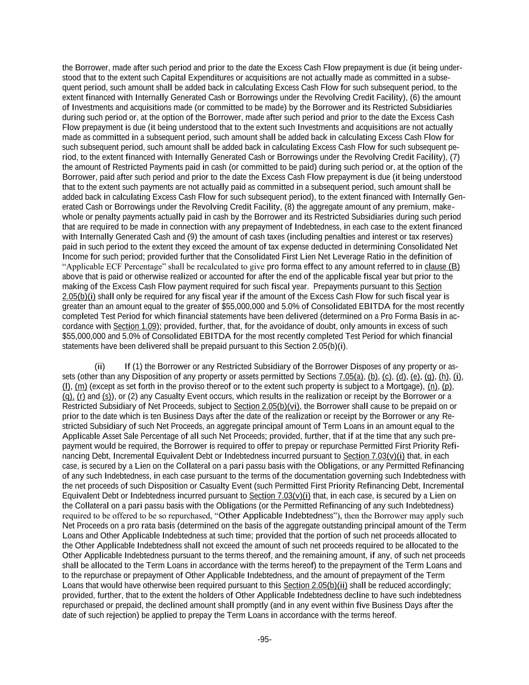 -95- the Borrower, made after such period and prior to the date the Excess Cash Flow prepayment is due (it being under- stood that to the extent such Capital Expenditures or acquisitions are not actually made as committed in a subse- quent period, such amount shall be added back in calculating Excess Cash Flow for such subsequent period, to the extent financed with Internally Generated Cash or Borrowings under the Revolving Credit Facility), (6) the amount of Investments and acquisitions made (or committed to be made) by the Borrower and its Restricted Subsidiaries during such period or, at the option of the Borrower, made after such period and prior to the date the Excess Cash Flow prepayment is due (it being understood that to the extent such Investments and acquisitions are not actually made as committed in a subsequent period, such amount shall be added back in calculating Excess Cash Flow for such subsequent period, such amount shall be added back in calculating Excess Cash Flow for such subsequent pe- riod, to the extent financed with Internally Generated Cash or Borrowings under the Revolving Credit Facility), (7) the amount of Restricted Payments paid in cash (or committed to be paid) during such period or, at the option of the Borrower, paid after such period and prior to the date the Excess Cash Flow prepayment is due (it being understood that to the extent such payments are not actually paid as committed in a subsequent period, such amount shall be added back in calculating Excess Cash Flow for such subsequent period), to the extent financed with Internally Gen- erated Cash or Borrowings under the Revolving Credit Facility, (8) the aggregate amount of any premium, make- whole or penalty payments actually paid in cash by the Borrower and its Restricted Subsidiaries during such period that are required to be made in connection with any prepayment of Indebtedness, in each case to the extent financed with Internally Generated Cash and (9) the amount of cash taxes (including penalties and interest or tax reserves) paid in such period to the extent they exceed the amount of tax expense deducted in determining Consolidated Net Income for such period; provided further that the Consolidated First Lien Net Leverage Ratio in the definition of “Applicable ECF Percentage” shall be recalculated to give pro forma effect to any amount referred to in clause (B) above that is paid or otherwise realized or accounted for after the end of the applicable fiscal year but prior to the making of the Excess Cash Flow payment required for such fiscal year. Prepayments pursuant to this Section 2.05(b)(i) shall only be required for any fiscal year if the amount of the Excess Cash Flow for such fiscal year is greater than an amount equal to the greater of $55,000,000 and 5.0% of Consolidated EBITDA for the most recently completed Test Period for which financial statements have been delivered (determined on a Pro Forma Basis in ac- cordance with Section 1.09); provided, further, that, for the avoidance of doubt, only amounts in excess of such $55,000,000 and 5.0% of Consolidated EBITDA for the most recently completed Test Period for which financial statements have been delivered shall be prepaid pursuant to this Section 2.05(b)(i). (ii) If (1) the Borrower or any Restricted Subsidiary of the Borrower Disposes of any property or as- sets (other than any Disposition of any property or assets permitted by Sections 7.05(a), (b), (c), (d), (e), (g), (h), (i), (l), (m) (except as set forth in the proviso thereof or to the extent such property is subject to a Mortgage), (n), (p), (q), (r) and (s)), or (2) any Casualty Event occurs, which results in the realization or receipt by the Borrower or a Restricted Subsidiary of Net Proceeds, subject to Section 2.05(b)(vi), the Borrower shall cause to be prepaid on or prior to the date which is ten Business Days after the date of the realization or receipt by the Borrower or any Re- stricted Subsidiary of such Net Proceeds, an aggregate principal amount of Term Loans in an amount equal to the Applicable Asset Sale Percentage of all such Net Proceeds; provided, further, that if at the time that any such pre- payment would be required, the Borrower is required to offer to prepay or repurchase Permitted First Priority Refi- nancing Debt, Incremental Equivalent Debt or Indebtedness incurred pursuant to Section 7.03(v)(i) that, in each case, is secured by a Lien on the Collateral on a pari passu basis with the Obligations, or any Permitted Refinancing of any such Indebtedness, in each case pursuant to the terms of the documentation governing such Indebtedness with the net proceeds of such Disposition or Casualty Event (such Permitted First Priority Refinancing Debt, Incremental Equivalent Debt or Indebtedness incurred pursuant to Section 7.03(v)(i) that, in each case, is secured by a Lien on the Collateral on a pari passu basis with the Obligations (or the Permitted Refinancing of any such Indebtedness) required to be offered to be so repurchased, “Other Applicable Indebtedness”), then the Borrower may apply such Net Proceeds on a pro rata basis (determined on the basis of the aggregate outstanding principal amount of the Term Loans and Other Applicable Indebtedness at such time; provided that the portion of such net proceeds allocated to the Other Applicable Indebtedness shall not exceed the amount of such net proceeds required to be allocated to the Other Applicable Indebtedness pursuant to the terms thereof, and the remaining amount, if any, of such net proceeds shall be allocated to the Term Loans in accordance with the terms hereof) to the prepayment of the Term Loans and to the repurchase or prepayment of Other Applicable Indebtedness, and the amount of prepayment of the Term Loans that would have otherwise been required pursuant to this Section 2.05(b)(ii) shall be reduced accordingly; provided, further, that to the extent the holders of Other Applicable Indebted