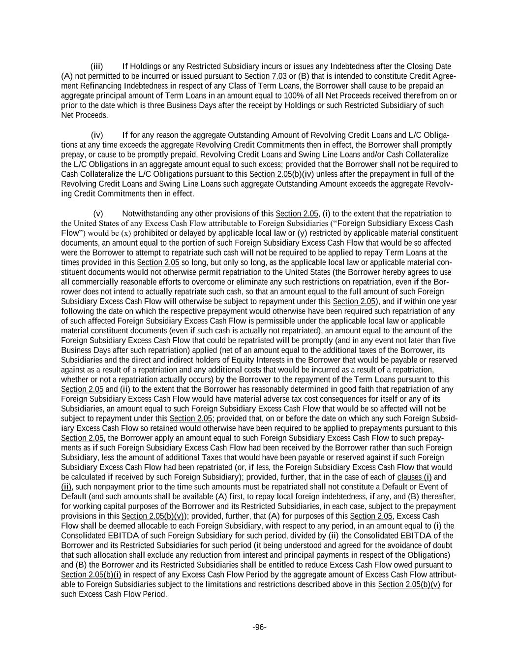 -96- (iii) If Holdings or any Restricted Subsidiary incurs or issues any Indebtedness after the Closing Date (A) not permitted to be incurred or issued pursuant to Section 7.03 or (B) that is intended to constitute Credit Agree- ment Refinancing Indebtedness in respect of any Class of Term Loans, the Borrower shall cause to be prepaid an aggregate principal amount of Term Loans in an amount equal to 100% of all Net Proceeds received therefrom on or prior to the date which is three Business Days after the receipt by Holdings or such Restricted Subsidiary of such Net Proceeds. (iv) If for any reason the aggregate Outstanding Amount of Revolving Credit Loans and L/C Obliga- tions at any time exceeds the aggregate Revolving Credit Commitments then in effect, the Borrower shall promptly prepay, or cause to be promptly prepaid, Revolving Credit Loans and Swing Line Loans and/or Cash Collateralize the L/C Obligations in an aggregate amount equal to such excess; provided that the Borrower shall not be required to Cash Collateralize the L/C Obligations pursuant to this Section 2.05(b)(iv) unless after the prepayment in full of the Revolving Credit Loans and Swing Line Loans such aggregate Outstanding Amount exceeds the aggregate Revolv- ing Credit Commitments then in effect. (v) Notwithstanding any other provisions of this Section 2.05, (i) to the extent that the repatriation to the United States of any Excess Cash Flow attributable to Foreign Subsidiaries (“Foreign Subsidiary Excess Cash Flow”) would be (x) prohibited or delayed by applicable local law or (y) restricted by applicable material constituent documents, an amount equal to the portion of such Foreign Subsidiary Excess Cash Flow that would be so affected were the Borrower to attempt to repatriate such cash will not be required to be applied to repay Term Loans at the times provided in this Section 2.05 so long, but only so long, as the applicable local law or applicable material con- stituent documents would not otherwise permit repatriation to the United States (the Borrower hereby agrees to use all commercially reasonable efforts to overcome or eliminate any such restrictions on repatriation, even if the Bor- rower does not intend to actually repatriate such cash, so that an amount equal to the full amount of such Foreign Subsidiary Excess Cash Flow will otherwise be subject to repayment under this Section 2.05), and if within one year following the date on which the respective prepayment would otherwise have been required such repatriation of any of such affected Foreign Subsidiary Excess Cash Flow is permissible under the applicable local law or applicable material constituent documents (even if such cash is actually not repatriated), an amount equal to the amount of the Foreign Subsidiary Excess Cash Flow that could be repatriated will be promptly (and in any event not later than five Business Days after such repatriation) applied (net of an amount equal to the additional taxes of the Borrower, its Subsidiaries and the direct and indirect holders of Equity Interests in the Borrower that would be payable or reserved against as a result of a repatriation and any additional costs that would be incurred as a result of a repatriation, whether or not a repatriation actually occurs) by the Borrower to the repayment of the Term Loans pursuant to this Section 2.05 and (ii) to the extent that the Borrower has reasonably determined in good faith that repatriation of any Foreign Subsidiary Excess Cash Flow would have material adverse tax cost consequences for itself or any of its Subsidiaries, an amount equal to such Foreign Subsidiary Excess Cash Flow that would be so affected will not be subject to repayment under this Section 2.05; provided that, on or before the date on which any such Foreign Subsid- iary Excess Cash Flow so retained would otherwise have been required to be applied to prepayments pursuant to this Section 2.05, the Borrower apply an amount equal to such Foreign Subsidiary Excess Cash Flow to such prepay- ments as if such Foreign Subsidiary Excess Cash Flow had been received by the Borrower rather than such Foreign Subsidiary, less the amount of additional Taxes that would have been payable or reserved against if such Foreign Subsidiary Excess Cash Flow had been repatriated (or, if less, the Foreign Subsidiary Excess Cash Flow that would be calculated if received by such Foreign Subsidiary); provided, further, that in the case of each of clauses (i) and (ii), such nonpayment prior to the time such amounts must be repatriated shall not constitute a Default or Event of Default (and such amounts shall be available (A) first, to repay local foreign indebtedness, if any, and (B) thereafter, for working capital purposes of the Borrower and its Restricted Subsidiaries, in each case, subject to the prepayment provisions in this Section 2.05(b)(v)); provided, further, that (A) for purposes of this Section 2.05, Excess Cash Flow shall be deemed allocable to each Foreign Subsidiary, with respect to any period, in an amount equal to (i) the Consolidated EBITDA of such Foreign Subsidiary for such period, divided by (ii) the Consolidated EBITDA of the Borrower and its Restricted Subsidiaries for such period (it being understood and agreed for the avoidance of doubt that such allocation shall exclude any reduction from interest and principal payments in respect of the Obligations) and (B) the Borrower and its Restricted Subsidiaries shall be entitled to reduce Excess Cash Flow owed pursuant to Section 2.05(b)(i) in respect of any Excess Cash Flow Period by the aggregate amount of Excess Cash Flow attribut- able to Foreign Subsidiaries subject to the limitations and restrictions described above in this Section 2.05(b)(v) for such Excess Cash Flow Period.