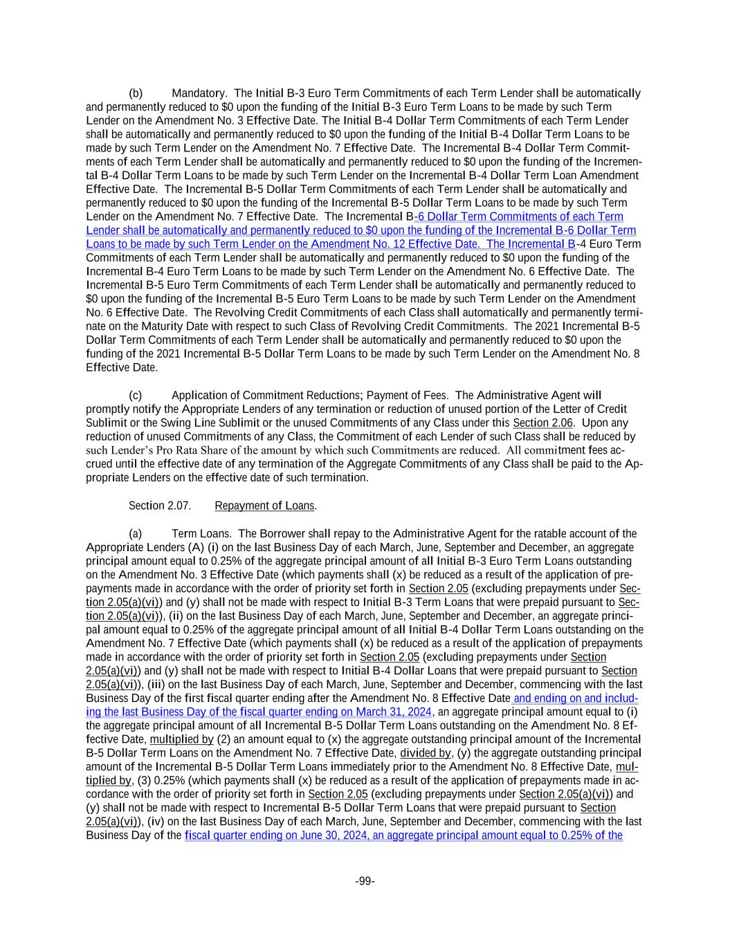-99- (b) Mandatory. The Initial B-3 Euro Term Commitments of each Term Lender shall be automatically and permanently reduced to $0 upon the funding of the Initial B-3 Euro Term Loans to be made by such Term Lender on the Amendment No. 3 Effective Date. The Initial B-4 Dollar Term Commitments of each Term Lender shall be automatically and permanently reduced to $0 upon the funding of the Initial B-4 Dollar Term Loans to be made by such Term Lender on the Amendment No. 7 Effective Date. The Incremental B-4 Dollar Term Commit- ments of each Term Lender shall be automatically and permanently reduced to $0 upon the funding of the Incremen- tal B-4 Dollar Term Loans to be made by such Term Lender on the Incremental B-4 Dollar Term Loan Amendment Effective Date. The Incremental B-5 Dollar Term Commitments of each Term Lender shall be automatically and permanently reduced to $0 upon the funding of the Incremental B-5 Dollar Term Loans to be made by such Term Lender on the Amendment No. 7 Effective Date. The Incremental B-6 Dollar Term Commitments of each Term Lender shall be automatically and permanently reduced to $0 upon the funding of the Incremental B-6 Dollar Term Loans to be made by such Term Lender on the Amendment No. 12 Effective Date. The Incremental B-4 Euro Term Commitments of each Term Lender shall be automatically and permanently reduced to $0 upon the funding of the Incremental B-4 Euro Term Loans to be made by such Term Lender on the Amendment No. 6 Effective Date. The Incremental B-5 Euro Term Commitments of each Term Lender shall be automatically and permanently reduced to $0 upon the funding of the Incremental B-5 Euro Term Loans to be made by such Term Lender on the Amendment No. 6 Effective Date. The Revolving Credit Commitments of each Class shall automatically and permanently termi- nate on the Maturity Date with respect to such Class of Revolving Credit Commitments. The 2021 Incremental B-5 Dollar Term Commitments of each Term Lender shall be automatically and permanently reduced to $0 upon the funding of the 2021 Incremental B-5 Dollar Term Loans to be made by such Term Lender on the Amendment No. 8 Effective Date. (c) Application of Commitment Reductions; Payment of Fees. The Administrative Agent will promptly notify the Appropriate Lenders of any termination or reduction of unused portion of the Letter of Credit Sublimit or the Swing Line Sublimit or the unused Commitments of any Class under this Section 2.06. Upon any reduction of unused Commitments of any Class, the Commitment of each Lender of such Class shall be reduced by such Lender’s Pro Rata Share of the amount by which such Commitments are reduced. All commitment fees ac- crued until the effective date of any termination of the Aggregate Commitments of any Class shall be paid to the Ap- propriate Lenders on the effective date of such termination. Section 2.07. Repayment of Loans. (a) Term Loans. The Borrower shall repay to the Administrative Agent for the ratable account of the Appropriate Lenders (A) (i) on the last Business Day of each March, June, September and December, an aggregate principal amount equal to 0.25% of the aggregate principal amount of all Initial B-3 Euro Term Loans outstanding on the Amendment No. 3 Effective Date (which payments shall (x) be reduced as a result of the application of pre- payments made in accordance with the order of priority set forth in Section 2.05 (excluding prepayments under Sec- tion 2.05(a)(vi)) and (y) shall not be made with respect to Initial B-3 Term Loans that were prepaid pursuant to Sec- tion 2.05(a)(vi)), (ii) on the last Business Day of each March, June, September and December, an aggregate princi- pal amount equal to 0.25% of the aggregate principal amount of all Initial B-4 Dollar Term Loans outstanding on the Amendment No. 7 Effective Date (which payments shall (x) be reduced as a result of the application of prepayments made in accordance with the order of priority set forth in Section 2.05 (excluding prepayments under Section 2.05(a)(vi)) and (y) shall not be made with respect to Initial B-4 Dollar Loans that were prepaid pursuant to Section 2.05(a)(vi)), (iii) on the last Business Day of each March, June, September and December, commencing with the last Business Day of the first fiscal quarter ending after the Amendment No. 8 Effective Date and ending on and includ- ing the last Business Day of the fiscal quarter ending on March 31, 2024, an aggregate principal amount equal to (i) the aggregate principal amount of all Incremental B-5 Dollar Term Loans outstanding on the Amendment No. 8 Ef- fective Date, multiplied by (2) an amount equal to (x) the aggregate outstanding principal amount of the Incremental B-5 Dollar Term Loans on the Amendment No. 7 Effective Date, divided by, (y) the aggregate outstanding principal amount of the Incremental B-5 Dollar Term Loans immediately prior to the Amendment No. 8 Effective Date, mul- tiplied by, (3) 0.25% (which payments shall (x) be reduced as a result of the application of prepayments made in ac- cordance with the order of priority set forth in Section 2.05 (excluding prepayments under Section 2.05(a)(vi)) and (y) shall not be made with respect to Incremental B-5 Dollar Term Loans that were prepaid pursuant to Section 2.05(a)(vi)), (iv) on the last Business Day of each March, June, September and December, commencing with the last Business Day of the fiscal quarter ending on June 30, 2024, an aggregate principal amount equal to 0.25% of the