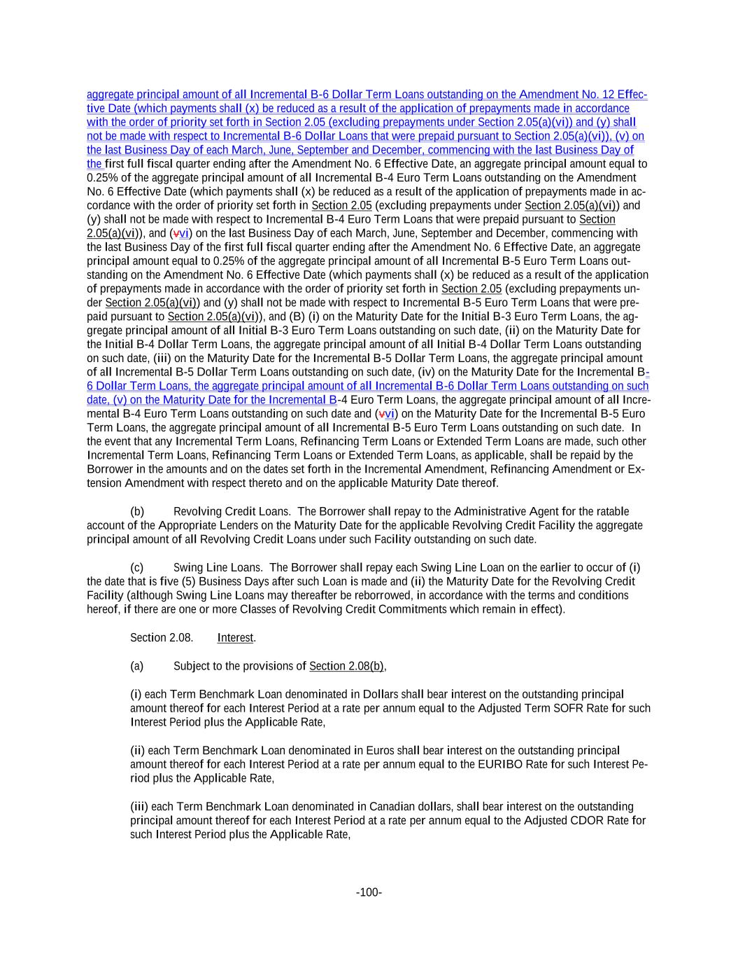 -100- aggregate principal amount of all Incremental B-6 Dollar Term Loans outstanding on the Amendment No. 12 Effec- tive Date (which payments shall (x) be reduced as a result of the application of prepayments made in accordance with the order of priority set forth in Section 2.05 (excluding prepayments under Section 2.05(a)(vi)) and (y) shall not be made with respect to Incremental B-6 Dollar Loans that were prepaid pursuant to Section 2.05(a)(vi)), (v) on the last Business Day of each March, June, September and December, commencing with the last Business Day of the first full fiscal quarter ending after the Amendment No. 6 Effective Date, an aggregate principal amount equal to 0.25% of the aggregate principal amount of all Incremental B-4 Euro Term Loans outstanding on the Amendment No. 6 Effective Date (which payments shall (x) be reduced as a result of the application of prepayments made in ac- cordance with the order of priority set forth in Section 2.05 (excluding prepayments under Section 2.05(a)(vi)) and (y) shall not be made with respect to Incremental B-4 Euro Term Loans that were prepaid pursuant to Section 2.05(a)(vi)), and (vvi) on the last Business Day of each March, June, September and December, commencing with the last Business Day of the first full fiscal quarter ending after the Amendment No. 6 Effective Date, an aggregate principal amount equal to 0.25% of the aggregate principal amount of all Incremental B-5 Euro Term Loans out- standing on the Amendment No. 6 Effective Date (which payments shall (x) be reduced as a result of the application of prepayments made in accordance with the order of priority set forth in Section 2.05 (excluding prepayments un- der Section 2.05(a)(vi)) and (y) shall not be made with respect to Incremental B-5 Euro Term Loans that were pre- paid pursuant to Section 2.05(a)(vi)), and (B) (i) on the Maturity Date for the Initial B-3 Euro Term Loans, the ag- gregate principal amount of all Initial B-3 Euro Term Loans outstanding on such date, (ii) on the Maturity Date for the Initial B-4 Dollar Term Loans, the aggregate principal amount of all Initial B-4 Dollar Term Loans outstanding on such date, (iii) on the Maturity Date for the Incremental B-5 Dollar Term Loans, the aggregate principal amount of all Incremental B-5 Dollar Term Loans outstanding on such date, (iv) on the Maturity Date for the Incremental B- 6 Dollar Term Loans, the aggregate principal amount of all Incremental B-6 Dollar Term Loans outstanding on such date, (v) on the Maturity Date for the Incremental B-4 Euro Term Loans, the aggregate principal amount of all Incre- mental B-4 Euro Term Loans outstanding on such date and (vvi) on the Maturity Date for the Incremental B-5 Euro Term Loans, the aggregate principal amount of all Incremental B-5 Euro Term Loans outstanding on such date. In the event that any Incremental Term Loans, Refinancing Term Loans or Extended Term Loans are made, such other Incremental Term Loans, Refinancing Term Loans or Extended Term Loans, as applicable, shall be repaid by the Borrower in the amounts and on the dates set forth in the Incremental Amendment, Refinancing Amendment or Ex- tension Amendment with respect thereto and on the applicable Maturity Date thereof. (b) Revolving Credit Loans. The Borrower shall repay to the Administrative Agent for the ratable account of the Appropriate Lenders on the Maturity Date for the applicable Revolving Credit Facility the aggregate principal amount of all Revolving Credit Loans under such Facility outstanding on such date. (c) Swing Line Loans. The Borrower shall repay each Swing Line Loan on the earlier to occur of (i) the date that is five (5) Business Days after such Loan is made and (ii) the Maturity Date for the Revolving Credit Facility (although Swing Line Loans may thereafter be reborrowed, in accordance with the terms and conditions hereof, if there are one or more Classes of Revolving Credit Commitments which remain in effect). Section 2.08. Interest. (a) Subject to the provisions of Section 2.08(b), (i) each Term Benchmark Loan denominated in Dollars shall bear interest on the outstanding principal amount thereof for each Interest Period at a rate per annum equal to the Adjusted Term SOFR Rate for such Interest Period plus the Applicable Rate, (ii) each Term Benchmark Loan denominated in Euros shall bear interest on the outstanding principal amount thereof for each Interest Period at a rate per annum equal to the EURIBO Rate for such Interest Pe- riod plus the Applicable Rate, (iii) each Term Benchmark Loan denominated in Canadian dollars, shall bear interest on the outstanding principal amount thereof for each Interest Period at a rate per annum equal to the Adjusted CDOR Rate for such Interest Period plus the Applicable Rate,