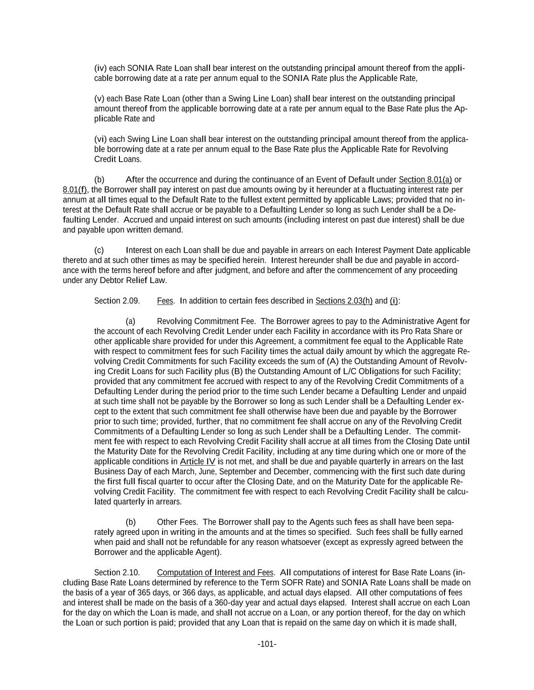 -101- (iv) each SONIA Rate Loan shall bear interest on the outstanding principal amount thereof from the appli- cable borrowing date at a rate per annum equal to the SONIA Rate plus the Applicable Rate, (v) each Base Rate Loan (other than a Swing Line Loan) shall bear interest on the outstanding principal amount thereof from the applicable borrowing date at a rate per annum equal to the Base Rate plus the Ap- plicable Rate and (vi) each Swing Line Loan shall bear interest on the outstanding principal amount thereof from the applica- ble borrowing date at a rate per annum equal to the Base Rate plus the Applicable Rate for Revolving Credit Loans. (b) After the occurrence and during the continuance of an Event of Default under Section 8.01(a) or 8.01(f), the Borrower shall pay interest on past due amounts owing by it hereunder at a fluctuating interest rate per annum at all times equal to the Default Rate to the fullest extent permitted by applicable Laws; provided that no in- terest at the Default Rate shall accrue or be payable to a Defaulting Lender so long as such Lender shall be a De- faulting Lender. Accrued and unpaid interest on such amounts (including interest on past due interest) shall be due and payable upon written demand. (c) Interest on each Loan shall be due and payable in arrears on each Interest Payment Date applicable thereto and at such other times as may be specified herein. Interest hereunder shall be due and payable in accord- ance with the terms hereof before and after judgment, and before and after the commencement of any proceeding under any Debtor Relief Law. Section 2.09. Fees. In addition to certain fees described in Sections 2.03(h) and (i): (a) Revolving Commitment Fee. The Borrower agrees to pay to the Administrative Agent for the account of each Revolving Credit Lender under each Facility in accordance with its Pro Rata Share or other applicable share provided for under this Agreement, a commitment fee equal to the Applicable Rate with respect to commitment fees for such Facility times the actual daily amount by which the aggregate Re- volving Credit Commitments for such Facility exceeds the sum of (A) the Outstanding Amount of Revolv- ing Credit Loans for such Facility plus (B) the Outstanding Amount of L/C Obligations for such Facility; provided that any commitment fee accrued with respect to any of the Revolving Credit Commitments of a Defaulting Lender during the period prior to the time such Lender became a Defaulting Lender and unpaid at such time shall not be payable by the Borrower so long as such Lender shall be a Defaulting Lender ex- cept to the extent that such commitment fee shall otherwise have been due and payable by the Borrower prior to such time; provided, further, that no commitment fee shall accrue on any of the Revolving Credit Commitments of a Defaulting Lender so long as such Lender shall be a Defaulting Lender. The commit- ment fee with respect to each Revolving Credit Facility shall accrue at all times from the Closing Date until the Maturity Date for the Revolving Credit Facility, including at any time during which one or more of the applicable conditions in Article IV is not met, and shall be due and payable quarterly in arrears on the last Business Day of each March, June, September and December, commencing with the first such date during the first full fiscal quarter to occur after the Closing Date, and on the Maturity Date for the applicable Re- volving Credit Facility. The commitment fee with respect to each Revolving Credit Facility shall be calcu- lated quarterly in arrears. (b) Other Fees. The Borrower shall pay to the Agents such fees as shall have been sepa- rately agreed upon in writing in the amounts and at the times so specified. Such fees shall be fully earned when paid and shall not be refundable for any reason whatsoever (except as expressly agreed between the Borrower and the applicable Agent). Section 2.10. Computation of Interest and Fees. All computations of interest for Base Rate Loans (in- cluding Base Rate Loans determined by reference to the Term SOFR Rate) and SONIA Rate Loans shall be made on the basis of a year of 365 days, or 366 days, as applicable, and actual days elapsed. All other computations of fees and interest shall be made on the basis of a 360-day year and actual days elapsed. Interest shall accrue on each Loan for the day on which the Loan is made, and shall not accrue on a Loan, or any portion thereof, for the day on which the Loan or such portion is paid; provided that any Loan that is repaid on the same day on which it is made shall,