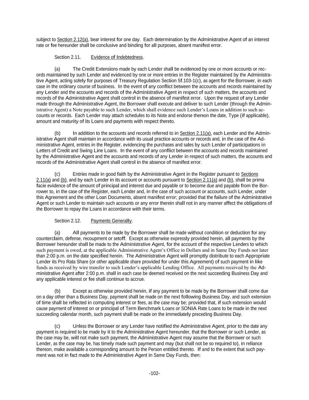 -102- subject to Section 2.12(a), bear interest for one day. Each determination by the Administrative Agent of an interest rate or fee hereunder shall be conclusive and binding for all purposes, absent manifest error. Section 2.11. Evidence of Indebtedness. (a) The Credit Extensions made by each Lender shall be evidenced by one or more accounts or rec- ords maintained by such Lender and evidenced by one or more entries in the Register maintained by the Administra- tive Agent, acting solely for purposes of Treasury Regulation Section 5f.103-1(c), as agent for the Borrower, in each case in the ordinary course of business. In the event of any conflict between the accounts and records maintained by any Lender and the accounts and records of the Administrative Agent in respect of such matters, the accounts and records of the Administrative Agent shall control in the absence of manifest error. Upon the request of any Lender made through the Administrative Agent, the Borrower shall execute and deliver to such Lender (through the Admin- istrative Agent) a Note payable to such Lender, which shall evidence such Lender’s Loans in addition to such ac- counts or records. Each Lender may attach schedules to its Note and endorse thereon the date, Type (if applicable), amount and maturity of its Loans and payments with respect thereto. (b) In addition to the accounts and records referred to in Section 2.11(a), each Lender and the Admin- istrative Agent shall maintain in accordance with its usual practice accounts or records and, in the case of the Ad- ministrative Agent, entries in the Register, evidencing the purchases and sales by such Lender of participations in Letters of Credit and Swing Line Loans. In the event of any conflict between the accounts and records maintained by the Administrative Agent and the accounts and records of any Lender in respect of such matters, the accounts and records of the Administrative Agent shall control in the absence of manifest error. (c) Entries made in good faith by the Administrative Agent in the Register pursuant to Sections 2.11(a) and (b), and by each Lender in its account or accounts pursuant to Section 2.11(a) and (b), shall be prima facie evidence of the amount of principal and interest due and payable or to become due and payable from the Bor- rower to, in the case of the Register, each Lender and, in the case of such account or accounts, such Lender, under this Agreement and the other Loan Documents, absent manifest error; provided that the failure of the Administrative Agent or such Lender to maintain such accounts or any error therein shall not in any manner affect the obligations of the Borrower to repay the Loans in accordance with their terms. Section 2.12. Payments Generally. (a) All payments to be made by the Borrower shall be made without condition or deduction for any counterclaim, defense, recoupment or setoff. Except as otherwise expressly provided herein, all payments by the Borrower hereunder shall be made to the Administrative Agent, for the account of the respective Lenders to which such payment is owed, at the applicable Administrative Agent’s Office in Dollars and in Same Day Funds not later than 2:00 p.m. on the date specified herein. The Administrative Agent will promptly distribute to each Appropriate Lender its Pro Rata Share (or other applicable share provided for under this Agreement) of such payment in like funds as received by wire transfer to such Lender’s applicable Lending Office. All payments received by the Ad- ministrative Agent after 2:00 p.m. shall in each case be deemed received on the next succeeding Business Day and any applicable interest or fee shall continue to accrue. (b) Except as otherwise provided herein, if any payment to be made by the Borrower shall come due on a day other than a Business Day, payment shall be made on the next following Business Day, and such extension of time shall be reflected in computing interest or fees, as the case may be; provided that, if such extension would cause payment of interest on or principal of Term Benchmark Loans or SONIA Rate Loans to be made in the next succeeding calendar month, such payment shall be made on the immediately preceding Business Day. (c) Unless the Borrower or any Lender have notified the Administrative Agent, prior to the date any payment is required to be made by it to the Administrative Agent hereunder, that the Borrower or such Lender, as the case may be, will not make such payment, the Administrative Agent may assume that the Borrower or such Lender, as the case may be, has timely made such payment and may (but shall not be so required to), in reliance thereon, make available a corresponding amount to the Person entitled thereto. If and to the extent that such pay- ment was not in fact made to the Administrative Agent in Same Day Funds, then: