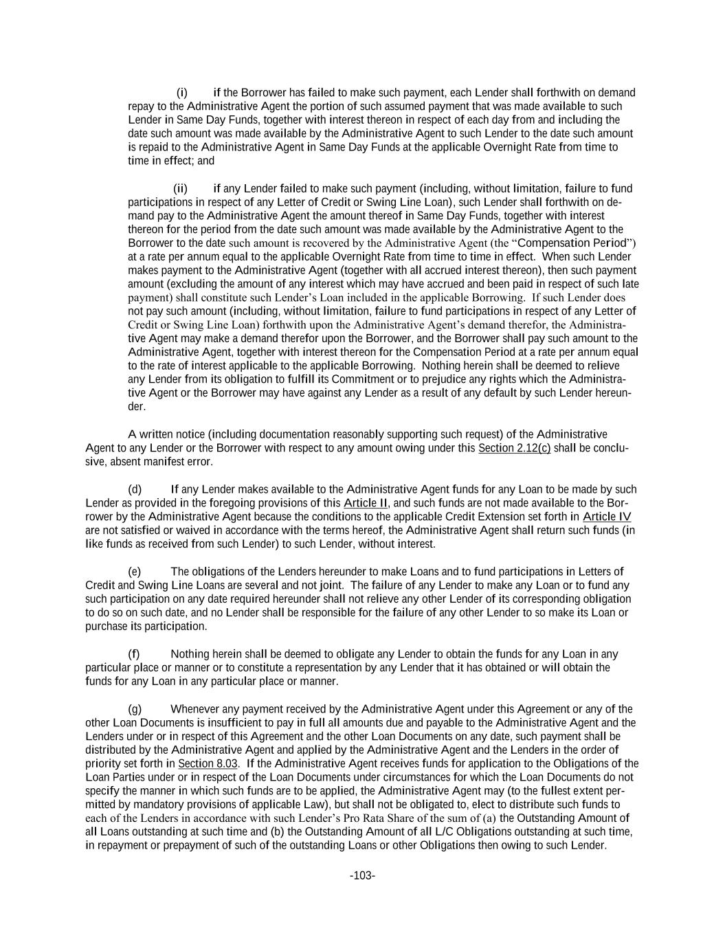 -103- (i) if the Borrower has failed to make such payment, each Lender shall forthwith on demand repay to the Administrative Agent the portion of such assumed payment that was made available to such Lender in Same Day Funds, together with interest thereon in respect of each day from and including the date such amount was made available by the Administrative Agent to such Lender to the date such amount is repaid to the Administrative Agent in Same Day Funds at the applicable Overnight Rate from time to time in effect; and (ii) if any Lender failed to make such payment (including, without limitation, failure to fund participations in respect of any Letter of Credit or Swing Line Loan), such Lender shall forthwith on de- mand pay to the Administrative Agent the amount thereof in Same Day Funds, together with interest thereon for the period from the date such amount was made available by the Administrative Agent to the Borrower to the date such amount is recovered by the Administrative Agent (the “Compensation Period”) at a rate per annum equal to the applicable Overnight Rate from time to time in effect. When such Lender makes payment to the Administrative Agent (together with all accrued interest thereon), then such payment amount (excluding the amount of any interest which may have accrued and been paid in respect of such late payment) shall constitute such Lender’s Loan included in the applicable Borrowing. If such Lender does not pay such amount (including, without limitation, failure to fund participations in respect of any Letter of Credit or Swing Line Loan) forthwith upon the Administrative Agent’s demand therefor, the Administra- tive Agent may make a demand therefor upon the Borrower, and the Borrower shall pay such amount to the Administrative Agent, together with interest thereon for the Compensation Period at a rate per annum equal to the rate of interest applicable to the applicable Borrowing. Nothing herein shall be deemed to relieve any Lender from its obligation to fulfill its Commitment or to prejudice any rights which the Administra- tive Agent or the Borrower may have against any Lender as a result of any default by such Lender hereun- der. A written notice (including documentation reasonably supporting such request) of the Administrative Agent to any Lender or the Borrower with respect to any amount owing under this Section 2.12(c) shall be conclu- sive, absent manifest error. (d) If any Lender makes available to the Administrative Agent funds for any Loan to be made by such Lender as provided in the foregoing provisions of this Article II, and such funds are not made available to the Bor- rower by the Administrative Agent because the conditions to the applicable Credit Extension set forth in Article IV are not satisfied or waived in accordance with the terms hereof, the Administrative Agent shall return such funds (in like funds as received from such Lender) to such Lender, without interest. (e) The obligations of the Lenders hereunder to make Loans and to fund participations in Letters of Credit and Swing Line Loans are several and not joint. The failure of any Lender to make any Loan or to fund any such participation on any date required hereunder shall not relieve any other Lender of its corresponding obligation to do so on such date, and no Lender shall be responsible for the failure of any other Lender to so make its Loan or purchase its participation. (f) Nothing herein shall be deemed to obligate any Lender to obtain the funds for any Loan in any particular place or manner or to constitute a representation by any Lender that it has obtained or will obtain the funds for any Loan in any particular place or manner. (g) Whenever any payment received by the Administrative Agent under this Agreement or any of the other Loan Documents is insufficient to pay in full all amounts due and payable to the Administrative Agent and the Lenders under or in respect of this Agreement and the other Loan Documents on any date, such payment shall be distributed by the Administrative Agent and applied by the Administrative Agent and the Lenders in the order of priority set forth in Section 8.03. If the Administrative Agent receives funds for application to the Obligations of the Loan Parties under or in respect of the Loan Documents under circumstances for which the Loan Documents do not specify the manner in which such funds are to be applied, the Administrative Agent may (to the fullest extent per- mitted by mandatory provisions of applicable Law), but shall not be obligated to, elect to distribute such funds to each of the Lenders in accordance with such Lender’s Pro Rata Share of the sum of (a) the Outstanding Amount of all Loans outstanding at such time and (b) the Outstanding Amount of all L/C Obligations outstanding at such time, in repayment or prepayment of such of the outstanding Loans or other Obligations then owing to such Lender.