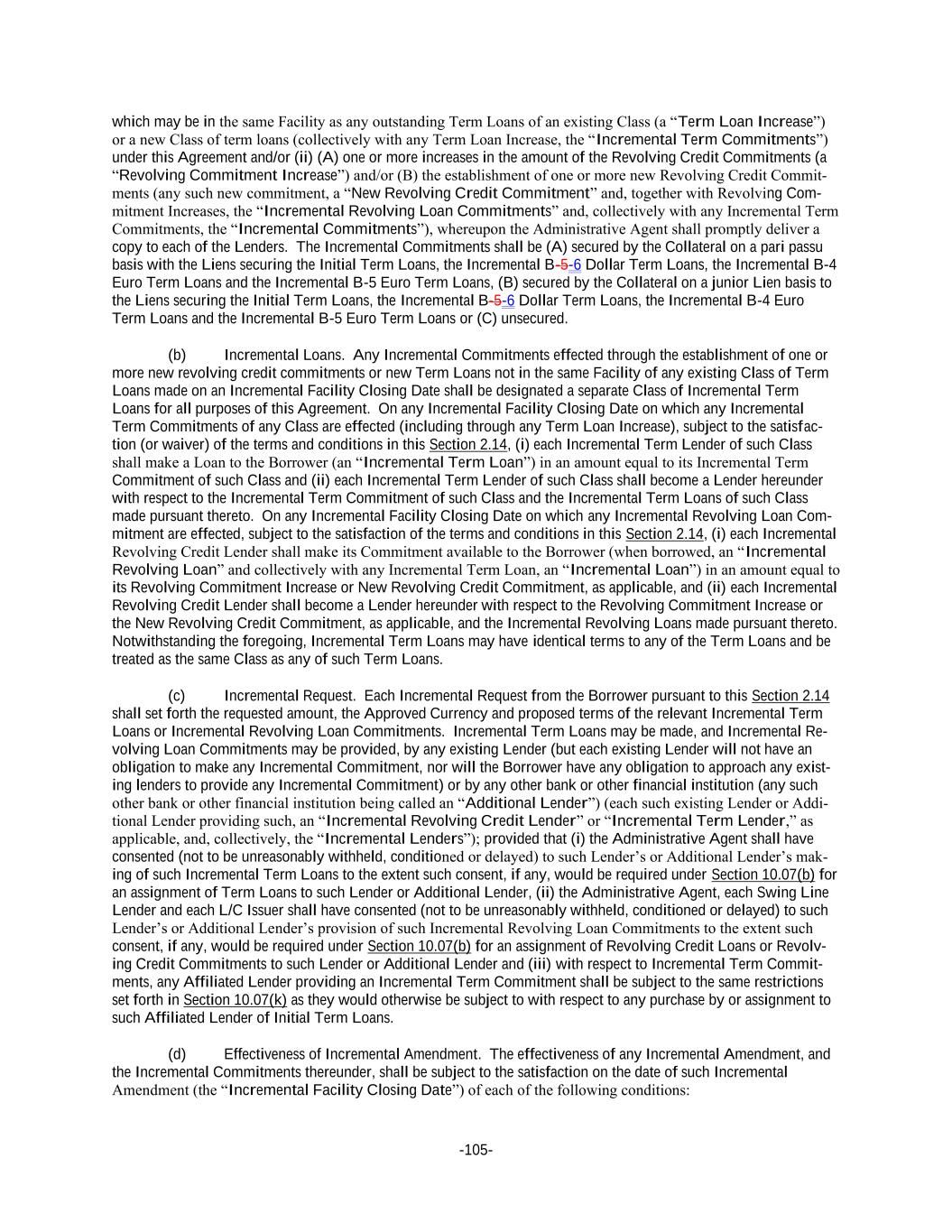 -105- which may be in the same Facility as any outstanding Term Loans of an existing Class (a “Term Loan Increase”) or a new Class of term loans (collectively with any Term Loan Increase, the “Incremental Term Commitments”) under this Agreement and/or (ii) (A) one or more increases in the amount of the Revolving Credit Commitments (a “Revolving Commitment Increase”) and/or (B) the establishment of one or more new Revolving Credit Commit- ments (any such new commitment, a “New Revolving Credit Commitment” and, together with Revolving Com- mitment Increases, the “Incremental Revolving Loan Commitments” and, collectively with any Incremental Term Commitments, the “Incremental Commitments”), whereupon the Administrative Agent shall promptly deliver a copy to each of the Lenders. The Incremental Commitments shall be (A) secured by the Collateral on a pari passu basis with the Liens securing the Initial Term Loans, the Incremental B-5-6 Dollar Term Loans, the Incremental B-4 Euro Term Loans and the Incremental B-5 Euro Term Loans, (B) secured by the Collateral on a junior Lien basis to the Liens securing the Initial Term Loans, the Incremental B-5-6 Dollar Term Loans, the Incremental B-4 Euro Term Loans and the Incremental B-5 Euro Term Loans or (C) unsecured. (b) Incremental Loans. Any Incremental Commitments effected through the establishment of one or more new revolving credit commitments or new Term Loans not in the same Facility of any existing Class of Term Loans made on an Incremental Facility Closing Date shall be designated a separate Class of Incremental Term Loans for all purposes of this Agreement. On any Incremental Facility Closing Date on which any Incremental Term Commitments of any Class are effected (including through any Term Loan Increase), subject to the satisfac- tion (or waiver) of the terms and conditions in this Section 2.14, (i) each Incremental Term Lender of such Class shall make a Loan to the Borrower (an “Incremental Term Loan”) in an amount equal to its Incremental Term Commitment of such Class and (ii) each Incremental Term Lender of such Class shall become a Lender hereunder with respect to the Incremental Term Commitment of such Class and the Incremental Term Loans of such Class made pursuant thereto. On any Incremental Facility Closing Date on which any Incremental Revolving Loan Com- mitment are effected, subject to the satisfaction of the terms and conditions in this Section 2.14, (i) each Incremental Revolving Credit Lender shall make its Commitment available to the Borrower (when borrowed, an “Incremental Revolving Loan” and collectively with any Incremental Term Loan, an “Incremental Loan”) in an amount equal to its Revolving Commitment Increase or New Revolving Credit Commitment, as applicable, and (ii) each Incremental Revolving Credit Lender shall become a Lender hereunder with respect to the Revolving Commitment Increase or the New Revolving Credit Commitment, as applicable, and the Incremental Revolving Loans made pursuant thereto. Notwithstanding the foregoing, Incremental Term Loans may have identical terms to any of the Term Loans and be treated as the same Class as any of such Term Loans. (c) Incremental Request. Each Incremental Request from the Borrower pursuant to this Section 2.14 shall set forth the requested amount, the Approved Currency and proposed terms of the relevant Incremental Term Loans or Incremental Revolving Loan Commitments. Incremental Term Loans may be made, and Incremental Re- volving Loan Commitments may be provided, by any existing Lender (but each existing Lender will not have an obligation to make any Incremental Commitment, nor will the Borrower have any obligation to approach any exist- ing lenders to provide any Incremental Commitment) or by any other bank or other financial institution (any such other bank or other financial institution being called an “Additional Lender”) (each such existing Lender or Addi- tional Lender providing such, an “Incremental Revolving Credit Lender” or “Incremental Term Lender,” as applicable, and, collectively, the “Incremental Lenders”); provided that (i) the Administrative Agent shall have consented (not to be unreasonably withheld, conditioned or delayed) to such Lender’s or Additional Lender’s mak- ing of such Incremental Term Loans to the extent such consent, if any, would be required under Section 10.07(b) for an assignment of Term Loans to such Lender or Additional Lender, (ii) the Administrative Agent, each Swing Line Lender and each L/C Issuer shall have consented (not to be unreasonably withheld, conditioned or delayed) to such Lender’s or Additional Lender’s provision of such Incremental Revolving Loan Commitments to the extent such consent, if any, would be required under Section 10.07(b) for an assignment of Revolving Credit Loans or Revolv- ing Credit Commitments to such Lender or Additional Lender and (iii) with respect to Incremental Term Commit- ments, any Affiliated Lender providing an Incremental Term Commitment shall be subject to the same restrictions set forth in Section 10.07(k) as they would otherwise be subject to with respect to any purchase by or assignment to such Affiliated Lender of Initial Term Loans. (d) Effectiveness of Incremental Amendment. The effectiveness of any Incremental Amendment, and the Incremental Commitments thereunder, shall be subject to the satisfaction on the date of such Incremental Amendment (the “Incremental Facility Closing Date”) of each of the following conditions: