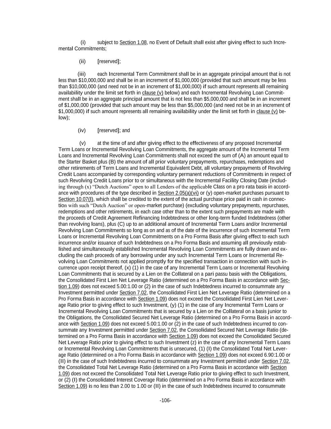 -106- (i) subject to Section 1.08, no Event of Default shall exist after giving effect to such Incre- mental Commitments; (ii) [reserved]; (iii) each Incremental Term Commitment shall be in an aggregate principal amount that is not less than $10,000,000 and shall be in an increment of $1,000,000 (provided that such amount may be less than $10,000,000 (and need not be in an increment of $1,000,000) if such amount represents all remaining availability under the limit set forth in clause (v) below) and each Incremental Revolving Loan Commit- ment shall be in an aggregate principal amount that is not less than $5,000,000 and shall be in an increment of $1,000,000 (provided that such amount may be less than $5,000,000 (and need not be in an increment of $1,000,000) if such amount represents all remaining availability under the limit set forth in clause (v) be- low); (iv) [reserved]; and (v) at the time of and after giving effect to the effectiveness of any proposed Incremental Term Loans or Incremental Revolving Loan Commitments, the aggregate amount of the Incremental Term Loans and Incremental Revolving Loan Commitments shall not exceed the sum of (A) an amount equal to the Starter Basket plus (B) the amount of all prior voluntary prepayments, repurchases, redemptions and other retirements of Term Loans and Incremental Equivalent Debt, all voluntary prepayments of Revolving Credit Loans accompanied by corresponding voluntary permanent reductions of Commitments in respect of such Revolving Credit Loans prior to or simultaneous with the Incremental Facility Closing Date (includ- ing through (x) “Dutch Auctions” open to all Lenders of the applicable Class on a pro rata basis in accord- ance with procedures of the type described in Section 2.05(a)(vi) or (y) open-market purchases pursuant to Section 10.07(l), which shall be credited to the extent of the actual purchase price paid in cash in connec- tion with such “Dutch Auction” or open-market purchase) (excluding voluntary prepayments, repurchases, redemptions and other retirements, in each case other than to the extent such prepayments are made with the proceeds of Credit Agreement Refinancing Indebtedness or other long-term funded Indebtedness (other than revolving loans), plus (C) up to an additional amount of Incremental Term Loans and/or Incremental Revolving Loan Commitments so long as on and as of the date of the incurrence of such Incremental Term Loans or Incremental Revolving Loan Commitments on a Pro Forma Basis after giving effect to each such incurrence and/or issuance of such Indebtedness on a Pro Forma Basis and assuming all previously estab- lished and simultaneously established Incremental Revolving Loan Commitments are fully drawn and ex- cluding the cash proceeds of any borrowing under any such Incremental Term Loans or Incremental Re- volving Loan Commitments not applied promptly for the specified transaction in connection with such in- currence upon receipt thereof, (x) (1) in the case of any Incremental Term Loans or Incremental Revolving Loan Commitments that is secured by a Lien on the Collateral on a pari passu basis with the Obligations, the Consolidated First Lien Net Leverage Ratio (determined on a Pro Forma Basis in accordance with Sec- tion 1.09) does not exceed 5.00:1.00 or (2) in the case of such Indebtedness incurred to consummate any Investment permitted under Section 7.02, the Consolidated First Lien Net Leverage Ratio (determined on a Pro Forma Basis in accordance with Section 1.09) does not exceed the Consolidated First Lien Net Lever- age Ratio prior to giving effect to such Investment, (y) (1) in the case of any Incremental Term Loans or Incremental Revolving Loan Commitments that is secured by a Lien on the Collateral on a basis junior to the Obligations, the Consolidated Secured Net Leverage Ratio (determined on a Pro Forma Basis in accord- ance with Section 1.09) does not exceed 5.00:1.00 or (2) in the case of such Indebtedness incurred to con- summate any Investment permitted under Section 7.02, the Consolidated Secured Net Leverage Ratio (de- termined on a Pro Forma Basis in accordance with Section 1.09) does not exceed the Consolidated Secured Net Leverage Ratio prior to giving effect to such Investment (z) in the case of any Incremental Term Loans or Incremental Revolving Loan Commitments that is unsecured, (1) (I) the Consolidated Total Net Lever- age Ratio (determined on a Pro Forma Basis in accordance with Section 1.09) does not exceed 6.90:1.00 or (II) in the case of such Indebtedness incurred to consummate any Investment permitted under Section 7.02, the Consolidated Total Net Leverage Ratio (determined on a Pro Forma Basis in accordance with Section 1.09) does not exceed the Consolidated Total Net Leverage Ratio prior to giving effect to such Investment, or (2) (I) the Consolidated Interest Coverage Ratio (determined on a Pro Forma Basis in accordance with Section 1.09) is no less than 2.00 to 1.00 or (II) in the case of such Indebtedness incurred to consummate