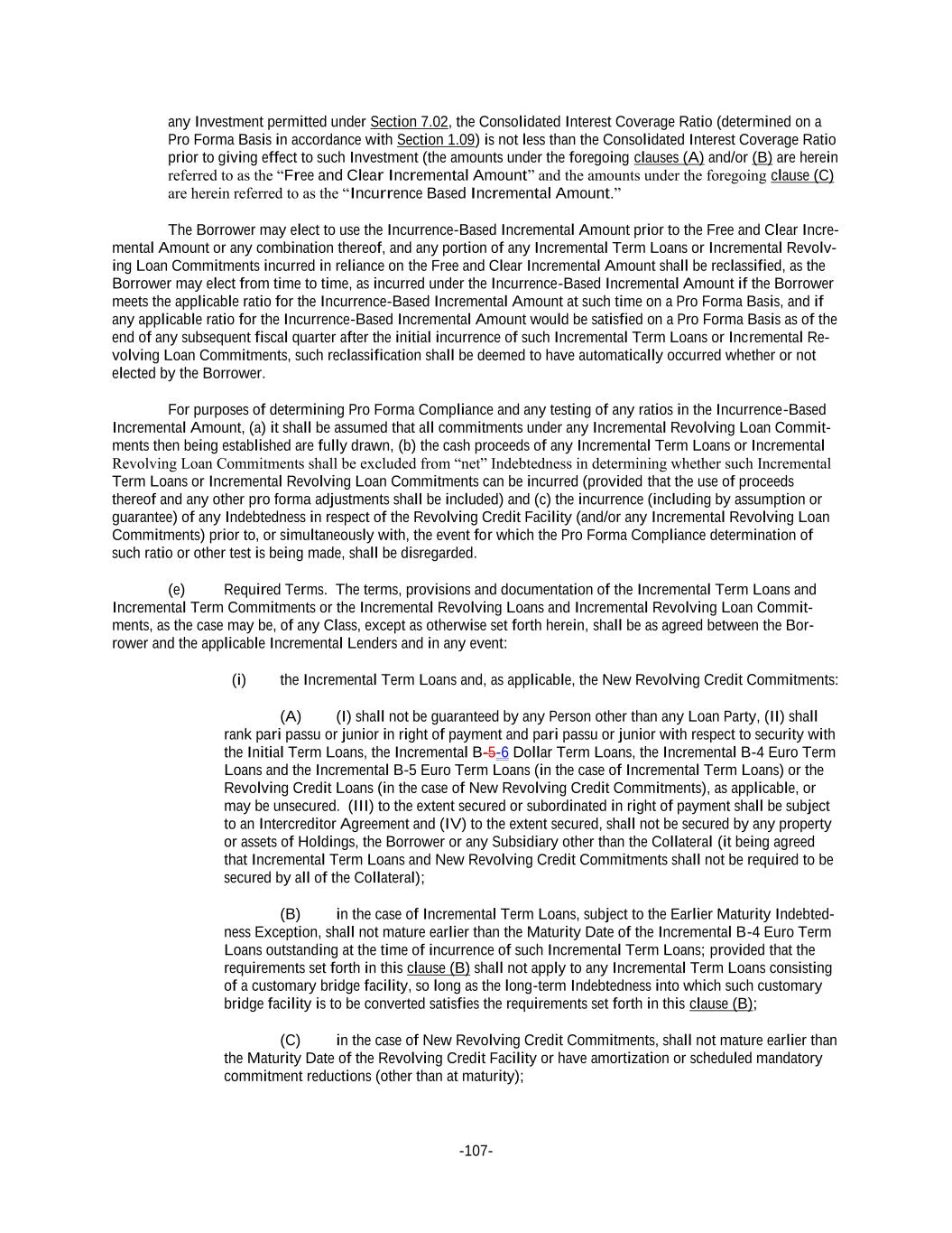 -107- any Investment permitted under Section 7.02, the Consolidated Interest Coverage Ratio (determined on a Pro Forma Basis in accordance with Section 1.09) is not less than the Consolidated Interest Coverage Ratio prior to giving effect to such Investment (the amounts under the foregoing clauses (A) and/or (B) are herein referred to as the “Free and Clear Incremental Amount” and the amounts under the foregoing clause (C) are herein referred to as the “Incurrence Based Incremental Amount.” The Borrower may elect to use the Incurrence-Based Incremental Amount prior to the Free and Clear Incre- mental Amount or any combination thereof, and any portion of any Incremental Term Loans or Incremental Revolv- ing Loan Commitments incurred in reliance on the Free and Clear Incremental Amount shall be reclassified, as the Borrower may elect from time to time, as incurred under the Incurrence-Based Incremental Amount if the Borrower meets the applicable ratio for the Incurrence-Based Incremental Amount at such time on a Pro Forma Basis, and if any applicable ratio for the Incurrence-Based Incremental Amount would be satisfied on a Pro Forma Basis as of the end of any subsequent fiscal quarter after the initial incurrence of such Incremental Term Loans or Incremental Re- volving Loan Commitments, such reclassification shall be deemed to have automatically occurred whether or not elected by the Borrower. For purposes of determining Pro Forma Compliance and any testing of any ratios in the Incurrence-Based Incremental Amount, (a) it shall be assumed that all commitments under any Incremental Revolving Loan Commit- ments then being established are fully drawn, (b) the cash proceeds of any Incremental Term Loans or Incremental Revolving Loan Commitments shall be excluded from “net” Indebtedness in determining whether such Incremental Term Loans or Incremental Revolving Loan Commitments can be incurred (provided that the use of proceeds thereof and any other pro forma adjustments shall be included) and (c) the incurrence (including by assumption or guarantee) of any Indebtedness in respect of the Revolving Credit Facility (and/or any Incremental Revolving Loan Commitments) prior to, or simultaneously with, the event for which the Pro Forma Compliance determination of such ratio or other test is being made, shall be disregarded. (e) Required Terms. The terms, provisions and documentation of the Incremental Term Loans and Incremental Term Commitments or the Incremental Revolving Loans and Incremental Revolving Loan Commit- ments, as the case may be, of any Class, except as otherwise set forth herein, shall be as agreed between the Bor- rower and the applicable Incremental Lenders and in any event: (i) the Incremental Term Loans and, as applicable, the New Revolving Credit Commitments: (A) (I) shall not be guaranteed by any Person other than any Loan Party, (II) shall rank pari passu or junior in right of payment and pari passu or junior with respect to security with the Initial Term Loans, the Incremental B-5-6 Dollar Term Loans, the Incremental B-4 Euro Term Loans and the Incremental B-5 Euro Term Loans (in the case of Incremental Term Loans) or the Revolving Credit Loans (in the case of New Revolving Credit Commitments), as applicable, or may be unsecured. (III) to the extent secured or subordinated in right of payment shall be subject to an Intercreditor Agreement and (IV) to the extent secured, shall not be secured by any property or assets of Holdings, the Borrower or any Subsidiary other than the Collateral (it being agreed that Incremental Term Loans and New Revolving Credit Commitments shall not be required to be secured by all of the Collateral); (B) in the case of Incremental Term Loans, subject to the Earlier Maturity Indebted- ness Exception, shall not mature earlier than the Maturity Date of the Incremental B-4 Euro Term Loans outstanding at the time of incurrence of such Incremental Term Loans; provided that the requirements set forth in this clause (B) shall not apply to any Incremental Term Loans consisting of a customary bridge facility, so long as the long-term Indebtedness into which such customary bridge facility is to be converted satisfies the requirements set forth in this clause (B); (C) in the case of New Revolving Credit Commitments, shall not mature earlier than the Maturity Date of the Revolving Credit Facility or have amortization or scheduled mandatory commitment reductions (other than at maturity);