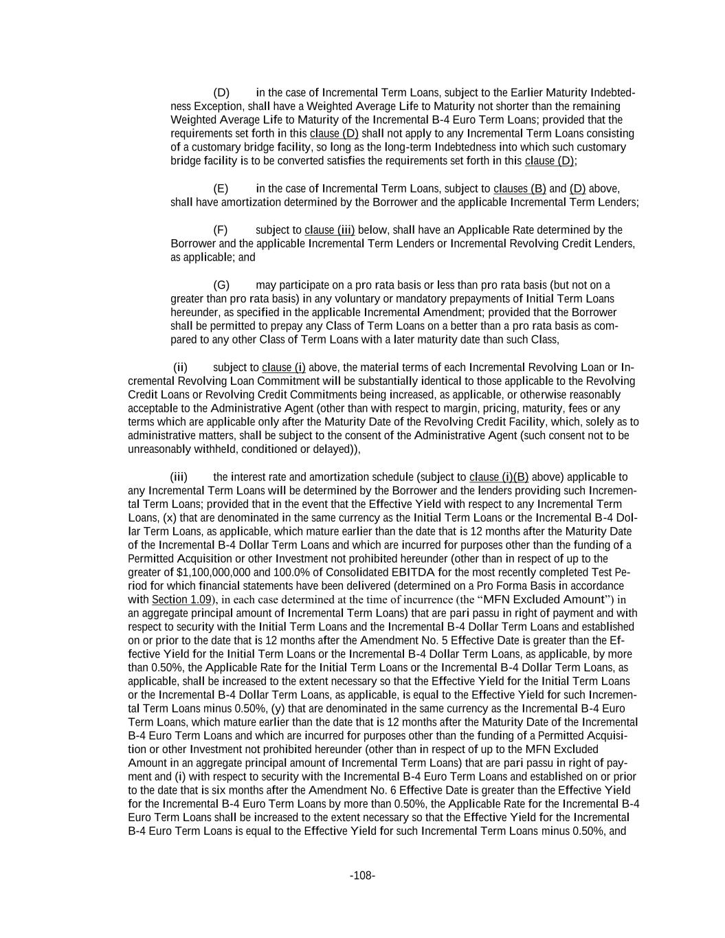 -108- (D) in the case of Incremental Term Loans, subject to the Earlier Maturity Indebted- ness Exception, shall have a Weighted Average Life to Maturity not shorter than the remaining Weighted Average Life to Maturity of the Incremental B-4 Euro Term Loans; provided that the requirements set forth in this clause (D) shall not apply to any Incremental Term Loans consisting of a customary bridge facility, so long as the long-term Indebtedness into which such customary bridge facility is to be converted satisfies the requirements set forth in this clause (D); (E) in the case of Incremental Term Loans, subject to clauses (B) and (D) above, shall have amortization determined by the Borrower and the applicable Incremental Term Lenders; (F) subject to clause (iii) below, shall have an Applicable Rate determined by the Borrower and the applicable Incremental Term Lenders or Incremental Revolving Credit Lenders, as applicable; and (G) may participate on a pro rata basis or less than pro rata basis (but not on a greater than pro rata basis) in any voluntary or mandatory prepayments of Initial Term Loans hereunder, as specified in the applicable Incremental Amendment; provided that the Borrower shall be permitted to prepay any Class of Term Loans on a better than a pro rata basis as com- pared to any other Class of Term Loans with a later maturity date than such Class, (ii) subject to clause (i) above, the material terms of each Incremental Revolving Loan or In- cremental Revolving Loan Commitment will be substantially identical to those applicable to the Revolving Credit Loans or Revolving Credit Commitments being increased, as applicable, or otherwise reasonably acceptable to the Administrative Agent (other than with respect to margin, pricing, maturity, fees or any terms which are applicable only after the Maturity Date of the Revolving Credit Facility, which, solely as to administrative matters, shall be subject to the consent of the Administrative Agent (such consent not to be unreasonably withheld, conditioned or delayed)), (iii) the interest rate and amortization schedule (subject to clause (i)(B) above) applicable to any Incremental Term Loans will be determined by the Borrower and the lenders providing such Incremen- tal Term Loans; provided that in the event that the Effective Yield with respect to any Incremental Term Loans, (x) that are denominated in the same currency as the Initial Term Loans or the Incremental B-4 Dol- lar Term Loans, as applicable, which mature earlier than the date that is 12 months after the Maturity Date of the Incremental B-4 Dollar Term Loans and which are incurred for purposes other than the funding of a Permitted Acquisition or other Investment not prohibited hereunder (other than in respect of up to the greater of $1,100,000,000 and 100.0% of Consolidated EBITDA for the most recently completed Test Pe- riod for which financial statements have been delivered (determined on a Pro Forma Basis in accordance with Section 1.09), in each case determined at the time of incurrence (the “MFN Excluded Amount”) in an aggregate principal amount of Incremental Term Loans) that are pari passu in right of payment and with respect to security with the Initial Term Loans and the Incremental B-4 Dollar Term Loans and established on or prior to the date that is 12 months after the Amendment No. 5 Effective Date is greater than the Ef- fective Yield for the Initial Term Loans or the Incremental B-4 Dollar Term Loans, as applicable, by more than 0.50%, the Applicable Rate for the Initial Term Loans or the Incremental B-4 Dollar Term Loans, as applicable, shall be increased to the extent necessary so that the Effective Yield for the Initial Term Loans or the Incremental B-4 Dollar Term Loans, as applicable, is equal to the Effective Yield for such Incremen- tal Term Loans minus 0.50%, (y) that are denominated in the same currency as the Incremental B-4 Euro Term Loans, which mature earlier than the date that is 12 months after the Maturity Date of the Incremental B-4 Euro Term Loans and which are incurred for purposes other than the funding of a Permitted Acquisi- tion or other Investment not prohibited hereunder (other than in respect of up to the MFN Excluded Amount in an aggregate principal amount of Incremental Term Loans) that are pari passu in right of pay- ment and (i) with respect to security with the Incremental B-4 Euro Term Loans and established on or prior to the date that is six months after the Amendment No. 6 Effective Date is greater than the Effective Yield for the Incremental B-4 Euro Term Loans by more than 0.50%, the Applicable Rate for the Incremental B-4 Euro Term Loans shall be increased to the extent necessary so that the Effective Yield for the Incremental B-4 Euro Term Loans is equal to the Effective Yield for such Incremental Term Loans minus 0.50%, and