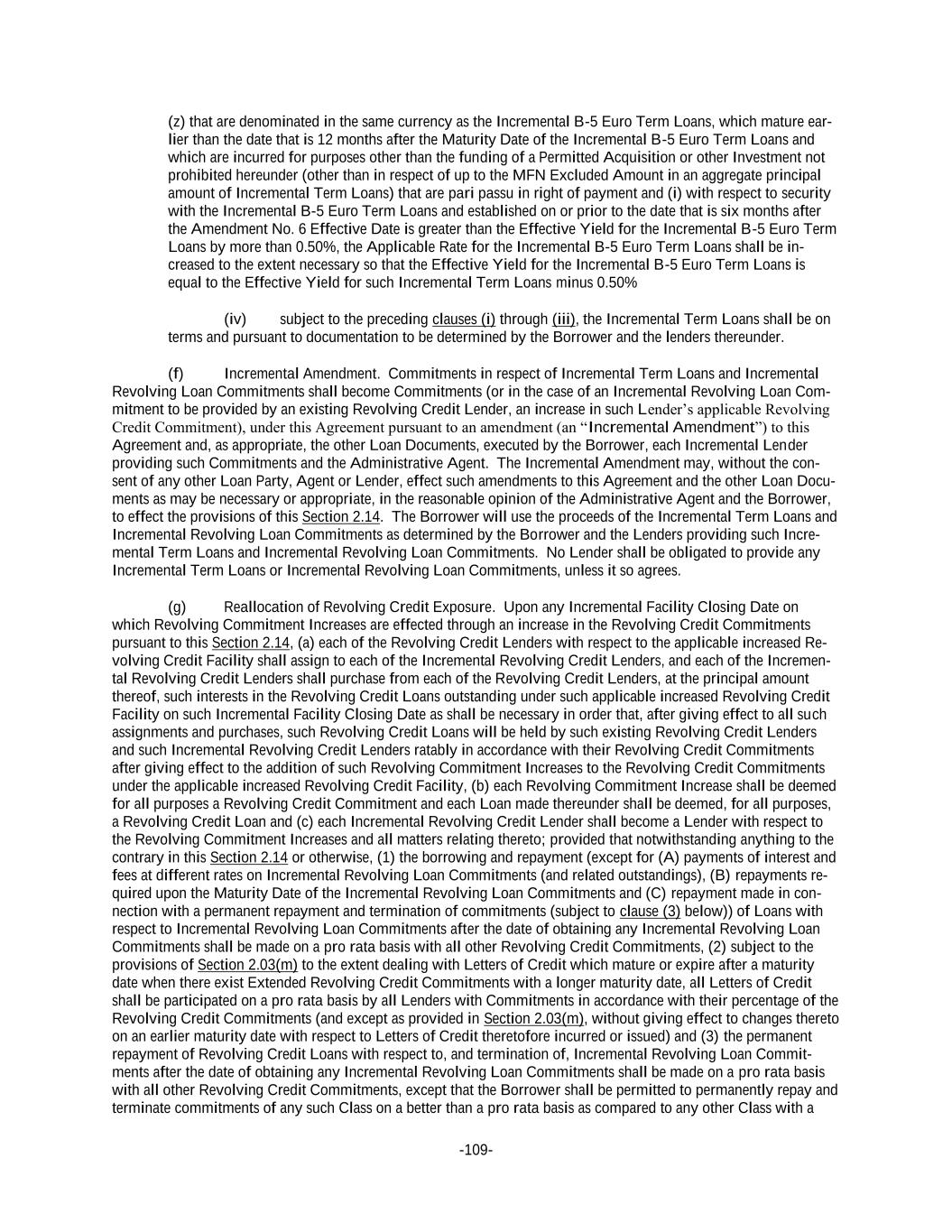 -109- (z) that are denominated in the same currency as the Incremental B-5 Euro Term Loans, which mature ear- lier than the date that is 12 months after the Maturity Date of the Incremental B-5 Euro Term Loans and which are incurred for purposes other than the funding of a Permitted Acquisition or other Investment not prohibited hereunder (other than in respect of up to the MFN Excluded Amount in an aggregate principal amount of Incremental Term Loans) that are pari passu in right of payment and (i) with respect to security with the Incremental B-5 Euro Term Loans and established on or prior to the date that is six months after the Amendment No. 6 Effective Date is greater than the Effective Yield for the Incremental B-5 Euro Term Loans by more than 0.50%, the Applicable Rate for the Incremental B-5 Euro Term Loans shall be in- creased to the extent necessary so that the Effective Yield for the Incremental B-5 Euro Term Loans is equal to the Effective Yield for such Incremental Term Loans minus 0.50% (iv) subject to the preceding clauses (i) through (iii), the Incremental Term Loans shall be on terms and pursuant to documentation to be determined by the Borrower and the lenders thereunder. (f) Incremental Amendment. Commitments in respect of Incremental Term Loans and Incremental Revolving Loan Commitments shall become Commitments (or in the case of an Incremental Revolving Loan Com- mitment to be provided by an existing Revolving Credit Lender, an increase in such Lender’s applicable Revolving Credit Commitment), under this Agreement pursuant to an amendment (an “Incremental Amendment”) to this Agreement and, as appropriate, the other Loan Documents, executed by the Borrower, each Incremental Lender providing such Commitments and the Administrative Agent. The Incremental Amendment may, without the con- sent of any other Loan Party, Agent or Lender, effect such amendments to this Agreement and the other Loan Docu- ments as may be necessary or appropriate, in the reasonable opinion of the Administrative Agent and the Borrower, to effect the provisions of this Section 2.14. The Borrower will use the proceeds of the Incremental Term Loans and Incremental Revolving Loan Commitments as determined by the Borrower and the Lenders providing such Incre- mental Term Loans and Incremental Revolving Loan Commitments. No Lender shall be obligated to provide any Incremental Term Loans or Incremental Revolving Loan Commitments, unless it so agrees. (g) Reallocation of Revolving Credit Exposure. Upon any Incremental Facility Closing Date on which Revolving Commitment Increases are effected through an increase in the Revolving Credit Commitments pursuant to this Section 2.14, (a) each of the Revolving Credit Lenders with respect to the applicable increased Re- volving Credit Facility shall assign to each of the Incremental Revolving Credit Lenders, and each of the Incremen- tal Revolving Credit Lenders shall purchase from each of the Revolving Credit Lenders, at the principal amount thereof, such interests in the Revolving Credit Loans outstanding under such applicable increased Revolving Credit Facility on such Incremental Facility Closing Date as shall be necessary in order that, after giving effect to all such assignments and purchases, such Revolving Credit Loans will be held by such existing Revolving Credit Lenders and such Incremental Revolving Credit Lenders ratably in accordance with their Revolving Credit Commitments after giving effect to the addition of such Revolving Commitment Increases to the Revolving Credit Commitments under the applicable increased Revolving Credit Facility, (b) each Revolving Commitment Increase shall be deemed for all purposes a Revolving Credit Commitment and each Loan made thereunder shall be deemed, for all purposes, a Revolving Credit Loan and (c) each Incremental Revolving Credit Lender shall become a Lender with respect to the Revolving Commitment Increases and all matters relating thereto; provided that notwithstanding anything to the contrary in this Section 2.14 or otherwise, (1) the borrowing and repayment (except for (A) payments of interest and fees at different rates on Incremental Revolving Loan Commitments (and related outstandings), (B) repayments re- quired upon the Maturity Date of the Incremental Revolving Loan Commitments and (C) repayment made in con- nection with a permanent repayment and termination of commitments (subject to clause (3) below)) of Loans with respect to Incremental Revolving Loan Commitments after the date of obtaining any Incremental Revolving Loan Commitments shall be made on a pro rata basis with all other Revolving Credit Commitments, (2) subject to the provisions of Section 2.03(m) to the extent dealing with Letters of Credit which mature or expire after a maturity date when there exist Extended Revolving Credit Commitments with a longer maturity date, all Letters of Credit shall be participated on a pro rata basis by all Lenders with Commitments in accordance with their percentage of the Revolving Credit Commitments (and except as provided in Section 2.03(m), without giving effect to changes thereto on an earlier maturity date with respect to Letters of Credit theretofore incurred or issued) and (3) the permanent repayment of Revolving Credit Loans with respect to, and termination of, Incremental Revolving Loan Commit- ments after the date of obtaining any Incremental Revolving Loan Commitments shall be made on a pro rata basis with all other Revolving Credit Commitments, except that the Borrower shall be permitted to permanently repay and terminate commitments of any such Class on a better than a pro rata basis as compared to any other Class with a