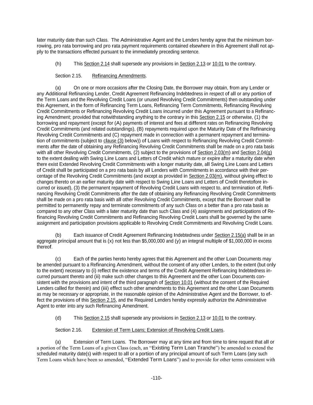 -110- later maturity date than such Class. The Administrative Agent and the Lenders hereby agree that the minimum bor- rowing, pro rata borrowing and pro rata payment requirements contained elsewhere in this Agreement shall not ap- ply to the transactions effected pursuant to the immediately preceding sentence. (h) This Section 2.14 shall supersede any provisions in Section 2.13 or 10.01 to the contrary. Section 2.15. Refinancing Amendments. (a) On one or more occasions after the Closing Date, the Borrower may obtain, from any Lender or any Additional Refinancing Lender, Credit Agreement Refinancing Indebtedness in respect of all or any portion of the Term Loans and the Revolving Credit Loans (or unused Revolving Credit Commitments) then outstanding under this Agreement, in the form of Refinancing Term Loans, Refinancing Term Commitments, Refinancing Revolving Credit Commitments or Refinancing Revolving Credit Loans incurred under this Agreement pursuant to a Refinanc- ing Amendment; provided that notwithstanding anything to the contrary in this Section 2.15 or otherwise, (1) the borrowing and repayment (except for (A) payments of interest and fees at different rates on Refinancing Revolving Credit Commitments (and related outstandings), (B) repayments required upon the Maturity Date of the Refinancing Revolving Credit Commitments and (C) repayment made in connection with a permanent repayment and termina- tion of commitments (subject to clause (3) below)) of Loans with respect to Refinancing Revolving Credit Commit- ments after the date of obtaining any Refinancing Revolving Credit Commitments shall be made on a pro rata basis with all other Revolving Credit Commitments, (2) subject to the provisions of Section 2.03(m) and Section 2.04(g) to the extent dealing with Swing Line Loans and Letters of Credit which mature or expire after a maturity date when there exist Extended Revolving Credit Commitments with a longer maturity date, all Swing Line Loans and Letters of Credit shall be participated on a pro rata basis by all Lenders with Commitments in accordance with their per- centage of the Revolving Credit Commitments (and except as provided in Section 2.03(m), without giving effect to changes thereto on an earlier maturity date with respect to Swing Line Loans and Letters of Credit theretofore in- curred or issued), (3) the permanent repayment of Revolving Credit Loans with respect to, and termination of, Refi- nancing Revolving Credit Commitments after the date of obtaining any Refinancing Revolving Credit Commitments shall be made on a pro rata basis with all other Revolving Credit Commitments, except that the Borrower shall be permitted to permanently repay and terminate commitments of any such Class on a better than a pro rata basis as compared to any other Class with a later maturity date than such Class and (4) assignments and participations of Re- financing Revolving Credit Commitments and Refinancing Revolving Credit Loans shall be governed by the same assignment and participation provisions applicable to Revolving Credit Commitments and Revolving Credit Loans. (b) Each issuance of Credit Agreement Refinancing Indebtedness under Section 2.15(a) shall be in an aggregate principal amount that is (x) not less than $5,000,000 and (y) an integral multiple of $1,000,000 in excess thereof. (c) Each of the parties hereto hereby agrees that this Agreement and the other Loan Documents may be amended pursuant to a Refinancing Amendment, without the consent of any other Lenders, to the extent (but only to the extent) necessary to (i) reflect the existence and terms of the Credit Agreement Refinancing Indebtedness in- curred pursuant thereto and (ii) make such other changes to this Agreement and the other Loan Documents con- sistent with the provisions and intent of the third paragraph of Section 10.01 (without the consent of the Required Lenders called for therein) and (iii) effect such other amendments to this Agreement and the other Loan Documents as may be necessary or appropriate, in the reasonable opinion of the Administrative Agent and the Borrower, to ef- fect the provisions of this Section 2.15, and the Required Lenders hereby expressly authorize the Administrative Agent to enter into any such Refinancing Amendment. (d) This Section 2.15 shall supersede any provisions in Section 2.13 or 10.01 to the contrary. Section 2.16. Extension of Term Loans; Extension of Revolving Credit Loans. (a) Extension of Term Loans. The Borrower may at any time and from time to time request that all or a portion of the Term Loans of a given Class (each, an “Existing Term Loan Tranche”) be amended to extend the scheduled maturity date(s) with respect to all or a portion of any principal amount of such Term Loans (any such Term Loans which have been so amended, “Extended Term Loans”) and to provide for other terms consistent with