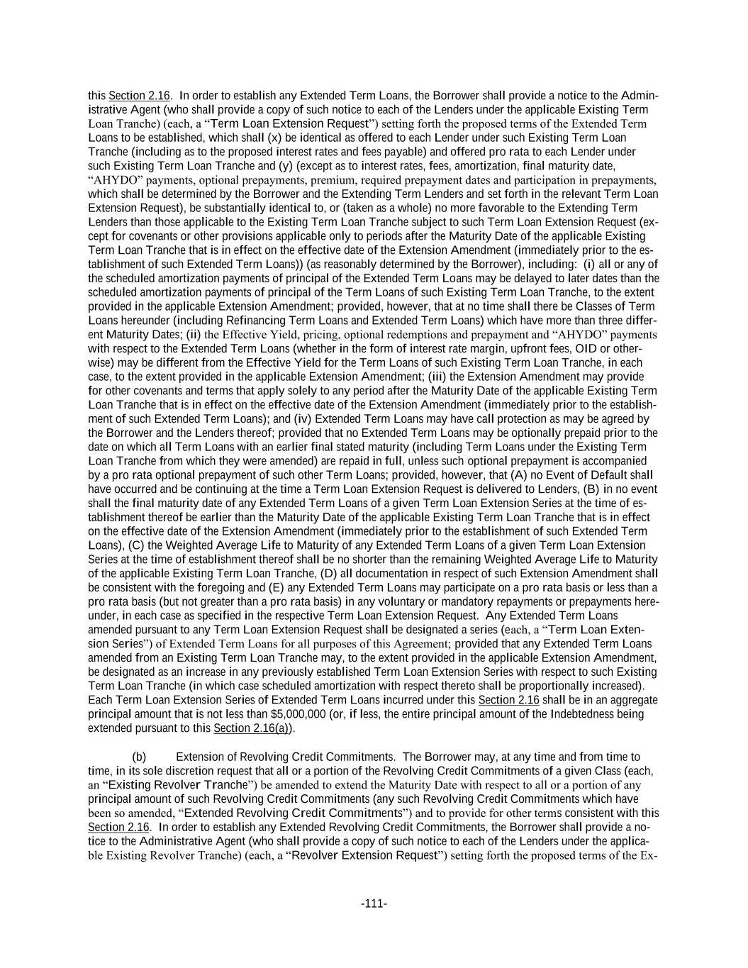 -111- this Section 2.16. In order to establish any Extended Term Loans, the Borrower shall provide a notice to the Admin- istrative Agent (who shall provide a copy of such notice to each of the Lenders under the applicable Existing Term Loan Tranche) (each, a “Term Loan Extension Request”) setting forth the proposed terms of the Extended Term Loans to be established, which shall (x) be identical as offered to each Lender under such Existing Term Loan Tranche (including as to the proposed interest rates and fees payable) and offered pro rata to each Lender under such Existing Term Loan Tranche and (y) (except as to interest rates, fees, amortization, final maturity date, “AHYDO” payments, optional prepayments, premium, required prepayment dates and participation in prepayments, which shall be determined by the Borrower and the Extending Term Lenders and set forth in the relevant Term Loan Extension Request), be substantially identical to, or (taken as a whole) no more favorable to the Extending Term Lenders than those applicable to the Existing Term Loan Tranche subject to such Term Loan Extension Request (ex- cept for covenants or other provisions applicable only to periods after the Maturity Date of the applicable Existing Term Loan Tranche that is in effect on the effective date of the Extension Amendment (immediately prior to the es- tablishment of such Extended Term Loans)) (as reasonably determined by the Borrower), including: (i) all or any of the scheduled amortization payments of principal of the Extended Term Loans may be delayed to later dates than the scheduled amortization payments of principal of the Term Loans of such Existing Term Loan Tranche, to the extent provided in the applicable Extension Amendment; provided, however, that at no time shall there be Classes of Term Loans hereunder (including Refinancing Term Loans and Extended Term Loans) which have more than three differ- ent Maturity Dates; (ii) the Effective Yield, pricing, optional redemptions and prepayment and “AHYDO” payments with respect to the Extended Term Loans (whether in the form of interest rate margin, upfront fees, OID or other- wise) may be different from the Effective Yield for the Term Loans of such Existing Term Loan Tranche, in each case, to the extent provided in the applicable Extension Amendment; (iii) the Extension Amendment may provide for other covenants and terms that apply solely to any period after the Maturity Date of the applicable Existing Term Loan Tranche that is in effect on the effective date of the Extension Amendment (immediately prior to the establish- ment of such Extended Term Loans); and (iv) Extended Term Loans may have call protection as may be agreed by the Borrower and the Lenders thereof; provided that no Extended Term Loans may be optionally prepaid prior to the date on which all Term Loans with an earlier final stated maturity (including Term Loans under the Existing Term Loan Tranche from which they were amended) are repaid in full, unless such optional prepayment is accompanied by a pro rata optional prepayment of such other Term Loans; provided, however, that (A) no Event of Default shall have occurred and be continuing at the time a Term Loan Extension Request is delivered to Lenders, (B) in no event shall the final maturity date of any Extended Term Loans of a given Term Loan Extension Series at the time of es- tablishment thereof be earlier than the Maturity Date of the applicable Existing Term Loan Tranche that is in effect on the effective date of the Extension Amendment (immediately prior to the establishment of such Extended Term Loans), (C) the Weighted Average Life to Maturity of any Extended Term Loans of a given Term Loan Extension Series at the time of establishment thereof shall be no shorter than the remaining Weighted Average Life to Maturity of the applicable Existing Term Loan Tranche, (D) all documentation in respect of such Extension Amendment shall be consistent with the foregoing and (E) any Extended Term Loans may participate on a pro rata basis or less than a pro rata basis (but not greater than a pro rata basis) in any voluntary or mandatory repayments or prepayments here- under, in each case as specified in the respective Term Loan Extension Request. Any Extended Term Loans amended pursuant to any Term Loan Extension Request shall be designated a series (each, a “Term Loan Exten- sion Series”) of Extended Term Loans for all purposes of this Agreement; provided that any Extended Term Loans amended from an Existing Term Loan Tranche may, to the extent provided in the applicable Extension Amendment, be designated as an increase in any previously established Term Loan Extension Series with respect to such Existing Term Loan Tranche (in which case scheduled amortization with respect thereto shall be proportionally increased). Each Term Loan Extension Series of Extended Term Loans incurred under this Section 2.16 shall be in an aggregate principal amount that is not less than $5,000,000 (or, if less, the entire principal amount of the Indebtedness being extended pursuant to this Section 2.16(a)). (b) Extension of Revolving Credit Commitments. The Borrower may, at any time and from time to time, in its sole discretion request that all or a portion of the Revolving Credit Commitments of a given Class (each, an “Existing Revolver Tranche”) be amended to extend the Maturity Date with respect to all or a portion of any principal amount of such Revolving Credit Commitments (any such Revolving Credit Commitments which have been so amended, “Extended Revolving Credit Commitments”) and to provide for other terms consistent with this Section 2.16. In order to establish any Extended Revolving Credit Commitments, the Borrower shall provide a no- tice to the Administrative Agent (who shall provide a copy of such notice to each of the Lenders under the applica- ble Existing Revolver Tranche) (each, a “Revolver Extension Request”) set